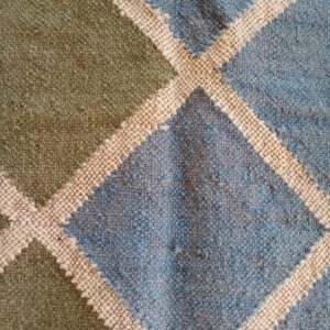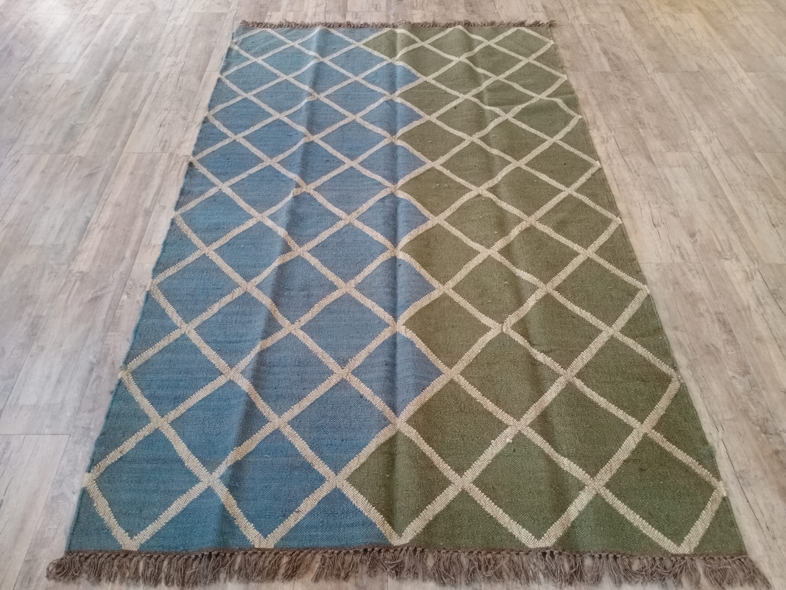 Handwoven Wool Jute Rug: Blue Checkered Geometric Kilim