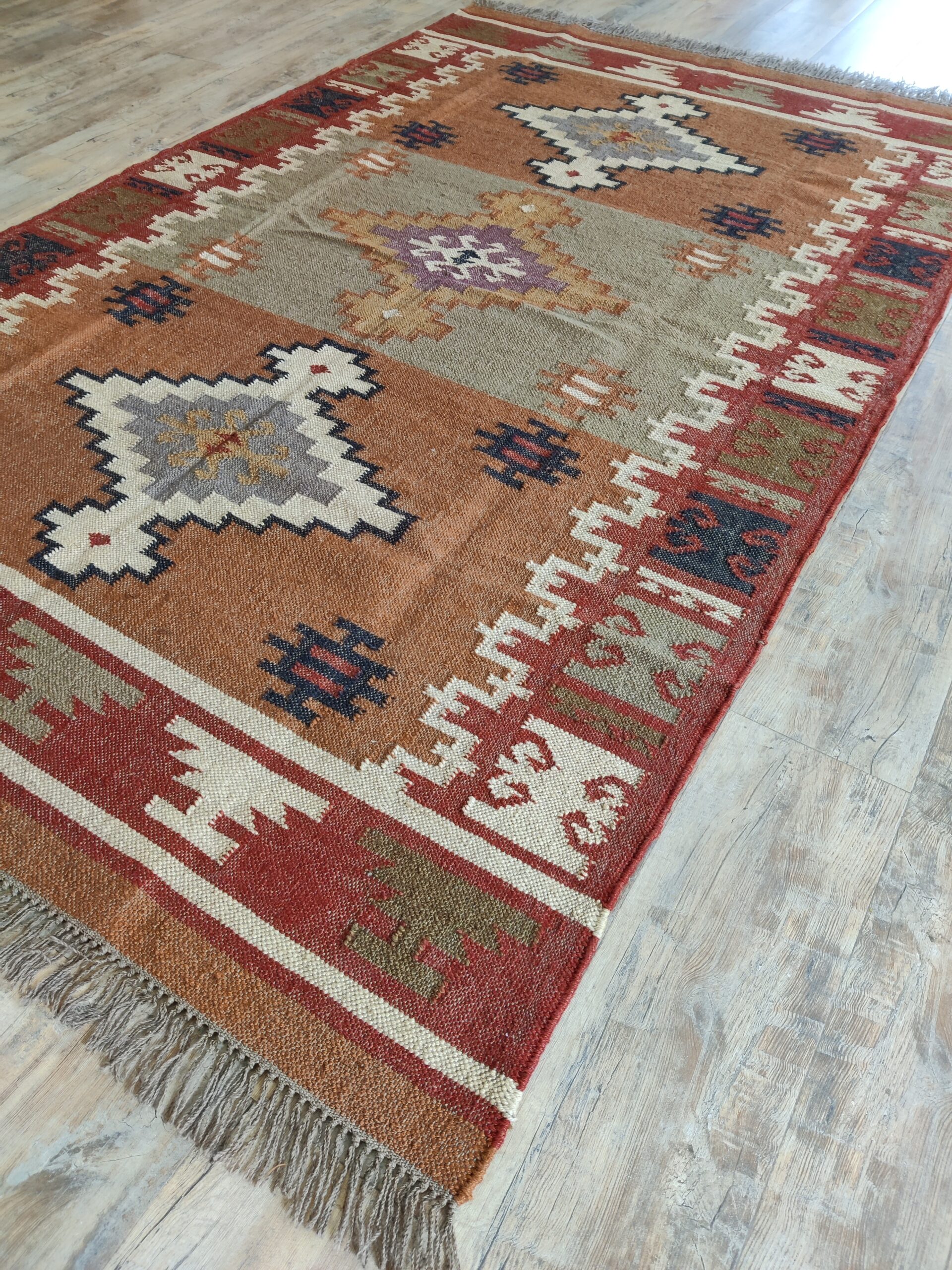 Modern Red And Greeen Wool Jute Geometric Rug, Home And Living Room Rug, Home Decor Rug