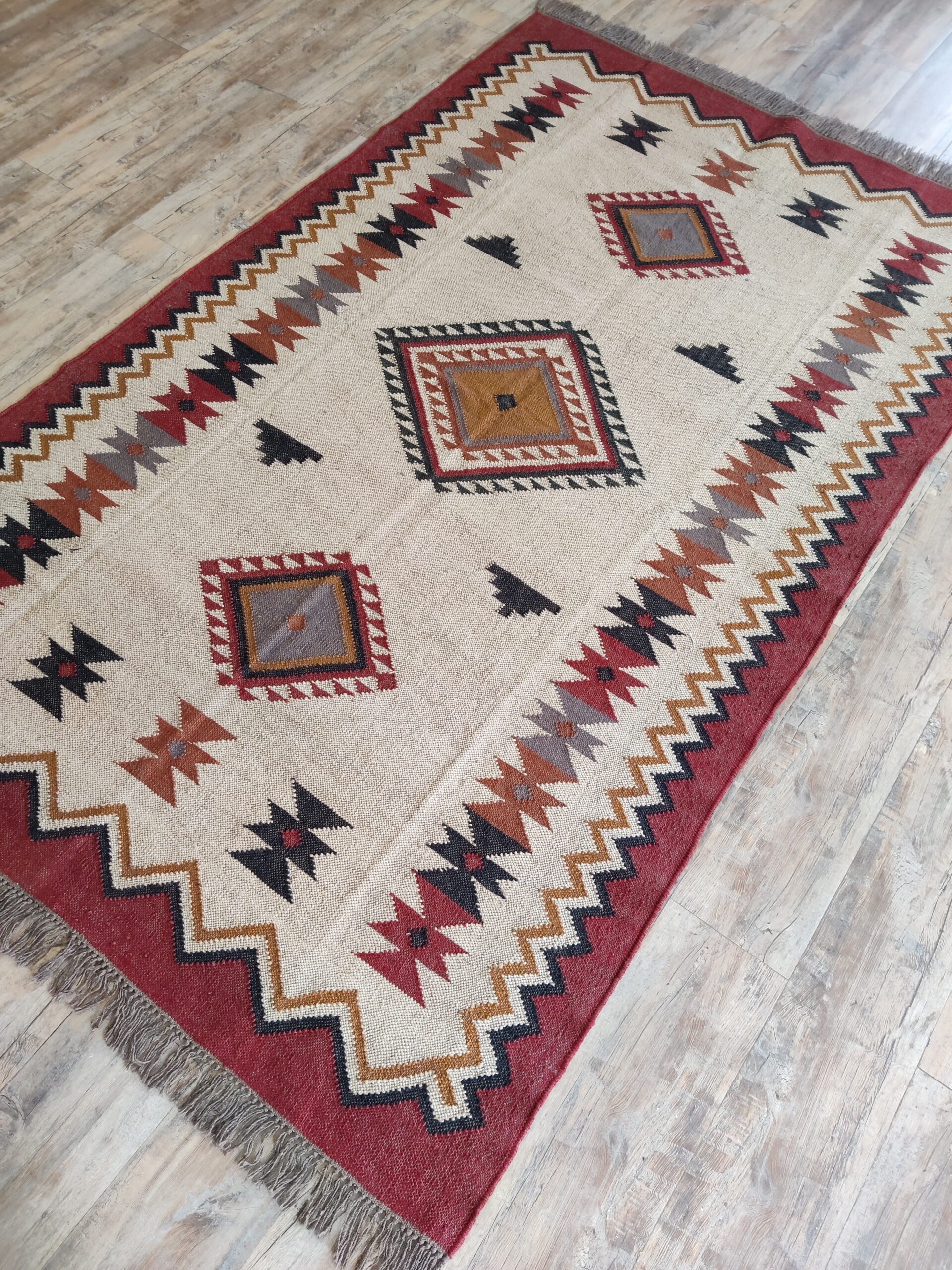 Modern Red And Beige Wool Jute Geometric Rug, Reversible Custom Size Rug, Living Room Rug