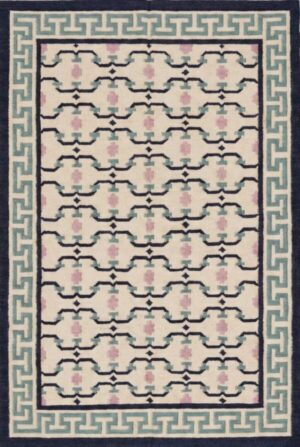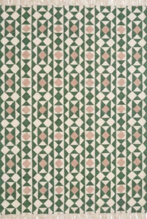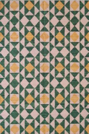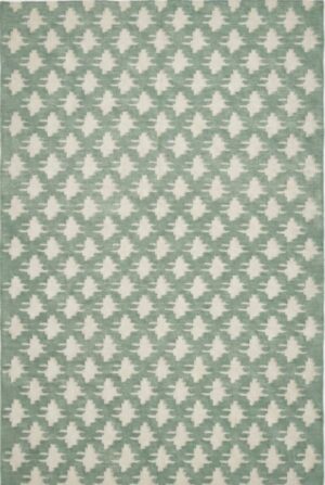 Handmade Cotton Wool Dhurrie Rug: Cream, Green & Navy Geometric Floral 9×12