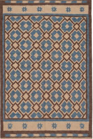 Hamdwoven Cotton Wool Kilim Modern Pattern Design Rug, Blue And Beige Rug, Reversible Rug