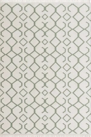 Handwoven Green And Beige Geometric Pattern Designer Rug, Cotton Wool Home Decor Rug