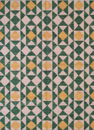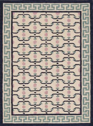 Handmade Cotton Wool Dhurrie Rug: Cream, Green & Navy Geometric Floral 9×12