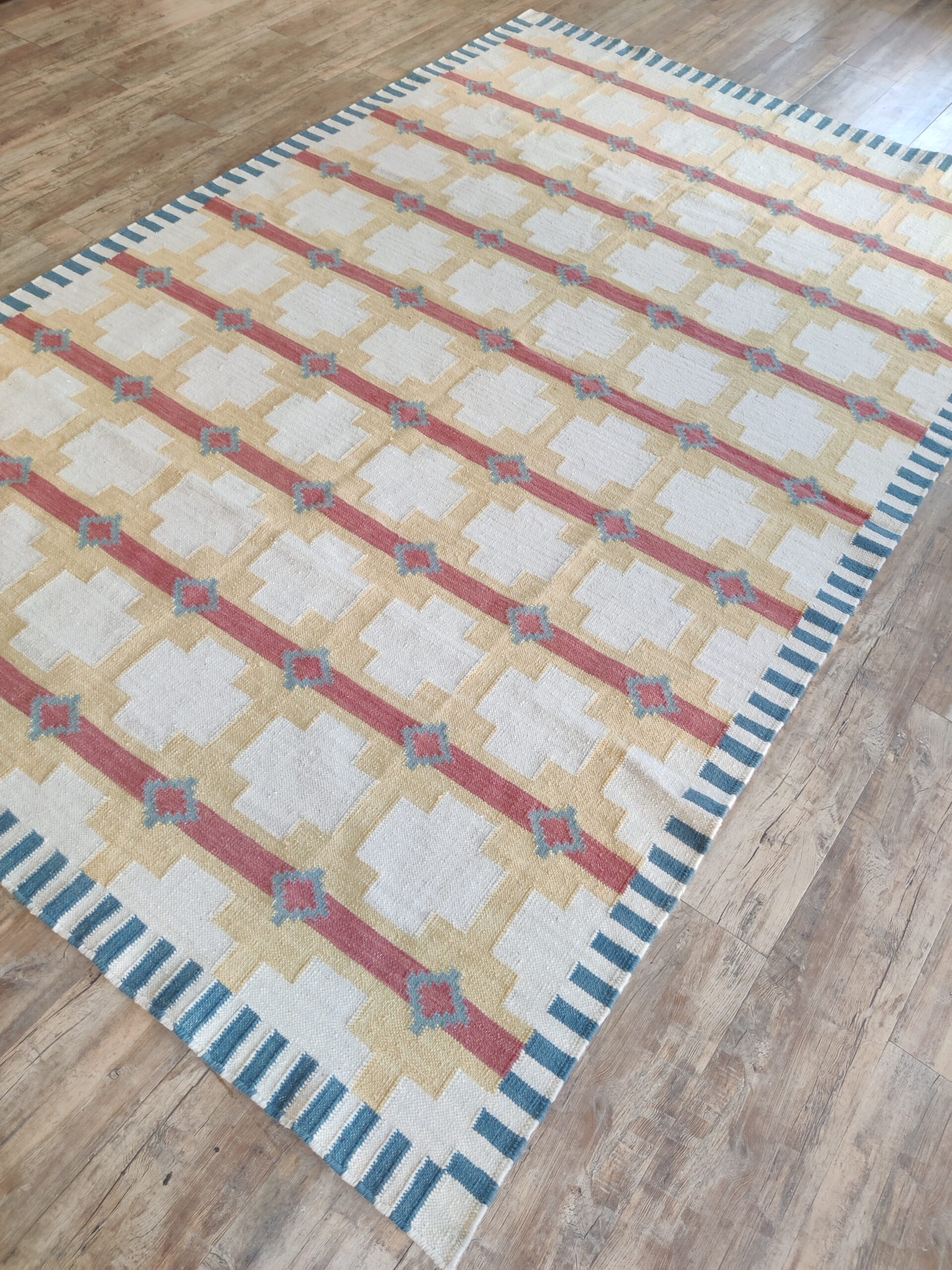 Handmade Cotton Wool Rug, Beige And Yellow Geometric Rug, Blue Strips Wool Kilim Rug