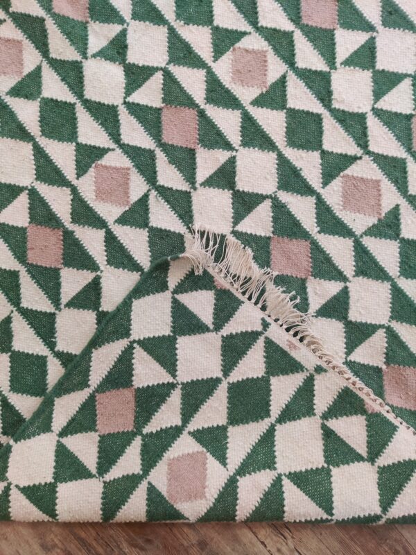 Handmade Cotton Wool Dhurrie Rug: Cream, Green & Navy Geometric Floral 9×12
