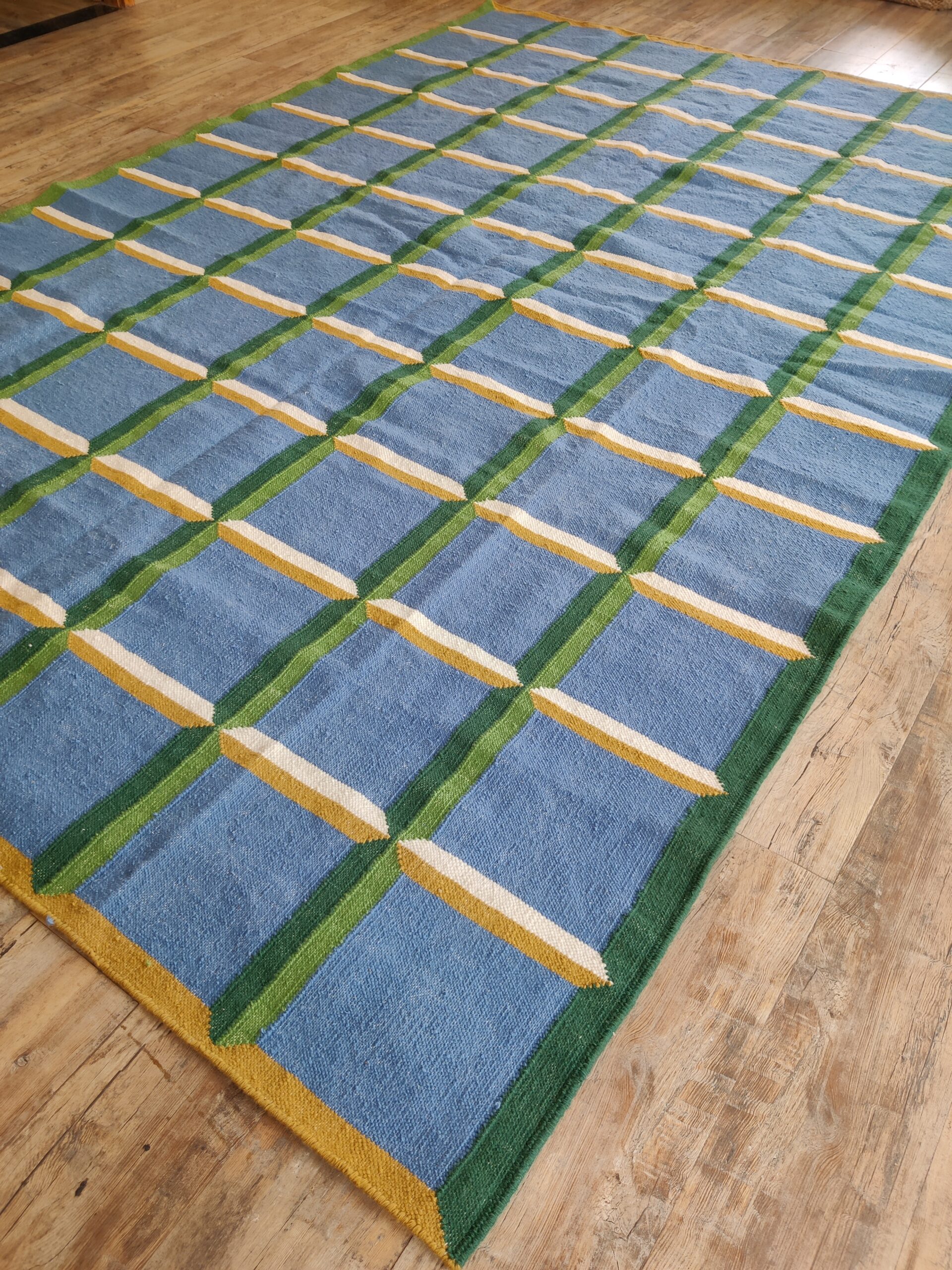 Handwoven Checkered Pattern Green And Blue Home And Living Room Rug, Modern Desinger Rug