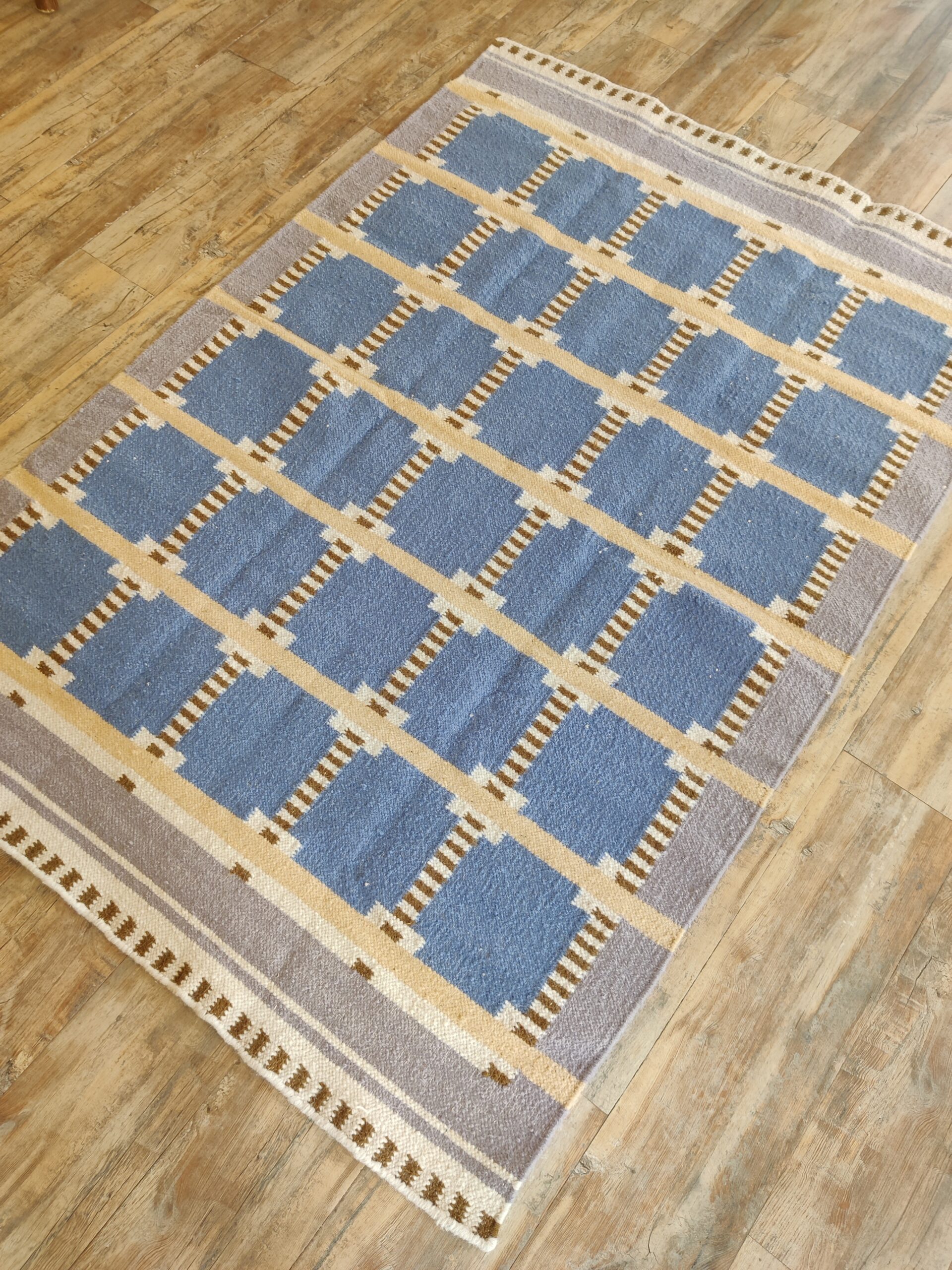 Handwoven Checkered Cotton Wool Rug, Grey And Blue Strips Check Rug, Custom Size Rug