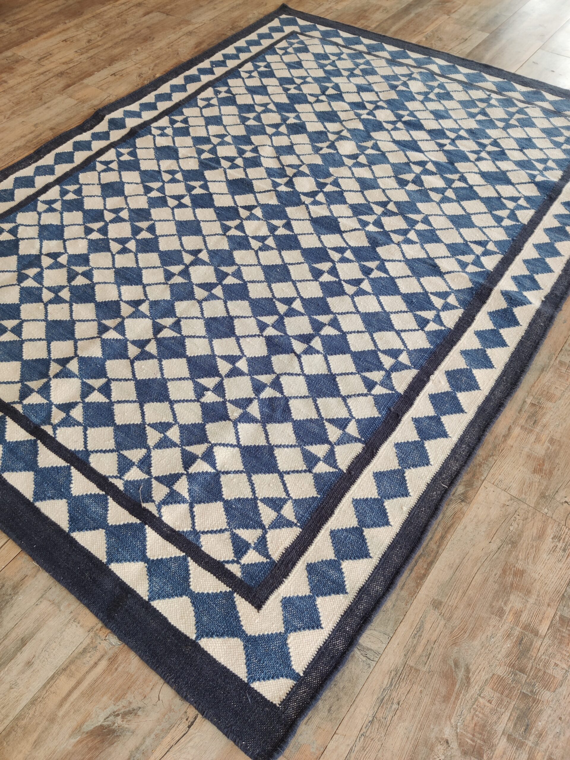 Handwoven Cotton Wool Geometric Pattern Rug, Modern Designer Rug, Blue And White Rug