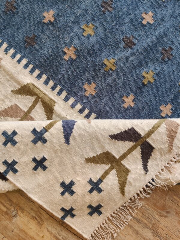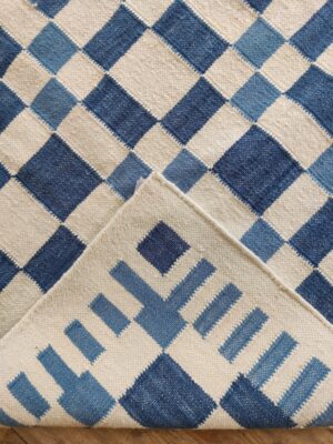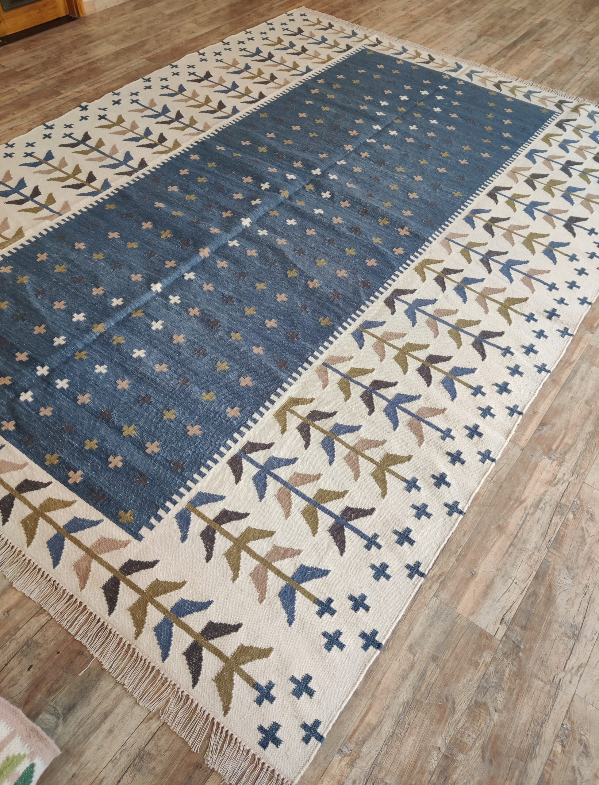 Handwoven Cotton Wool Kilim Rug: Blue White Tribal Boho Decor 9×12