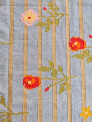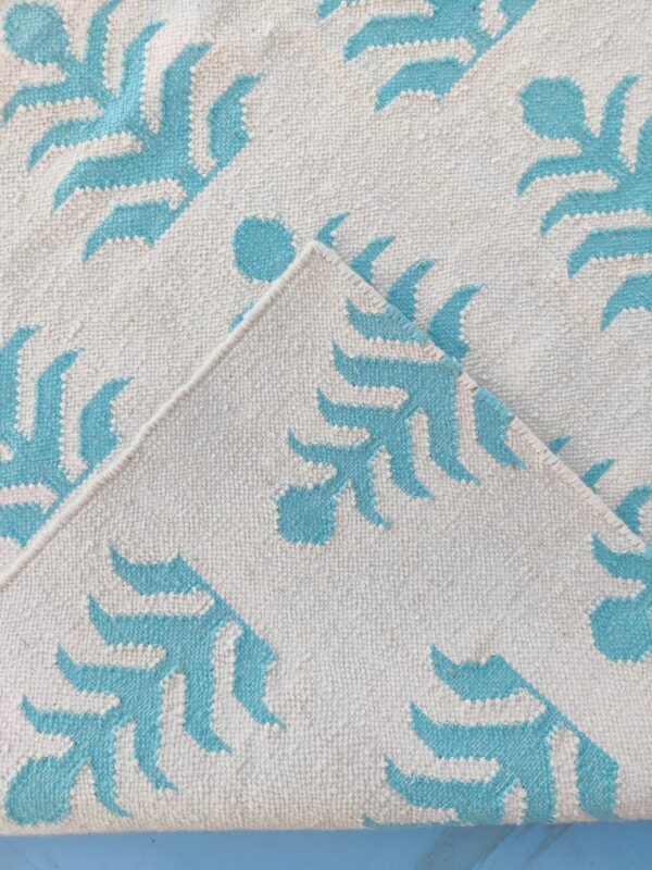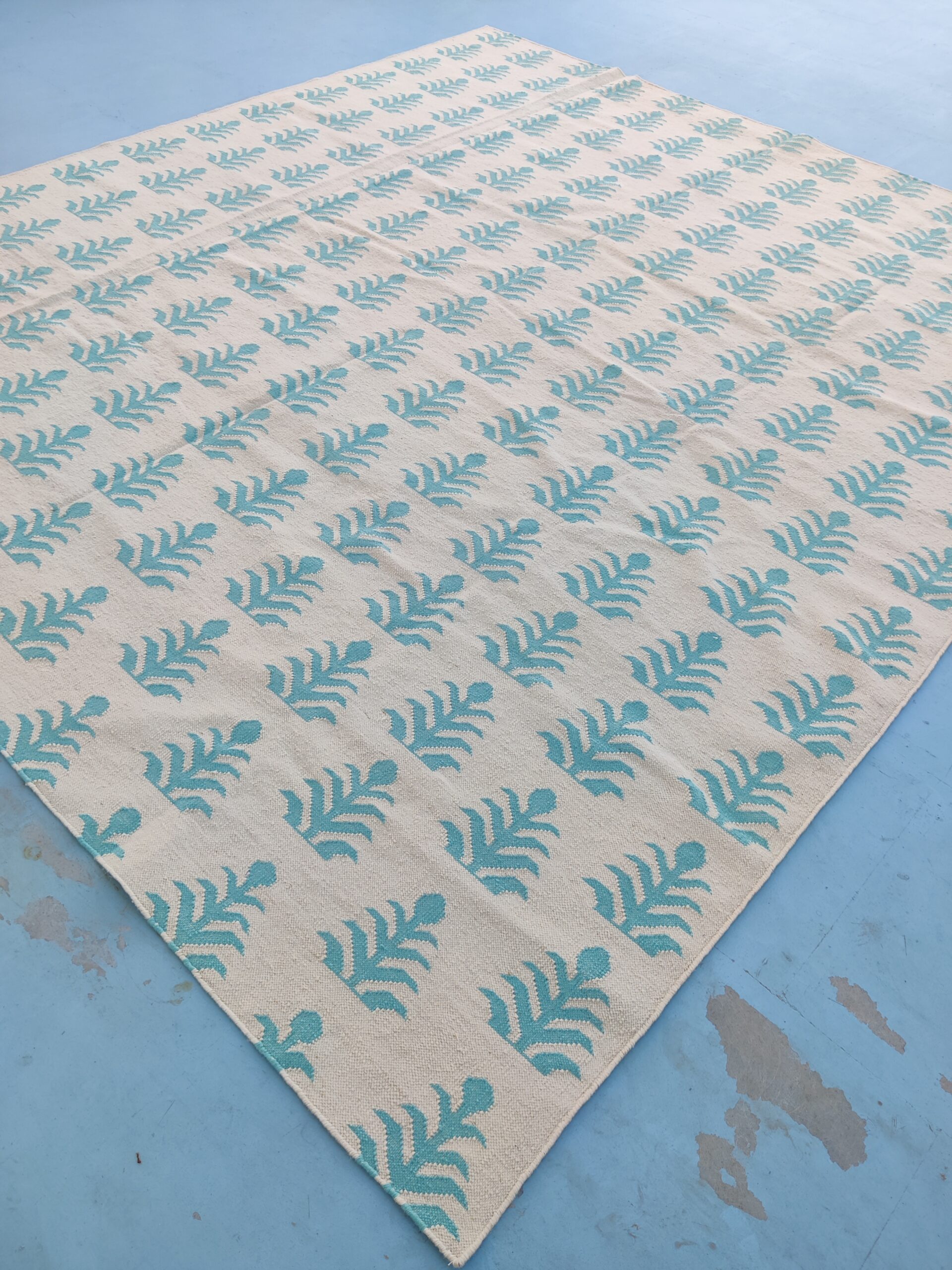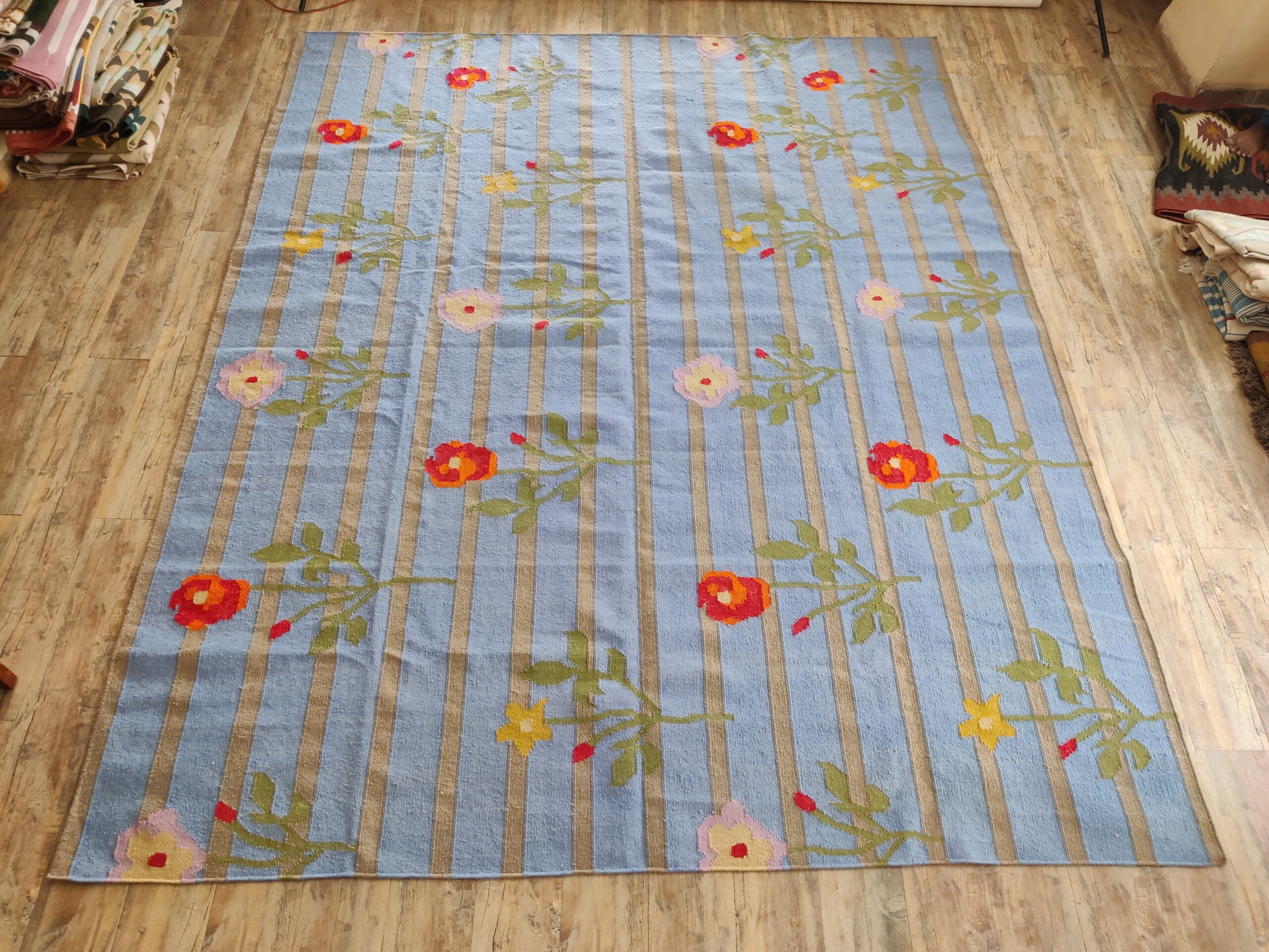 Handwoven Cotton Wool Rug, Beige And Blue Floral Designer Rug, Reversible Custom Size Rug