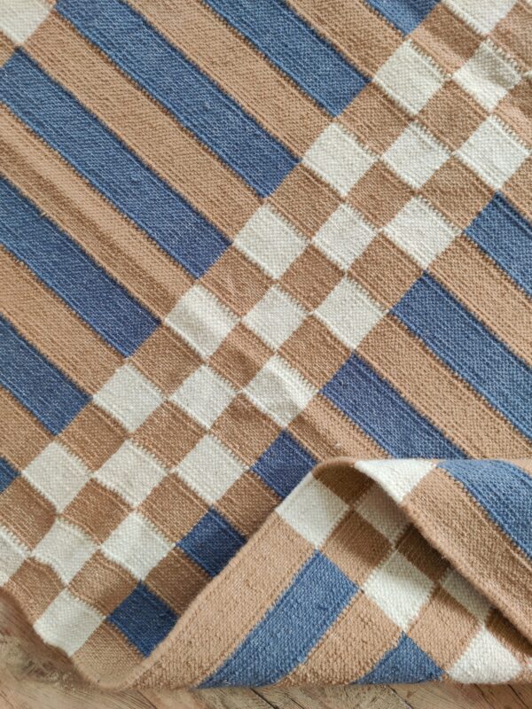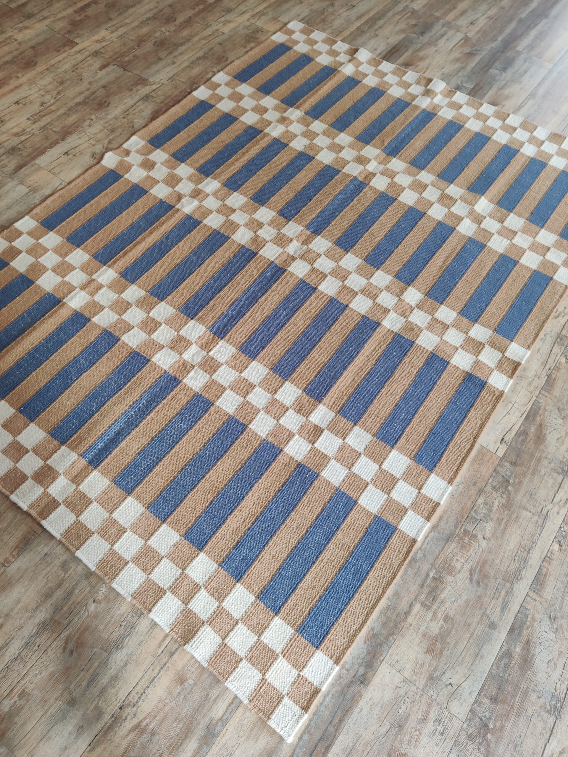 Handwoven Cotton Wool Rug, Brown And Blue White Strips And Checkered Rug, Modern Wool Rug