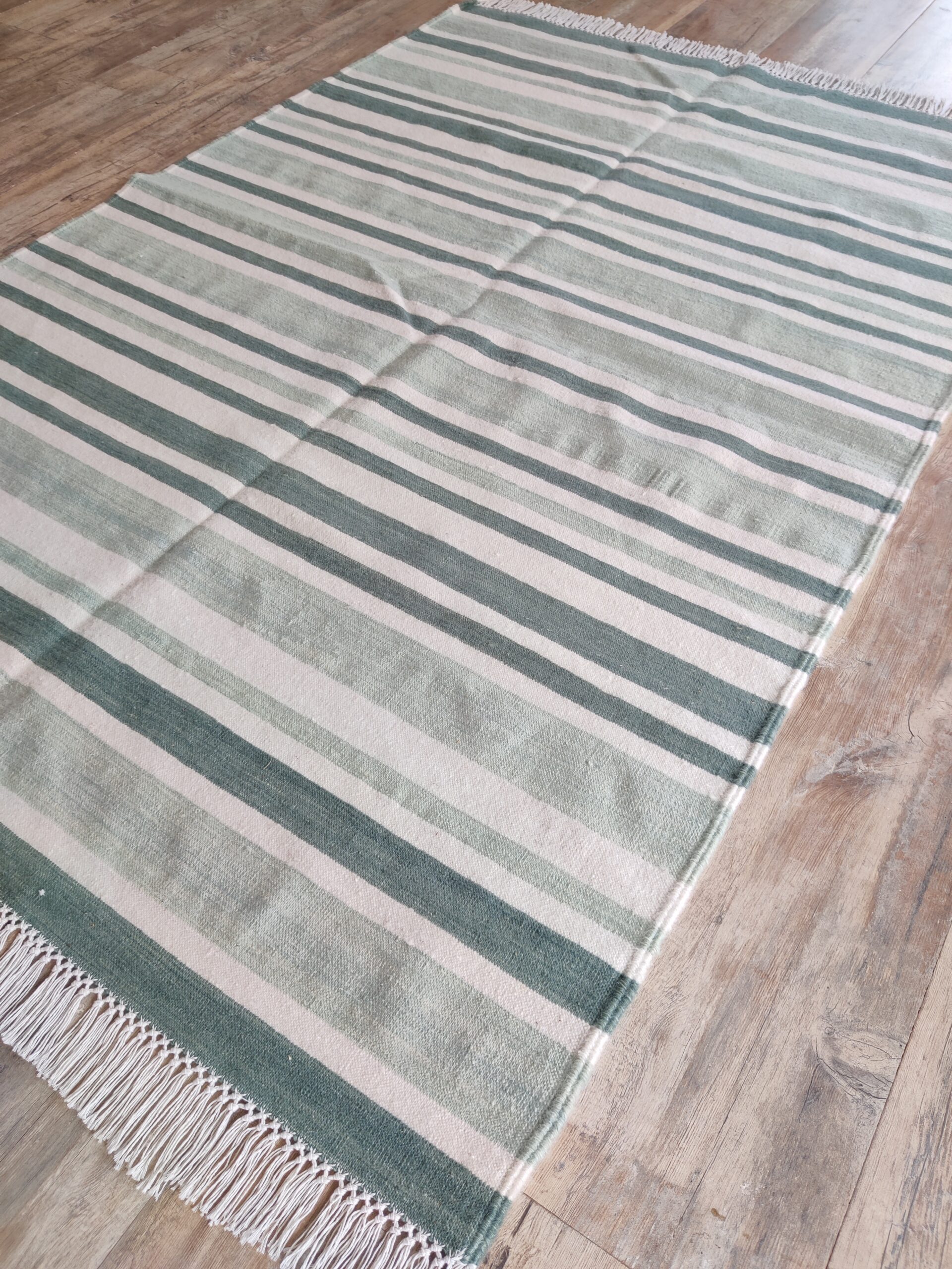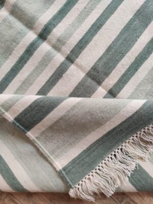 Handwoven Cotton Wool Rug, Home Decor Rug, Green And White Strips Wool Kilim Rug