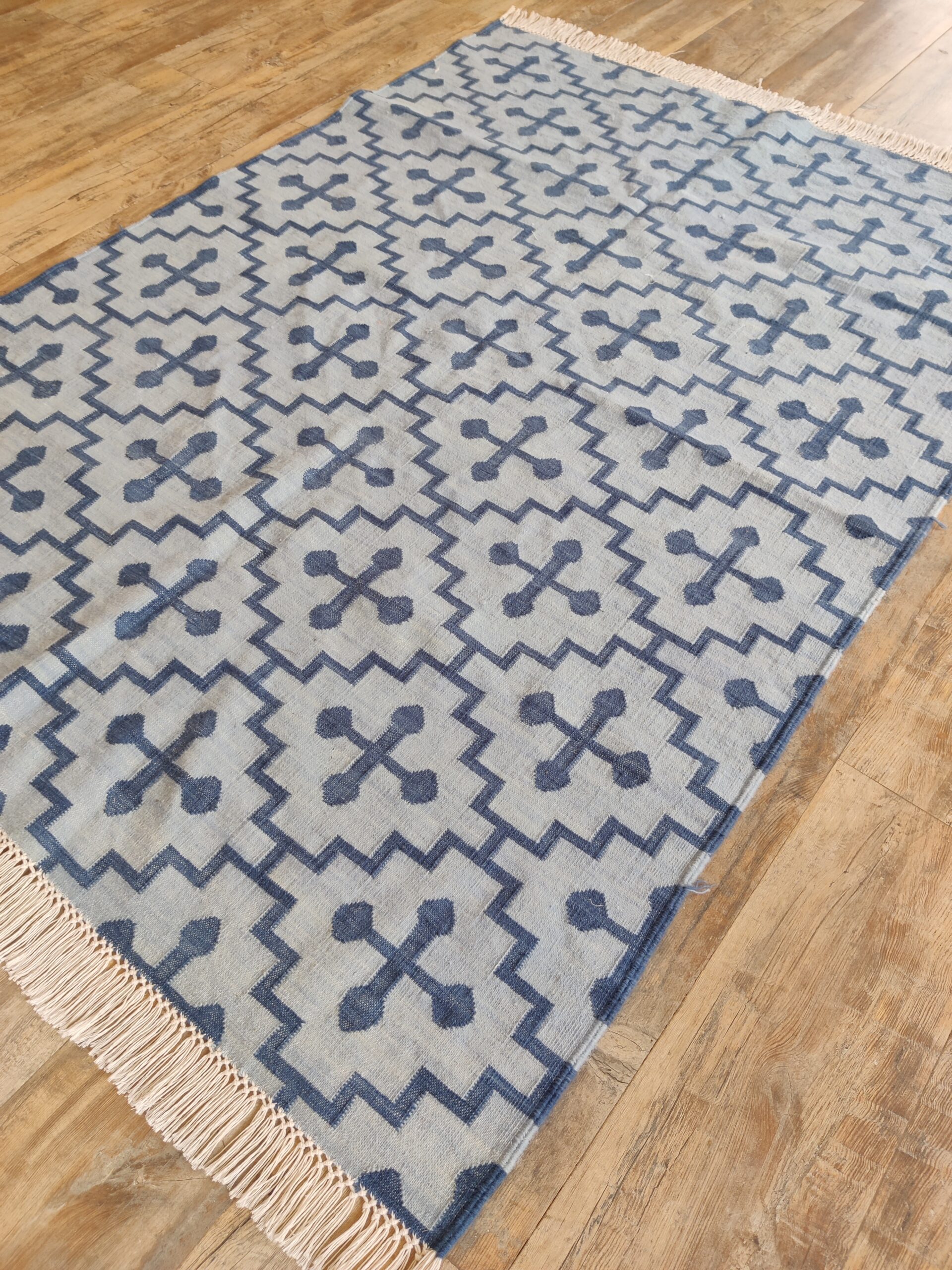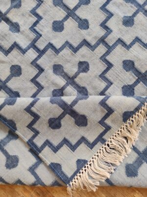 Handwoven Cotton Wool Rug: Blue & White Geometric Dhurrie – 9×12 Ft, Modern Flatweave Area Carpet
