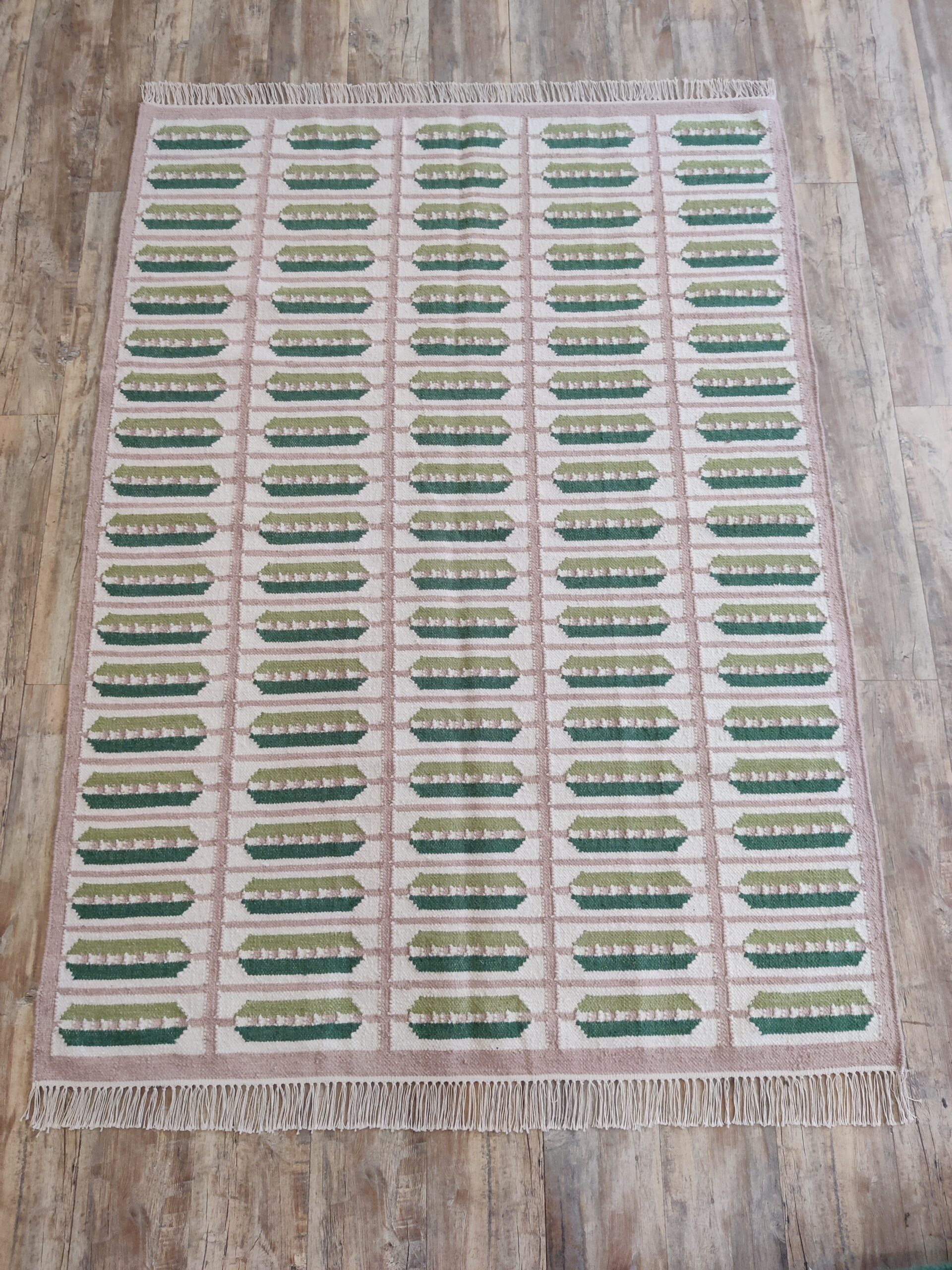 Handwoven Cotton Wool Rug: Beige & Sage Green Geometric Flatweave