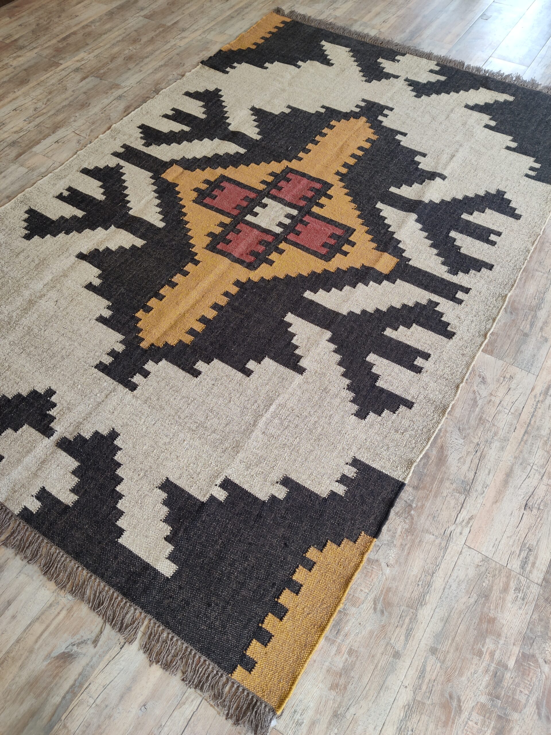 Handwoven Wool Jute Rug, Traditional Vintage Rug, Beige, Black And Yellow Wool Kilim Rug, Reversible Rug