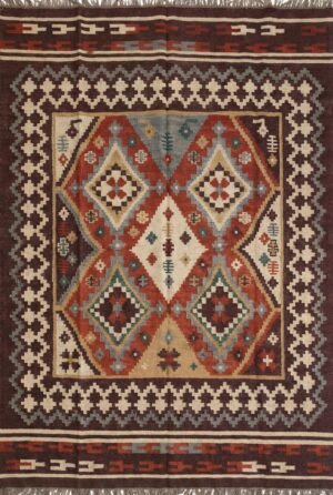 Modern Floral Flat-Weave Wool Rug: Tribal Geometric Design Rug, Traditional Area Rug, Wool Rug