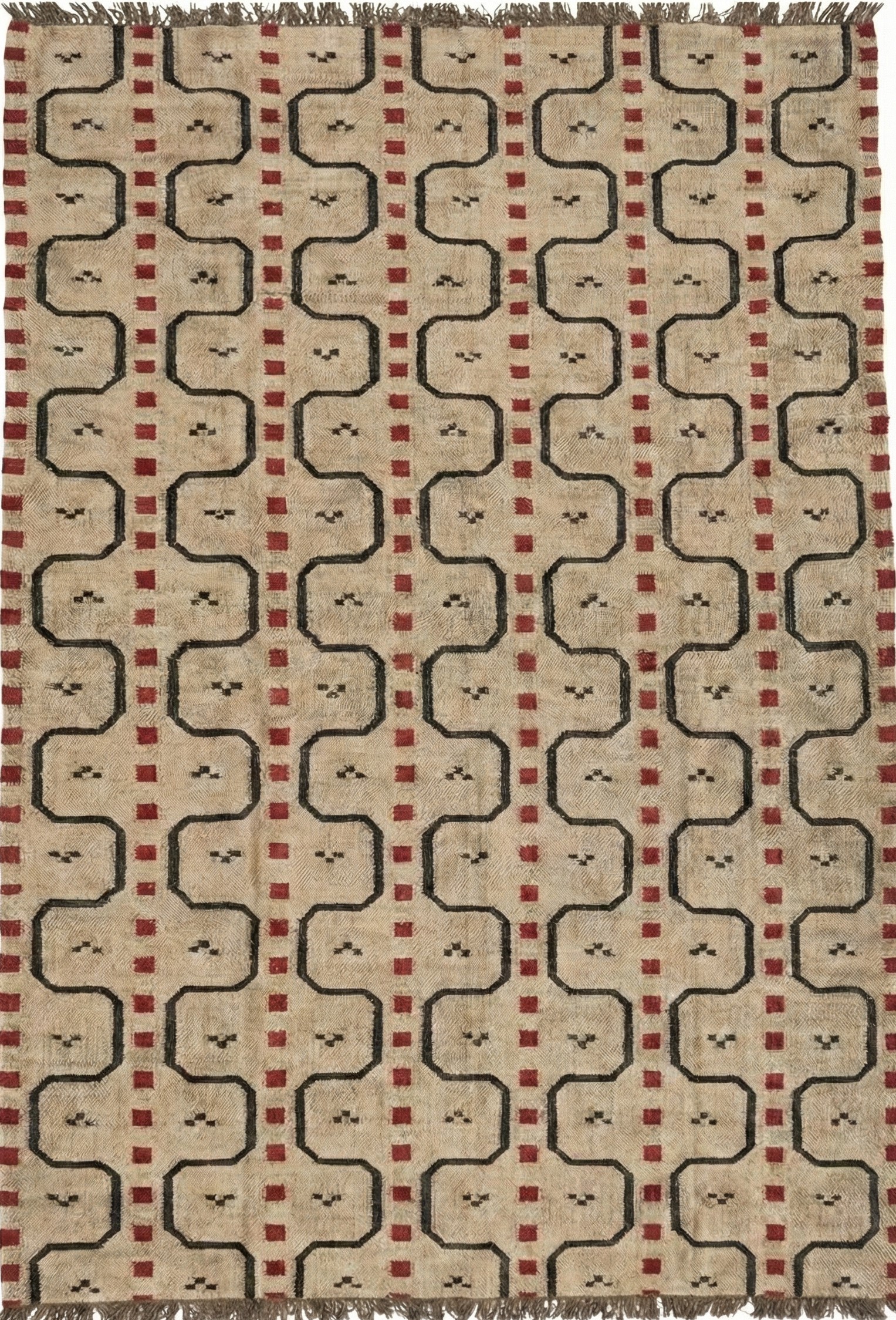 Beige And Red Geometric Wool Jute Rug, Home And Living Room Rug, Vintage Wool Jute Rug