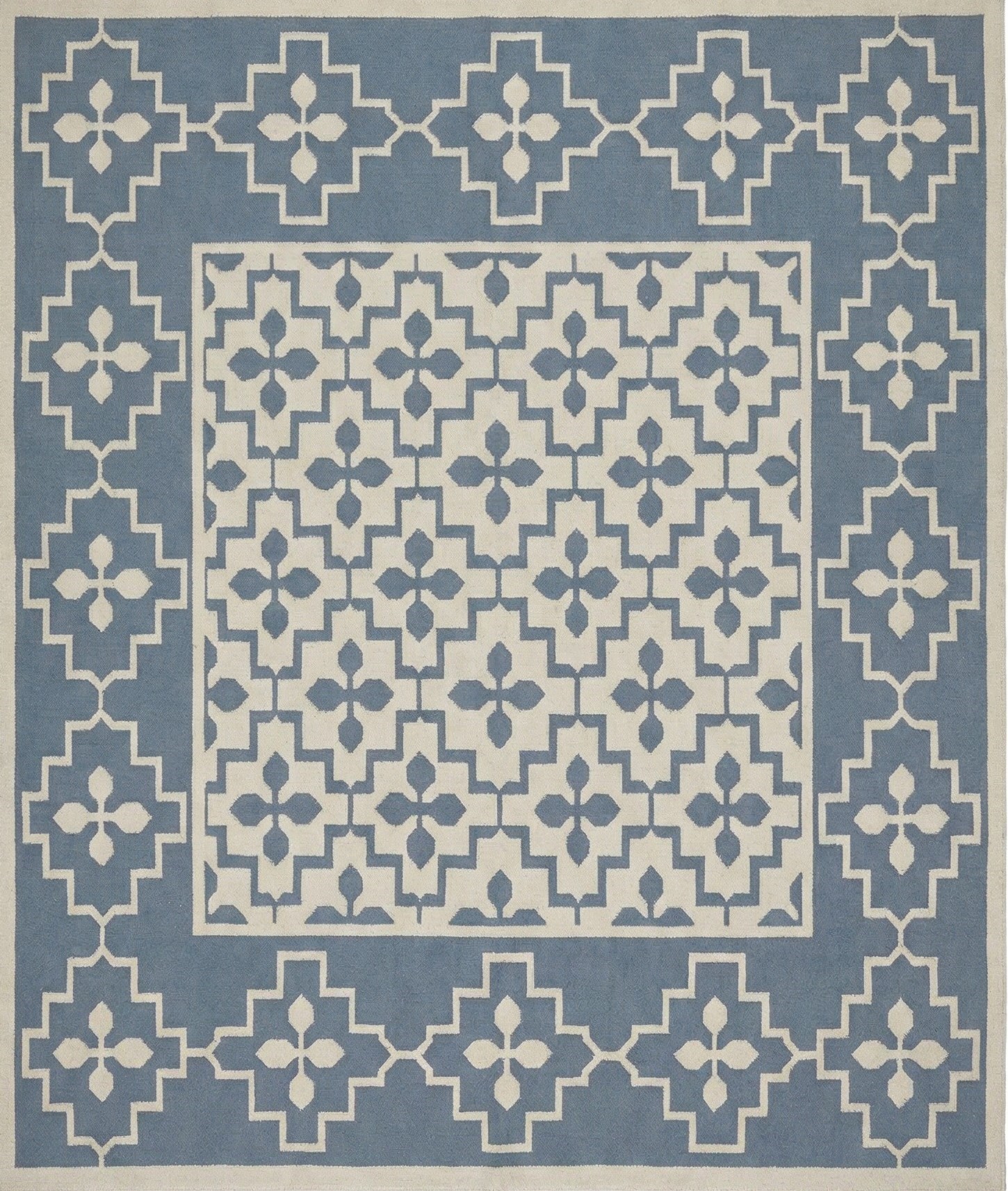 Blue and White Geometric Cotton Rug: Modern Flatweave Dhurrie