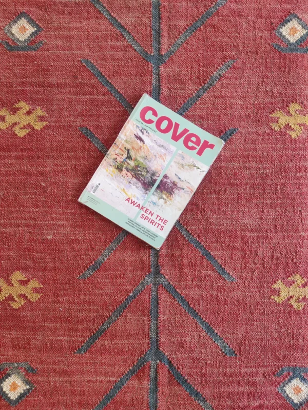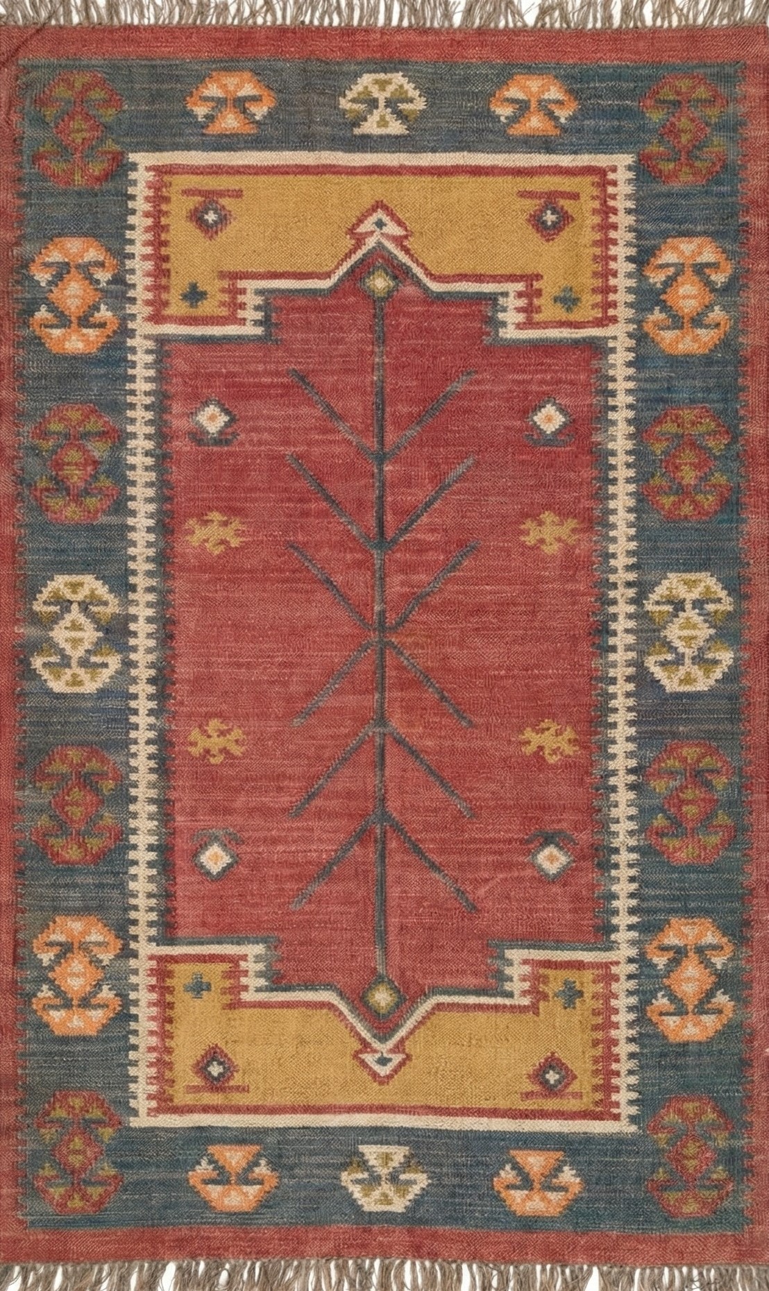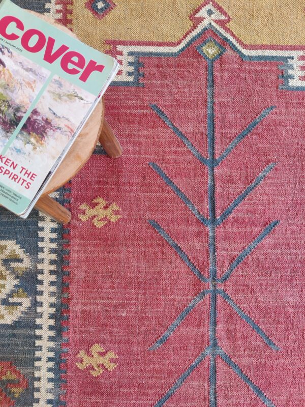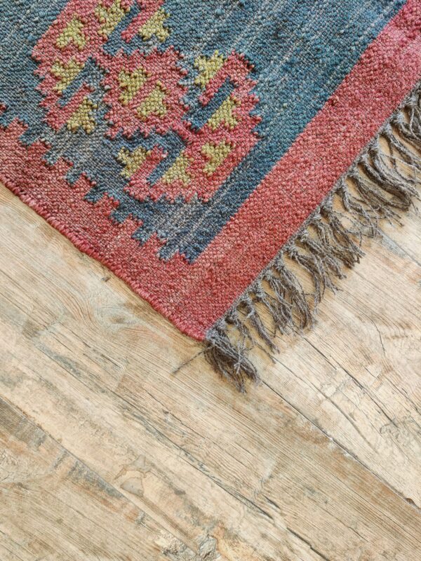 The Geometric design of a rust-color weaves its way seamlessly into any space from coastal dining to urban sleeping. Jute kilim dhurrie construction.