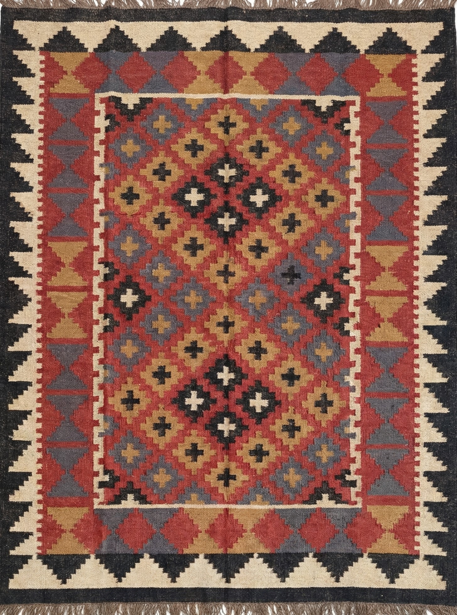 The Geometric design of a rust-color weaves its way seamlessly into any space from coastal dining to urban sleeping. Jute kilim dhurrie construction.