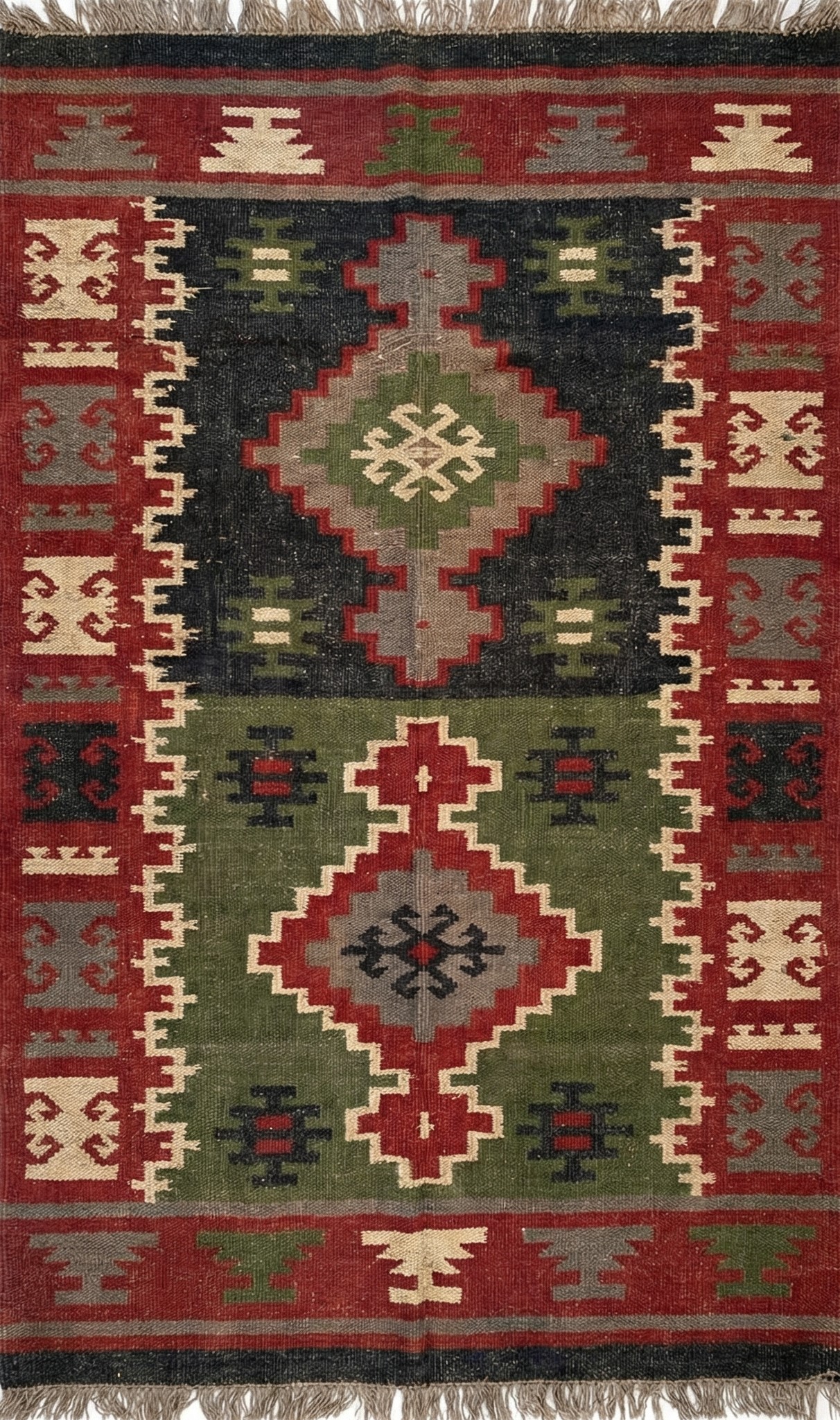 Handmade Wool Jute Rug, Multicolor Geometric Pattern Rug, Red And Green Jute Rug