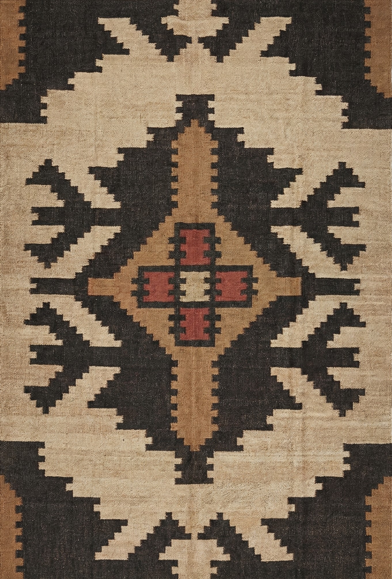 The Geometric design of a rust-color weaves its way seamlessly into any space from coastal dining to urban sleeping. Jute kilim dhurrie construction.