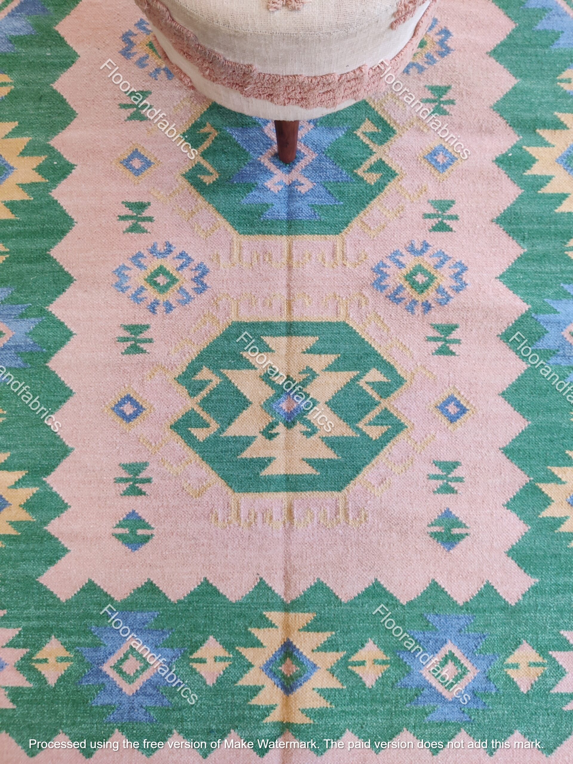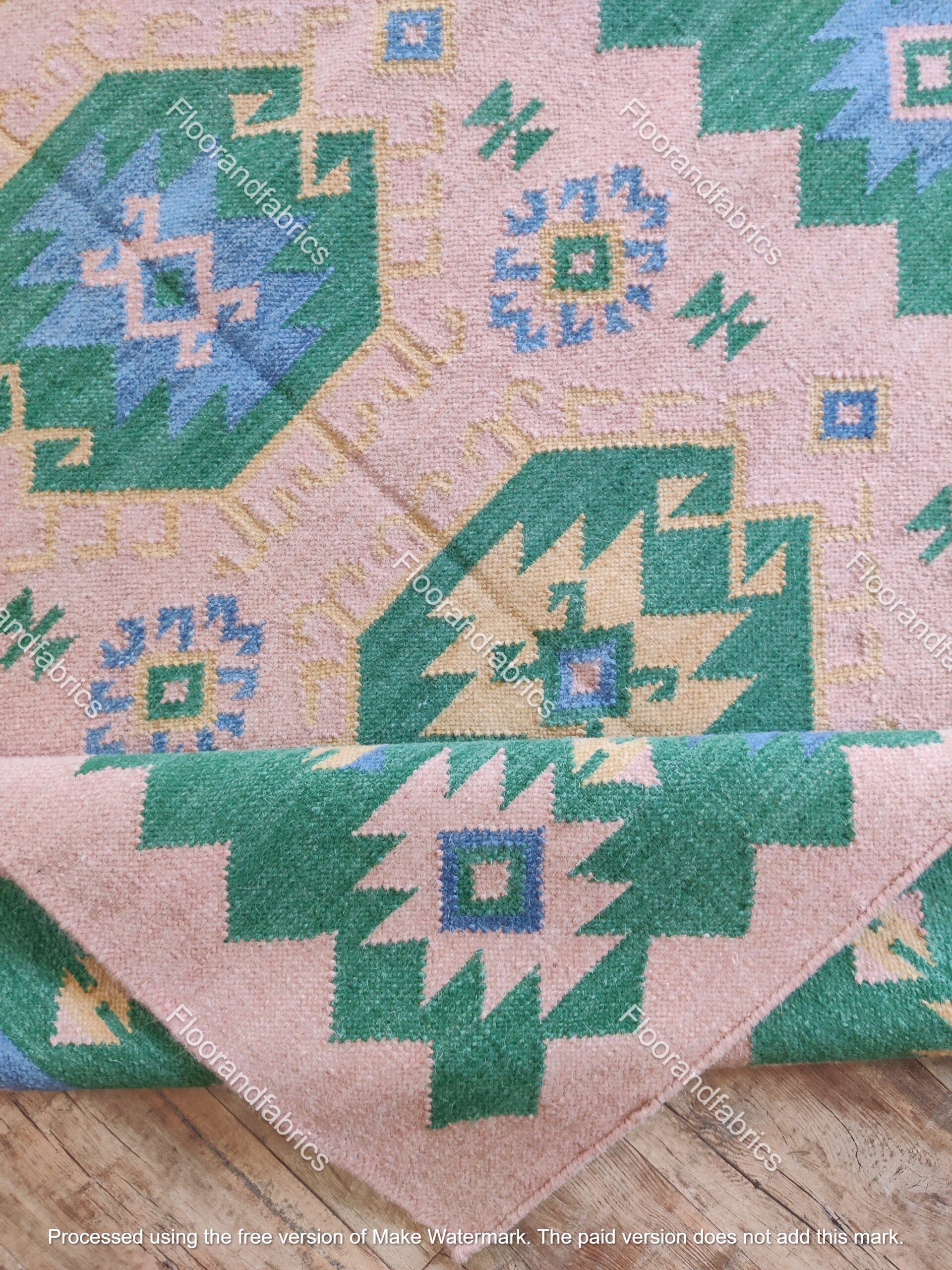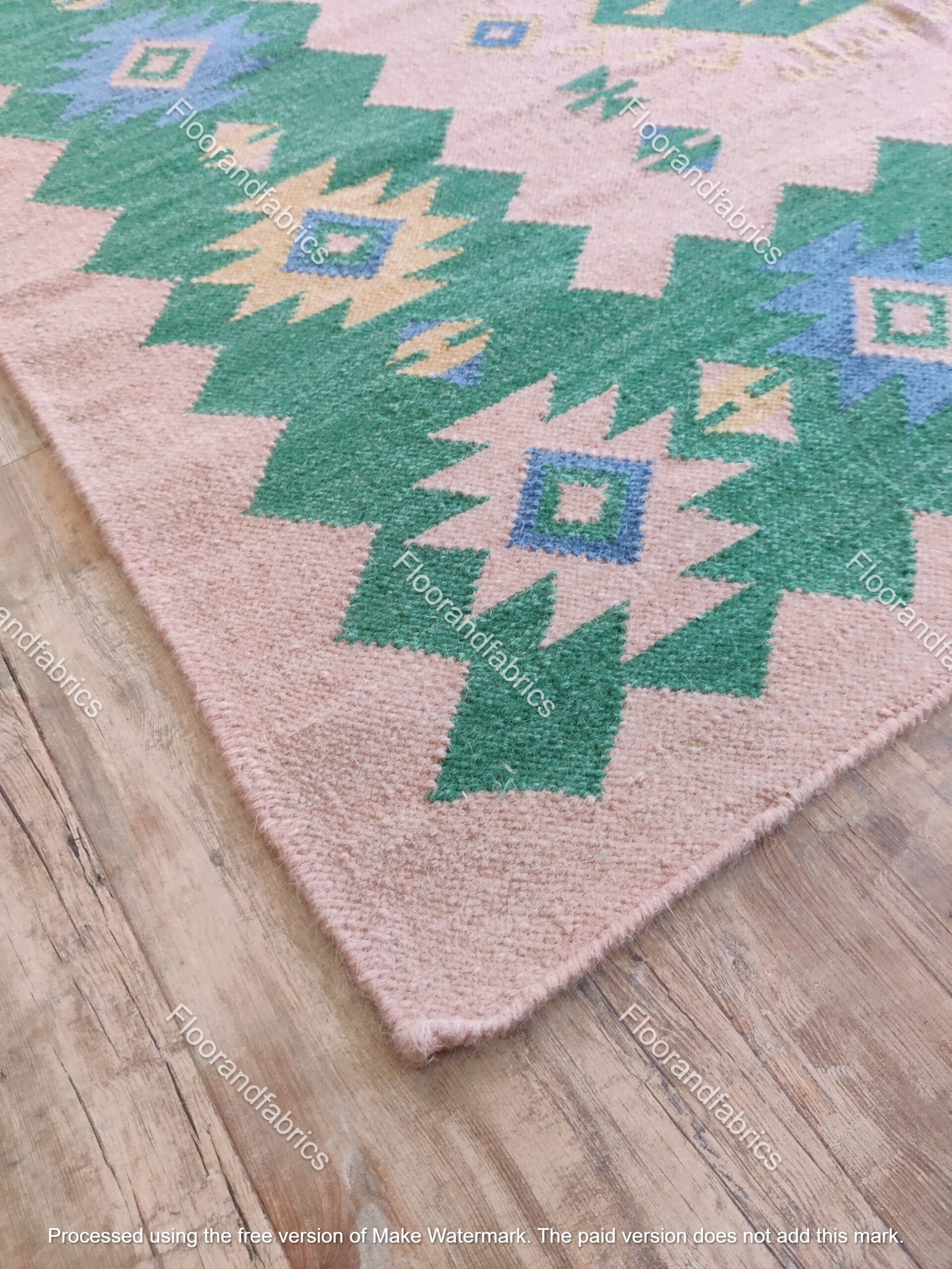 Handmade Wool Kilim Rug, Beige And Green Geometric Pattern Wool Kilim Rug, Home Decor Rug