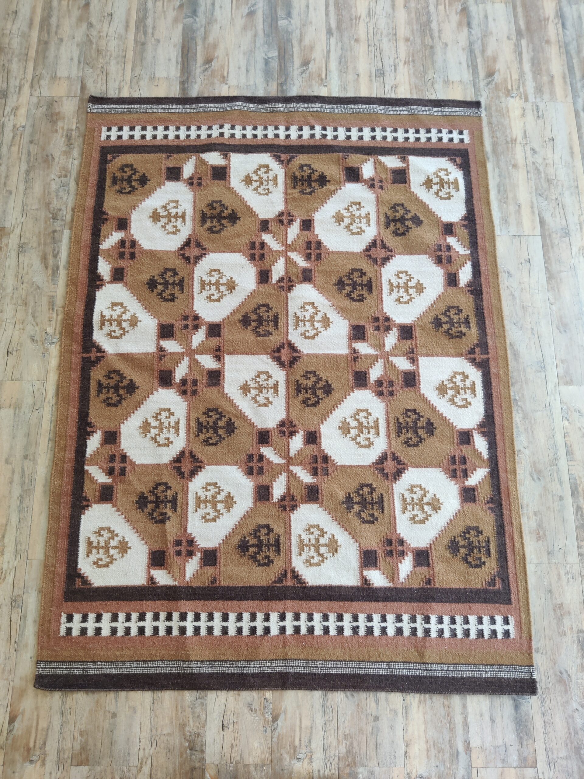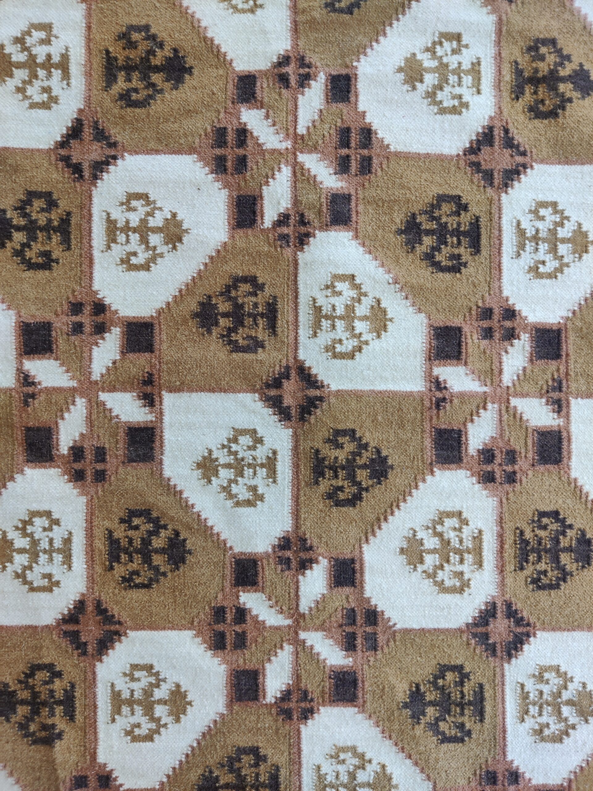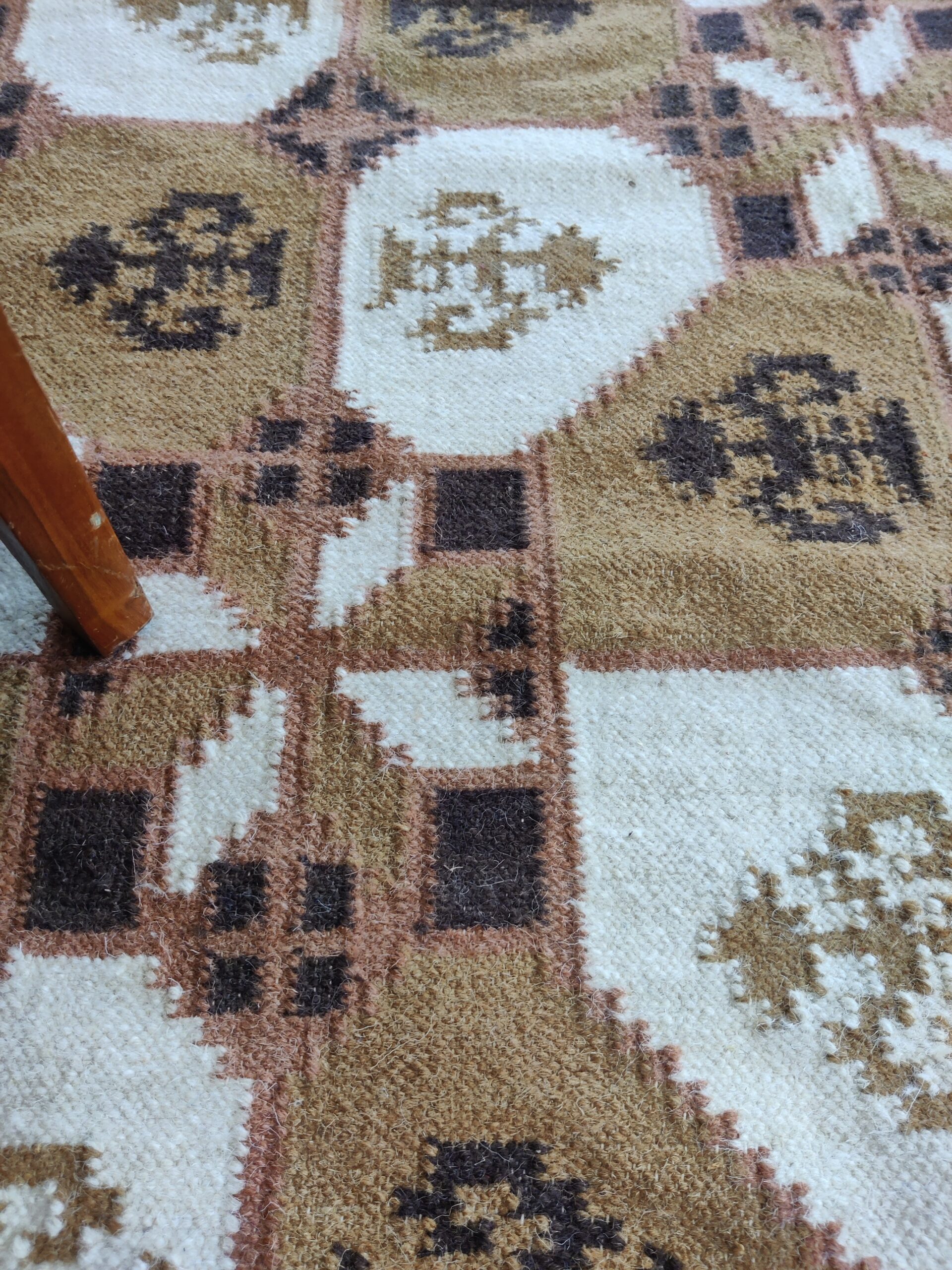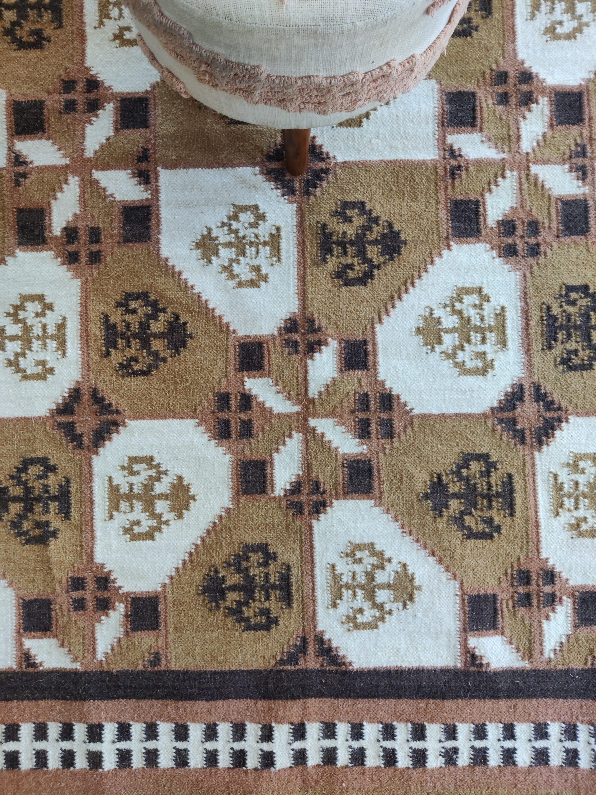 Handwoven Brown And White Geometric Pattern Rug, Cotton Wool Rug, Home Decor Rug