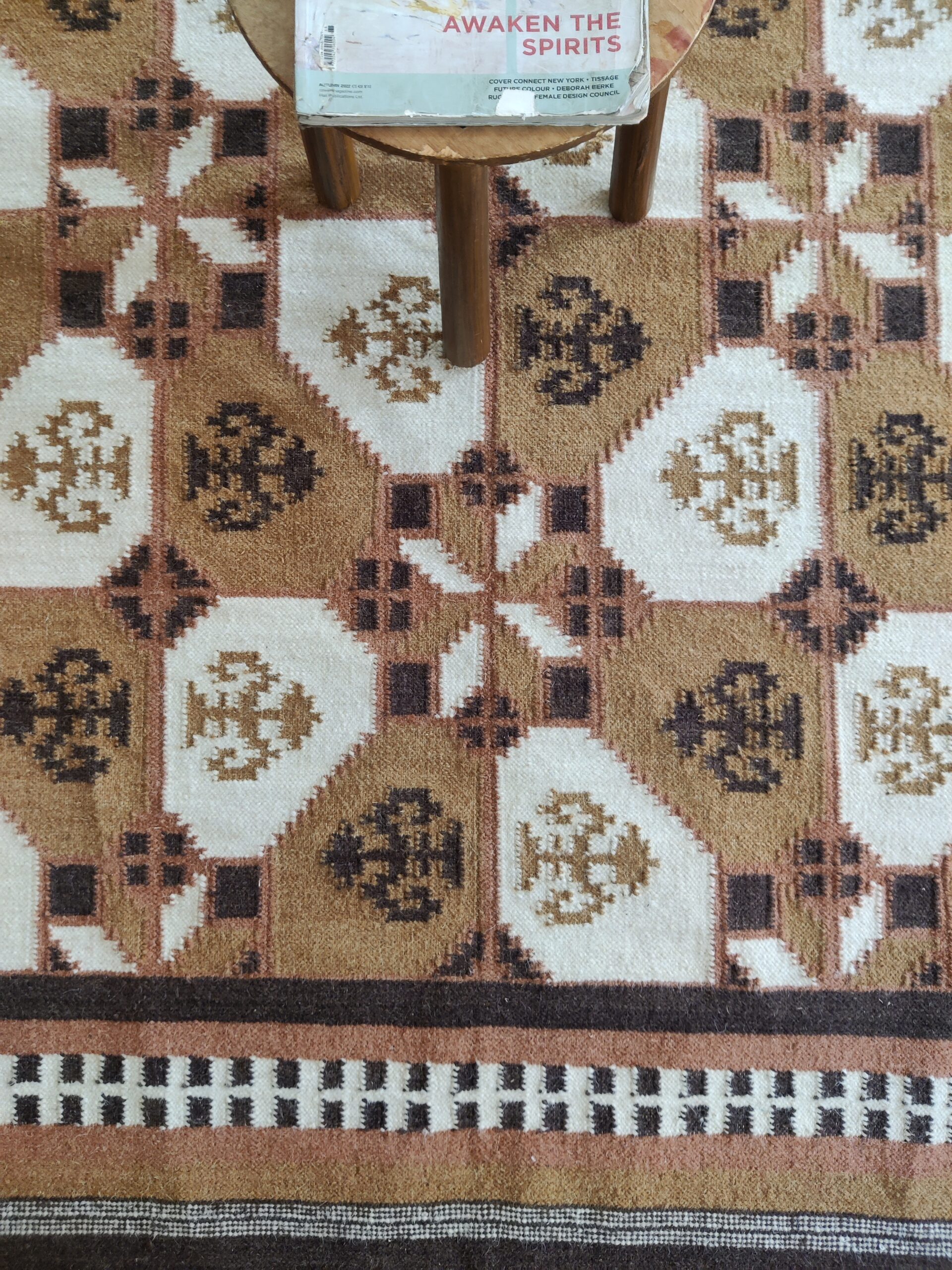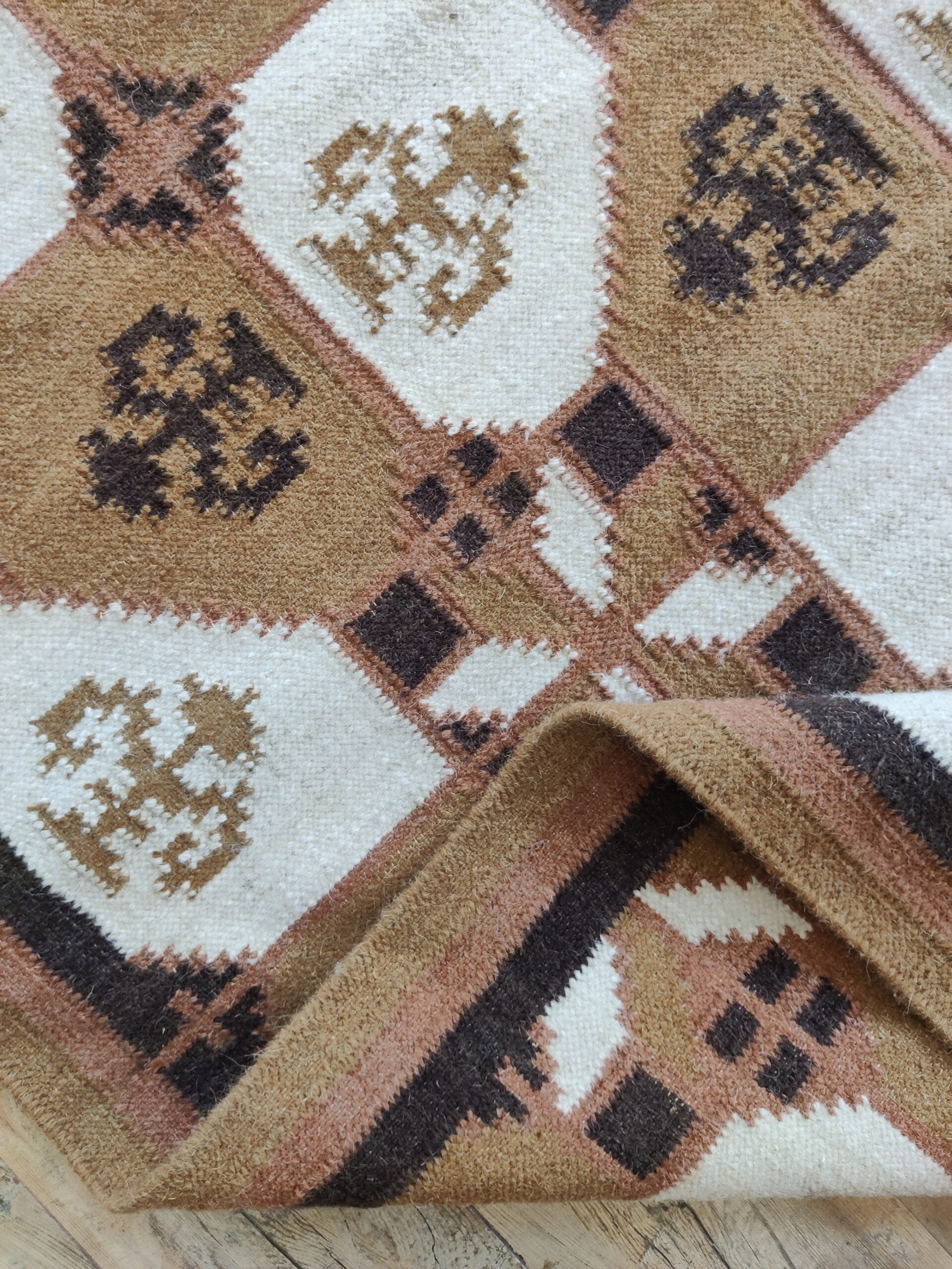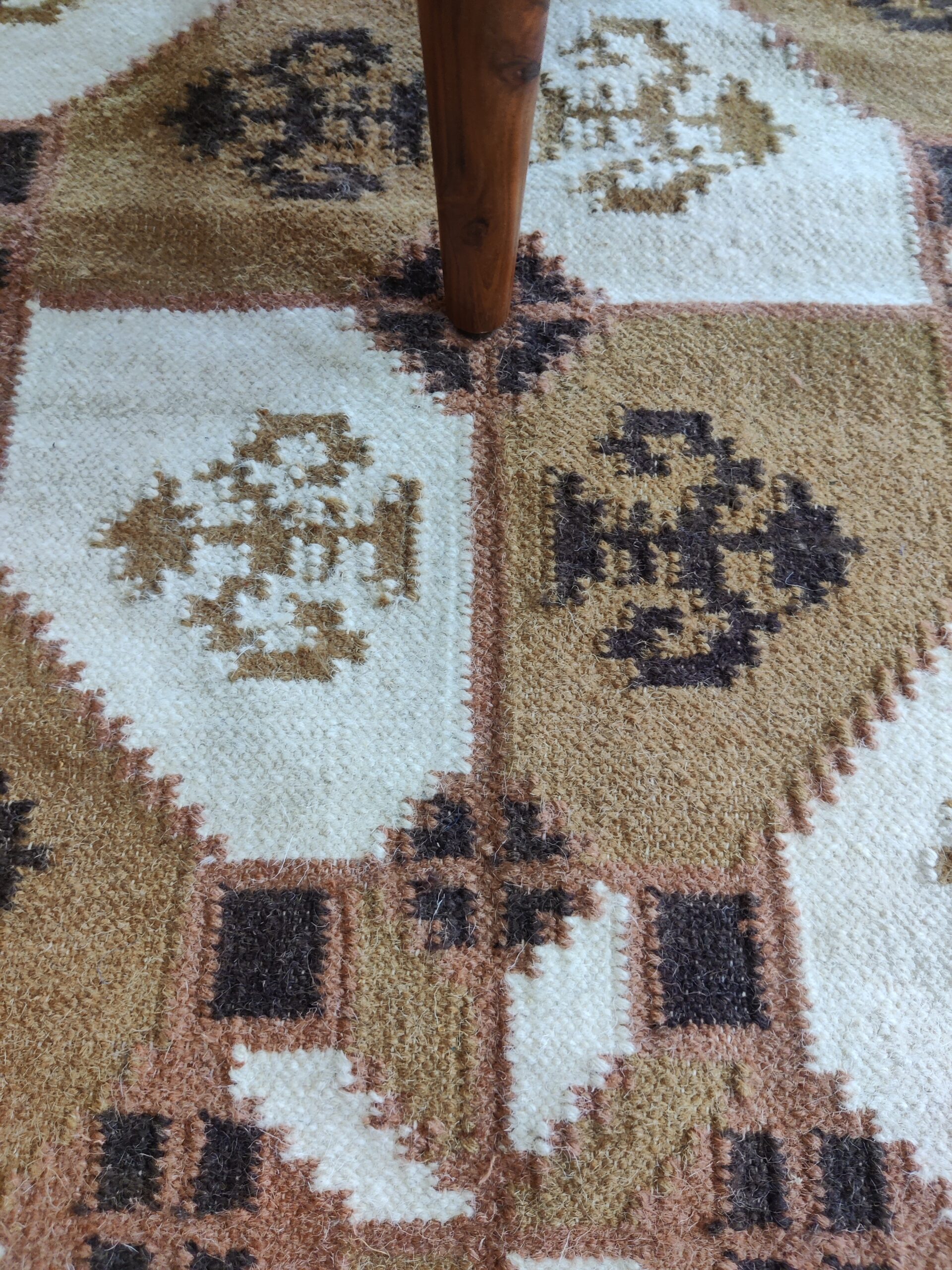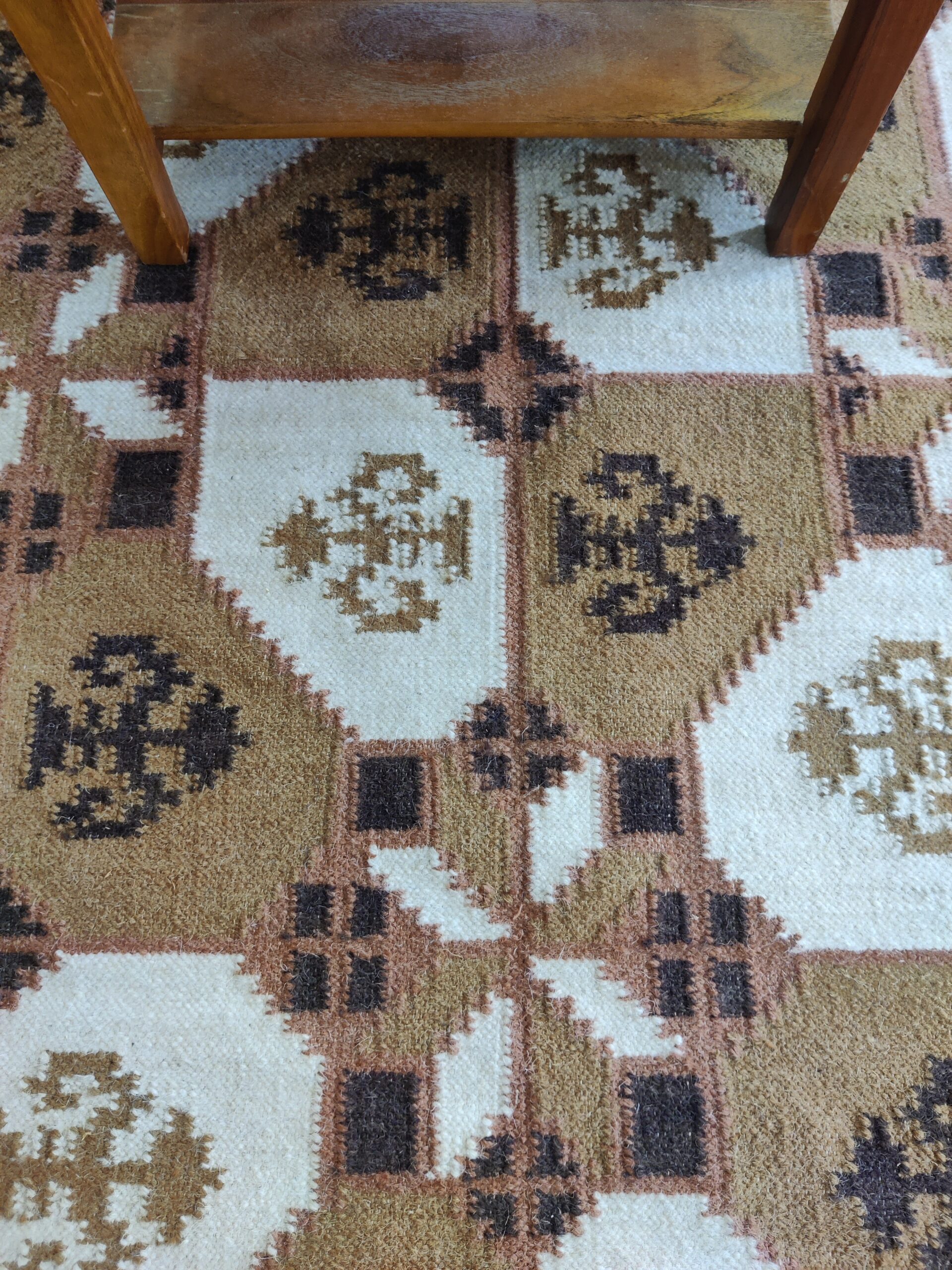Handwoven Brown And White Geometric Pattern Rug, Cotton Wool Rug, Home Decor Rug