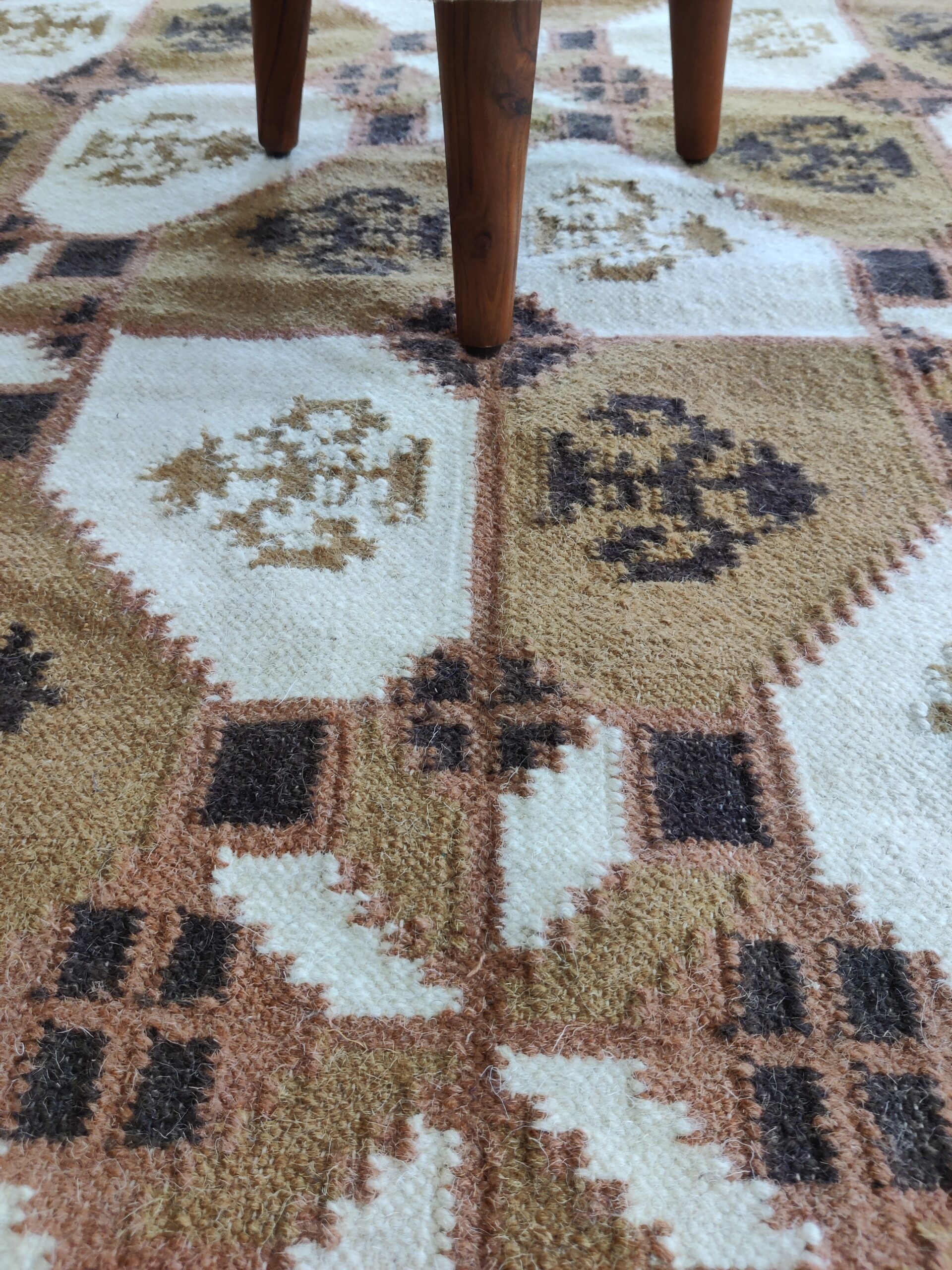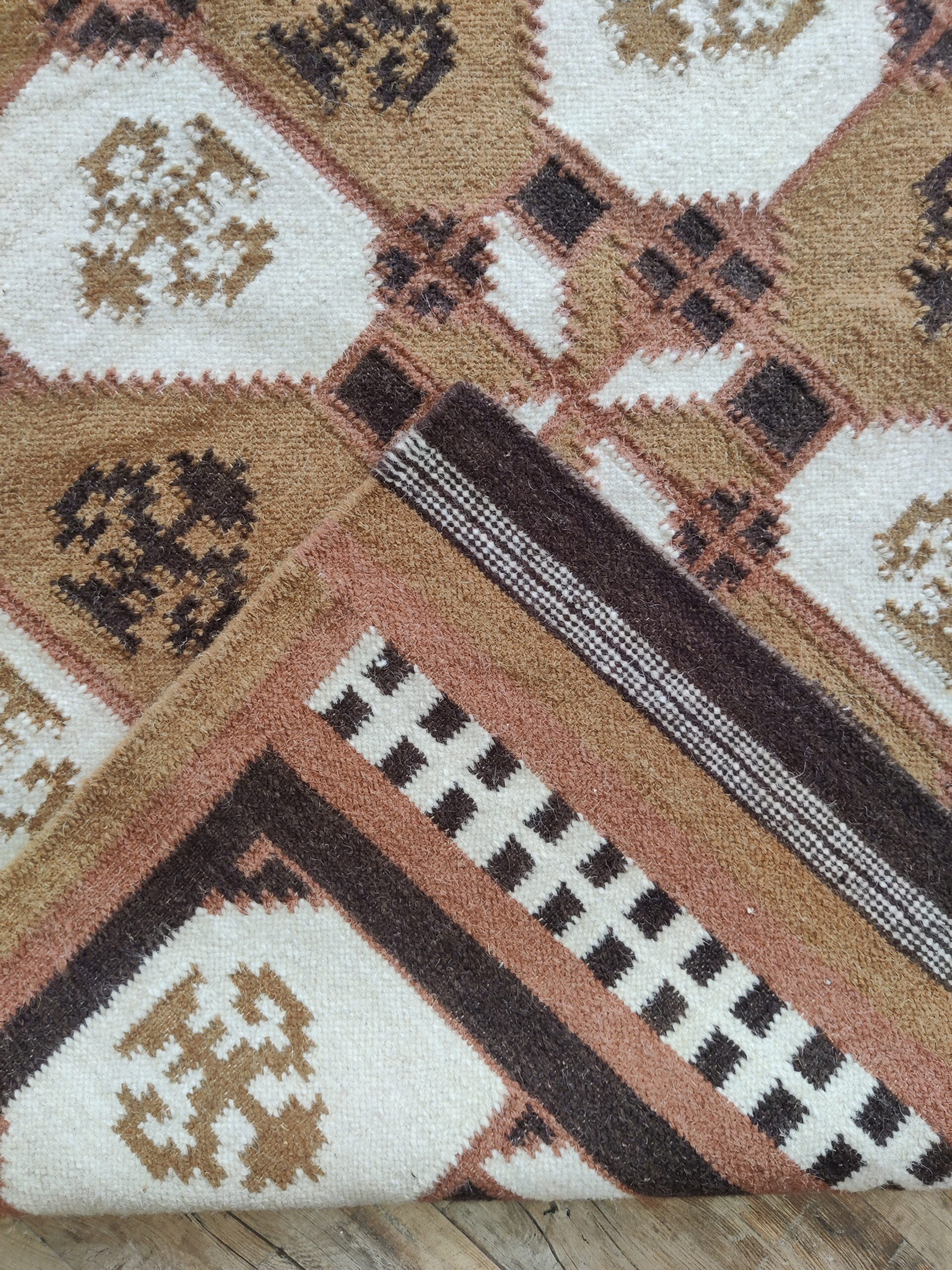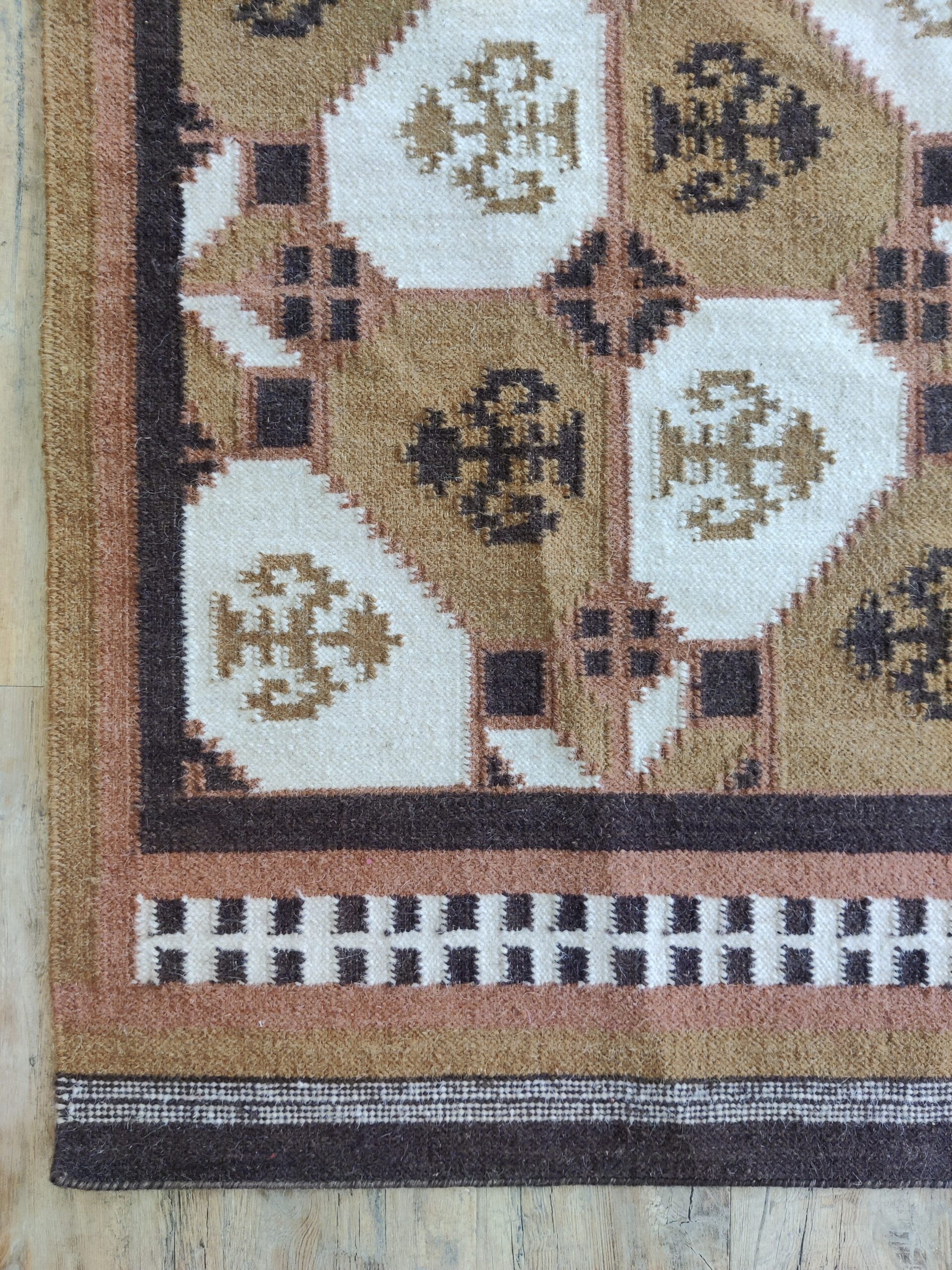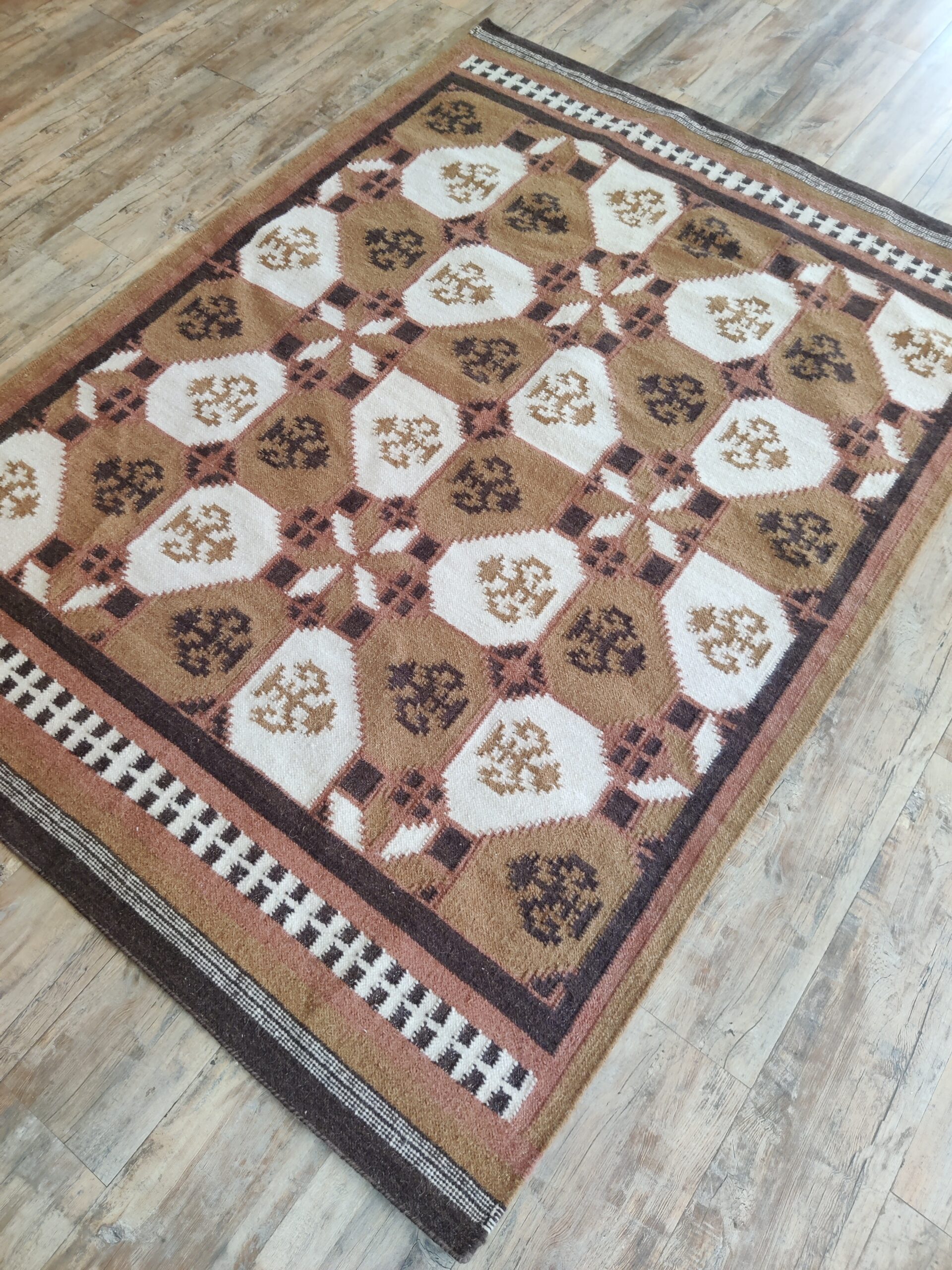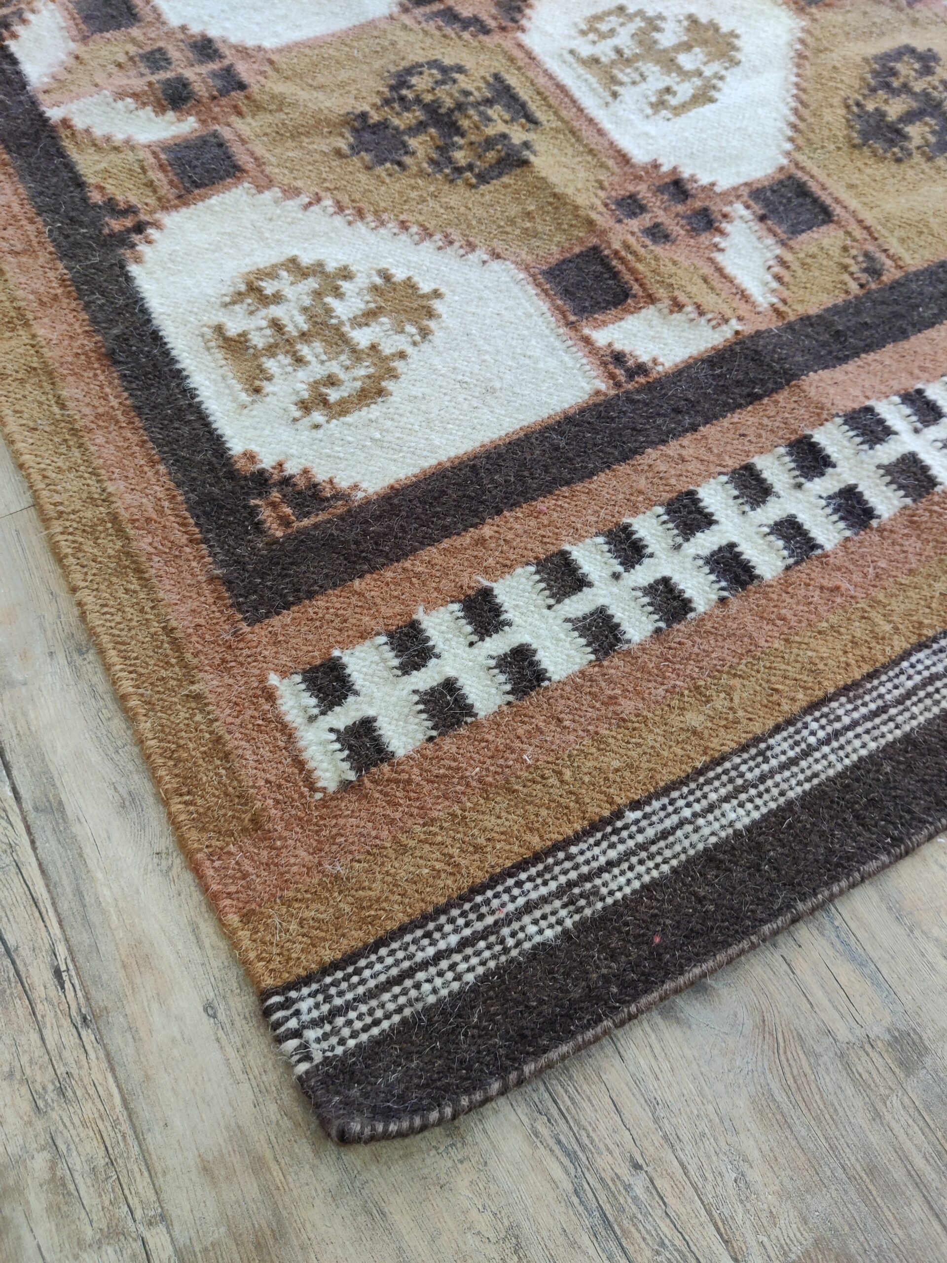 Handwoven Brown And White Geometric Pattern Rug, Cotton Wool Rug, Home Decor Rug