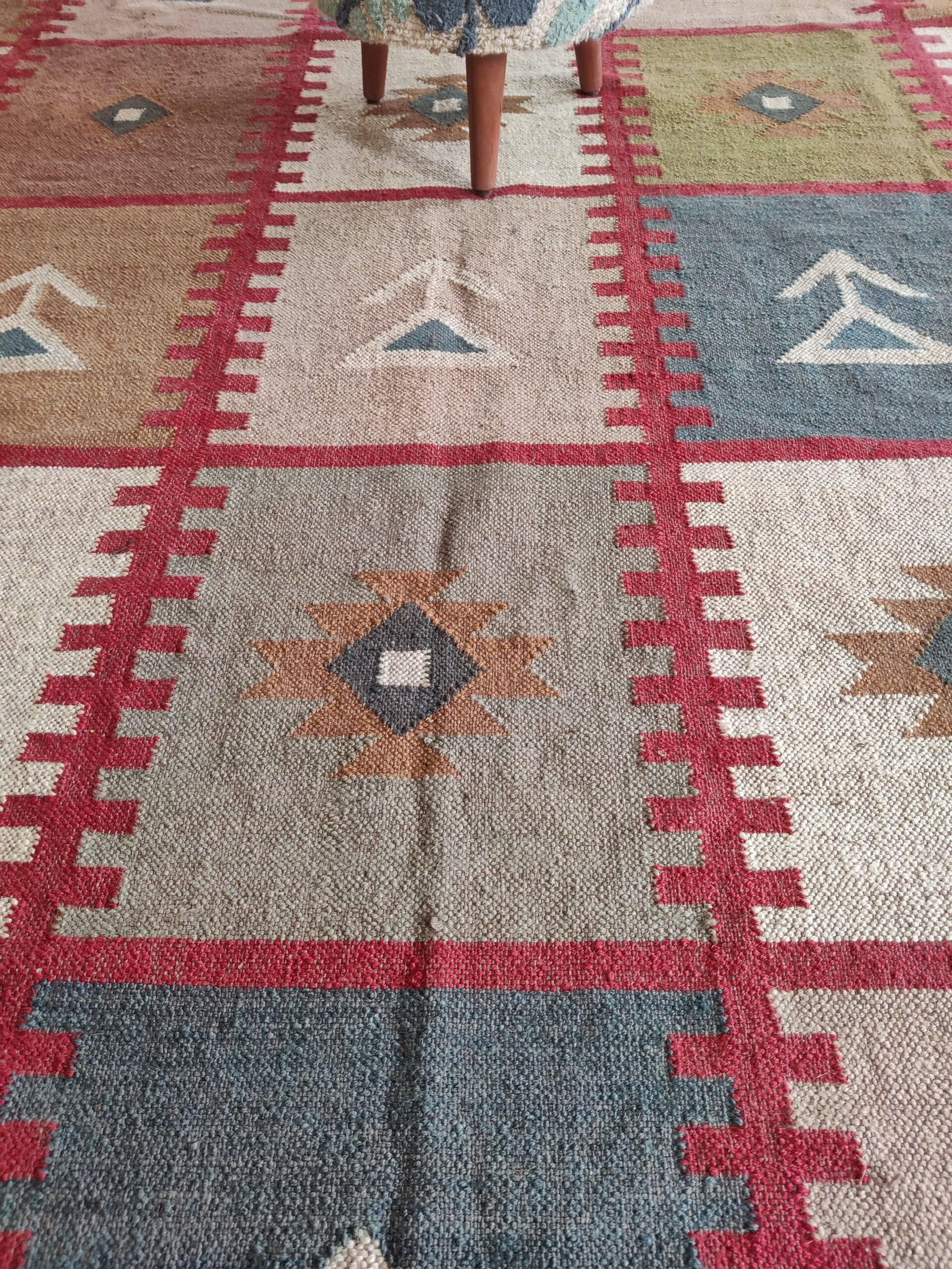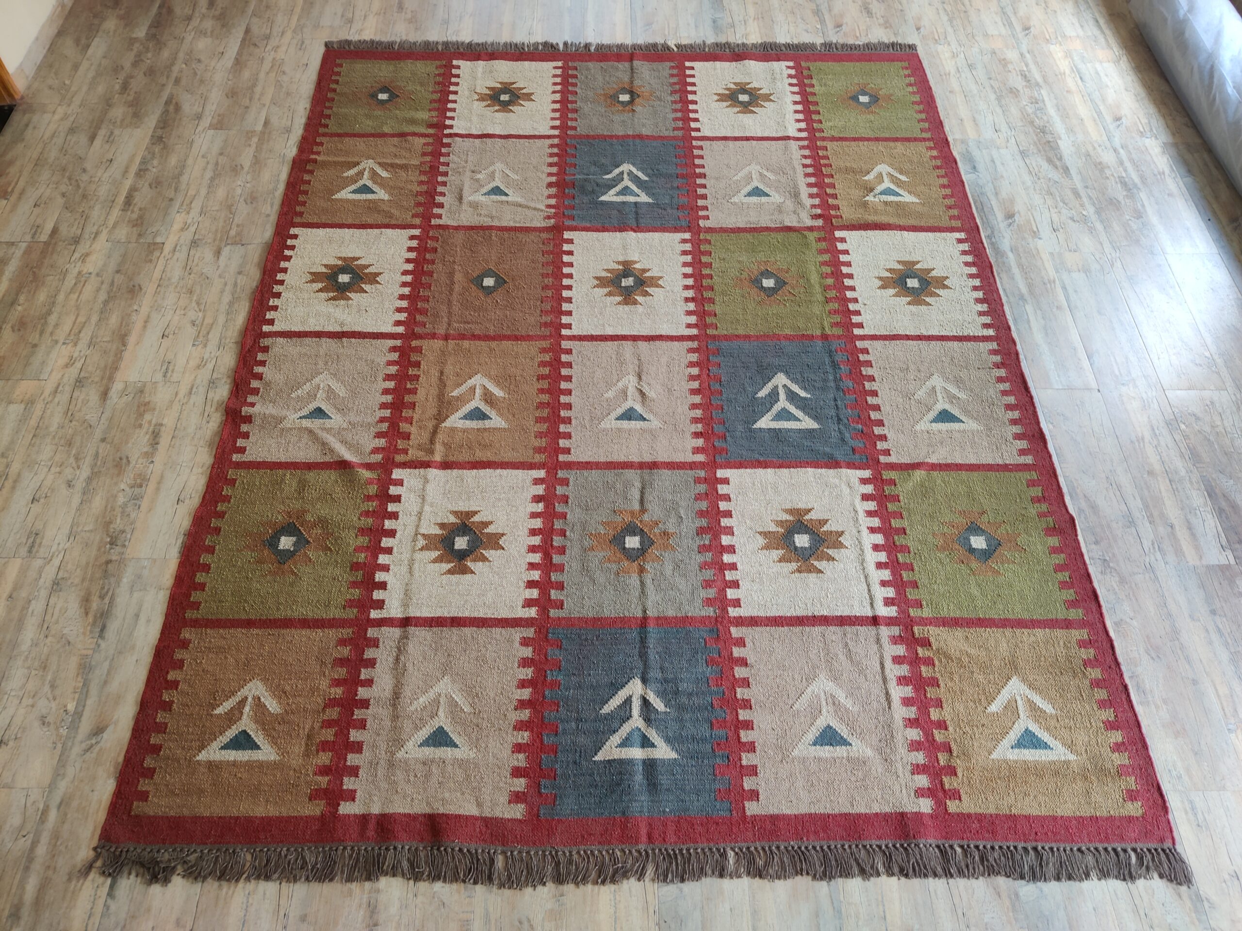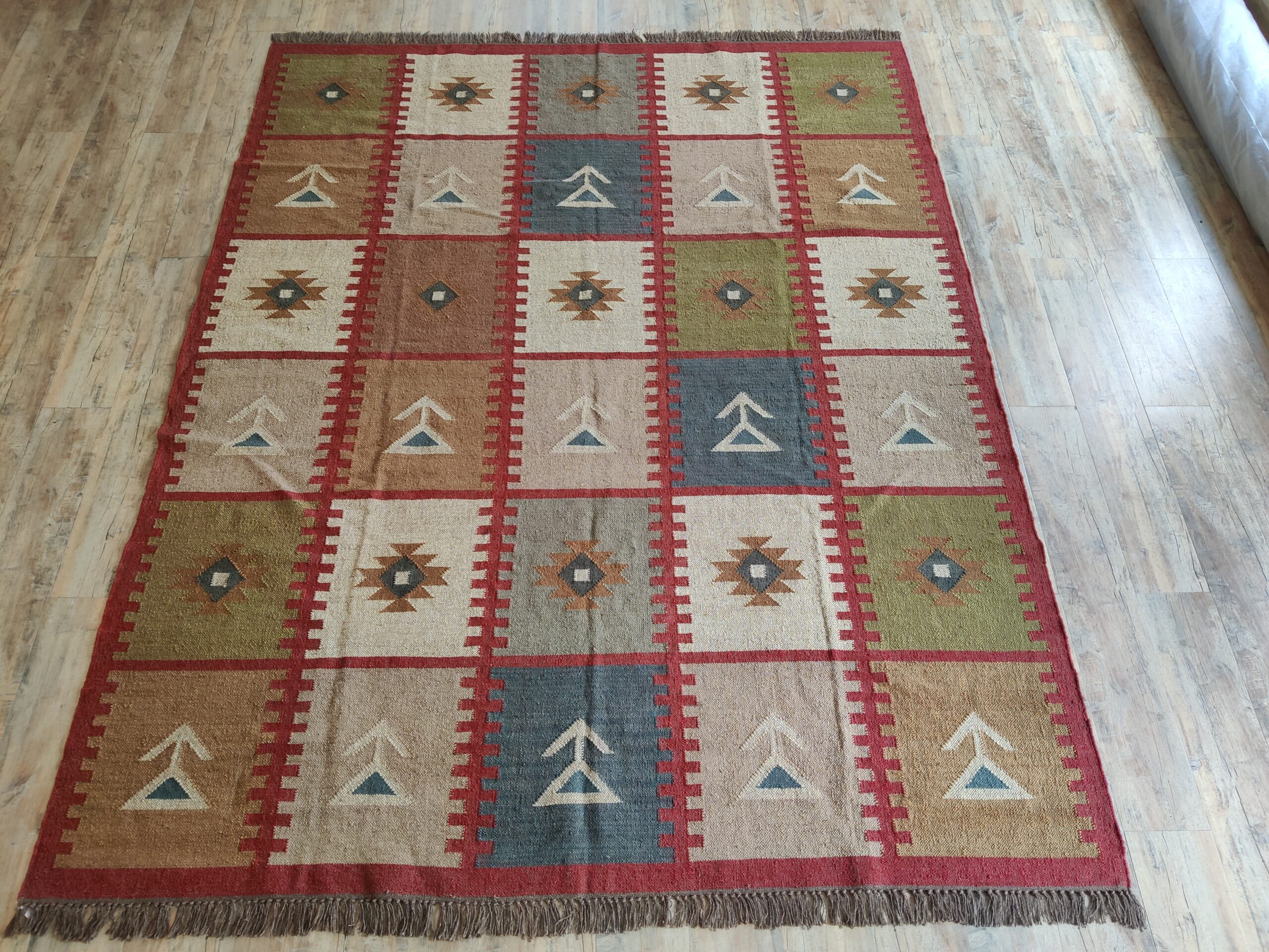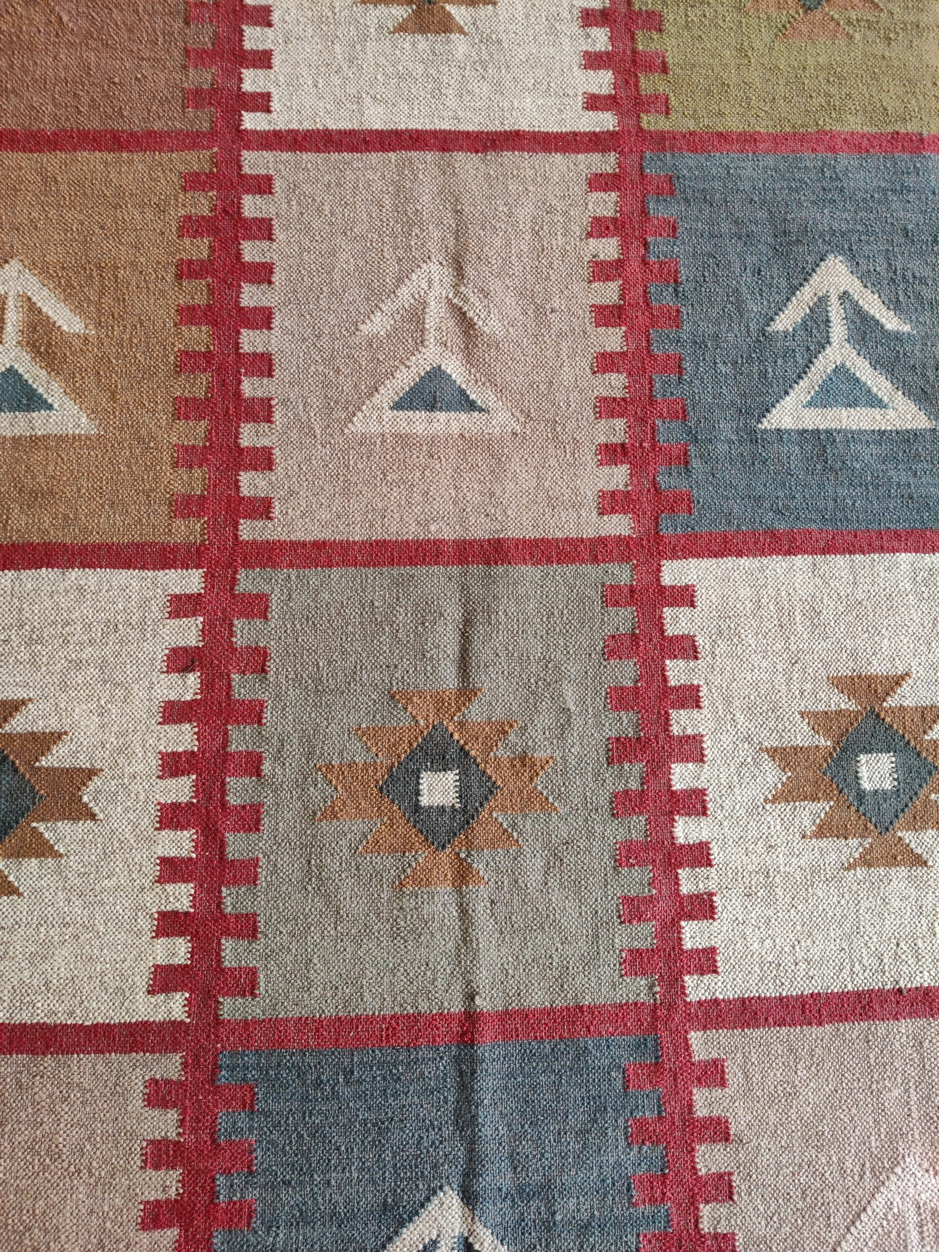 Handwoven Colourful Checkered Home Decor Rug, Wool Jute Rug, Home And Living Room Jute Kilim Rug
