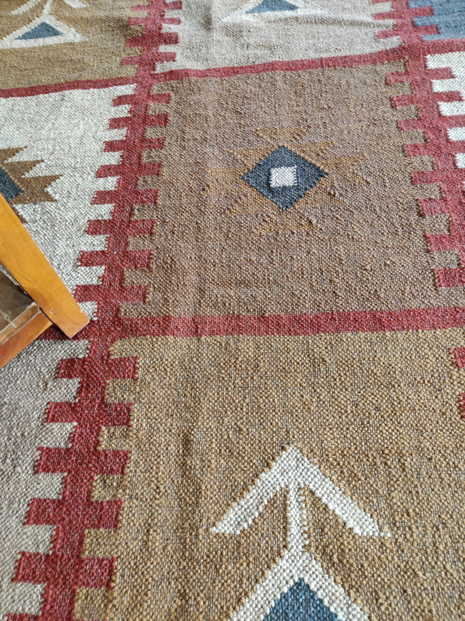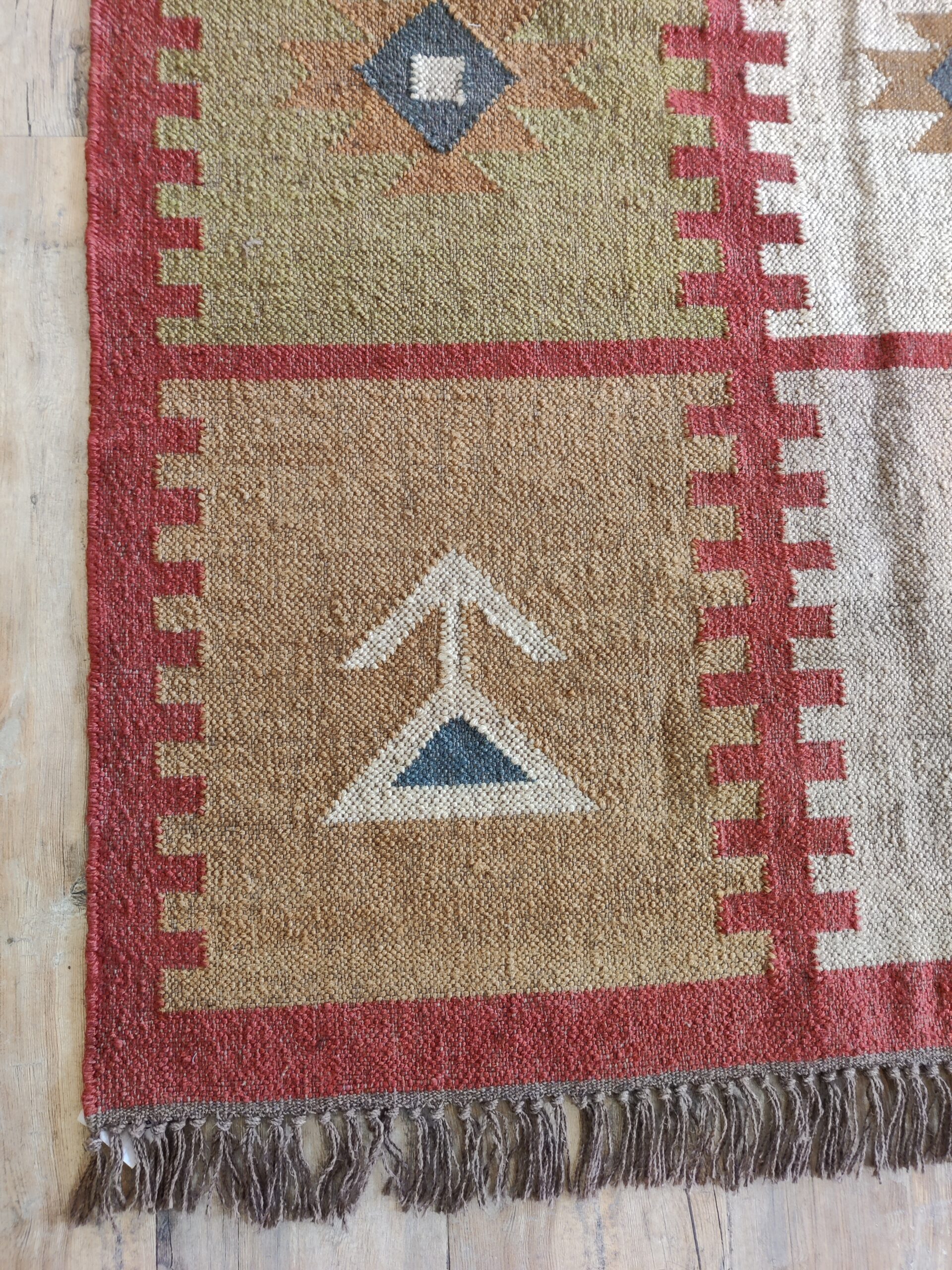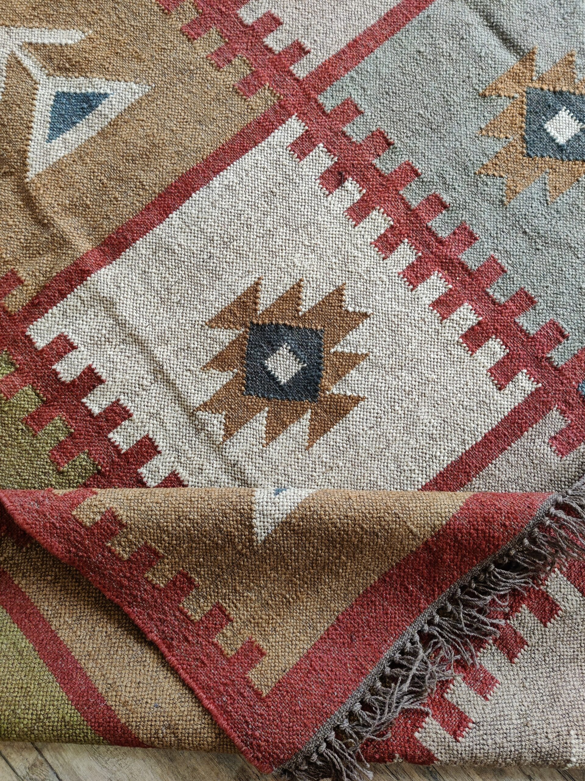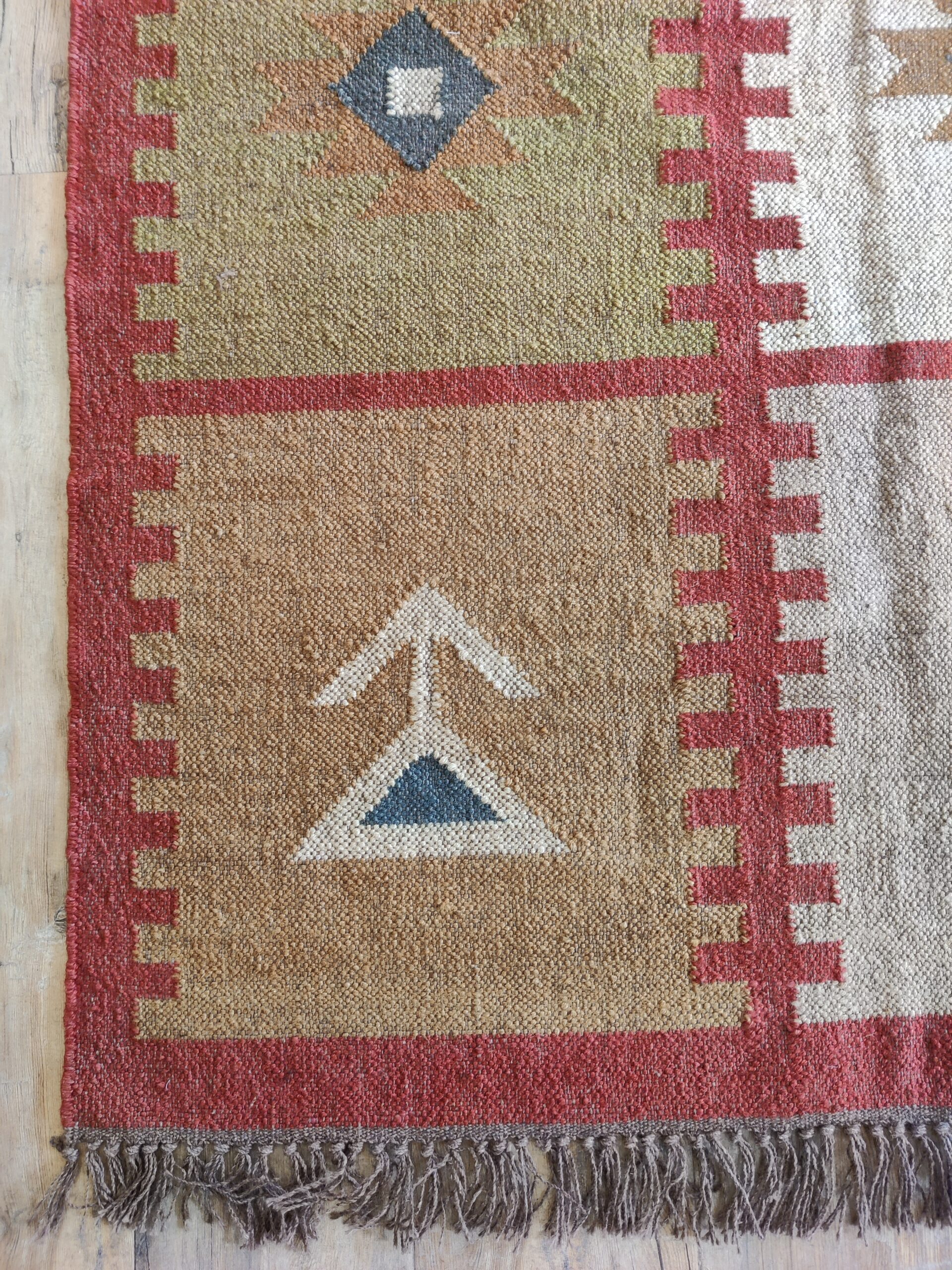 The Geometric design of a rust-color weaves its way seamlessly into any space from coastal dining to urban sleeping. Jute kilim dhurrie construction.