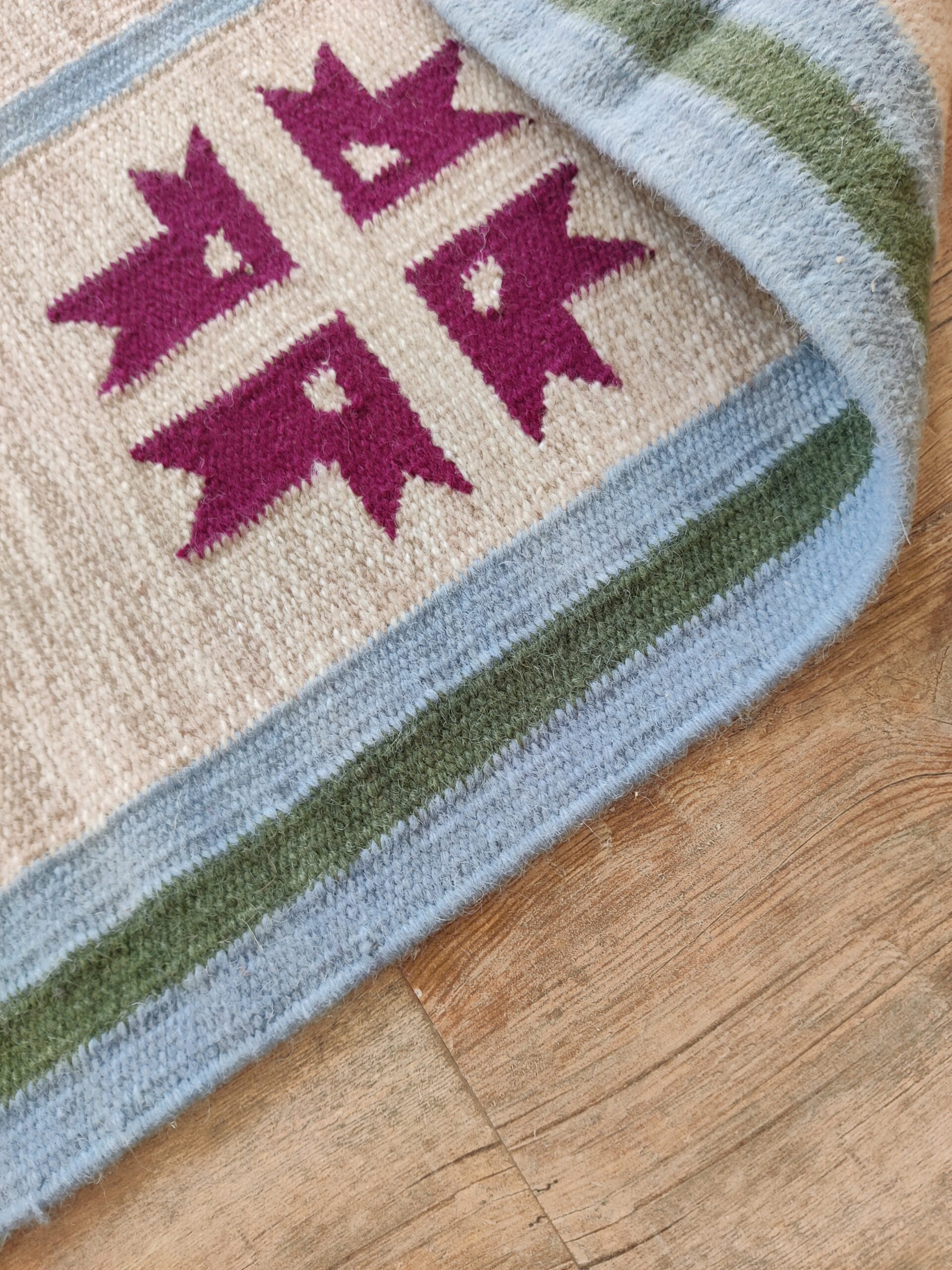 Transform your living space with our exquisite handmade wool cotton rug. This stunning piece is not just a functional addition to your home, but a statement of elegance and craftsmanship.