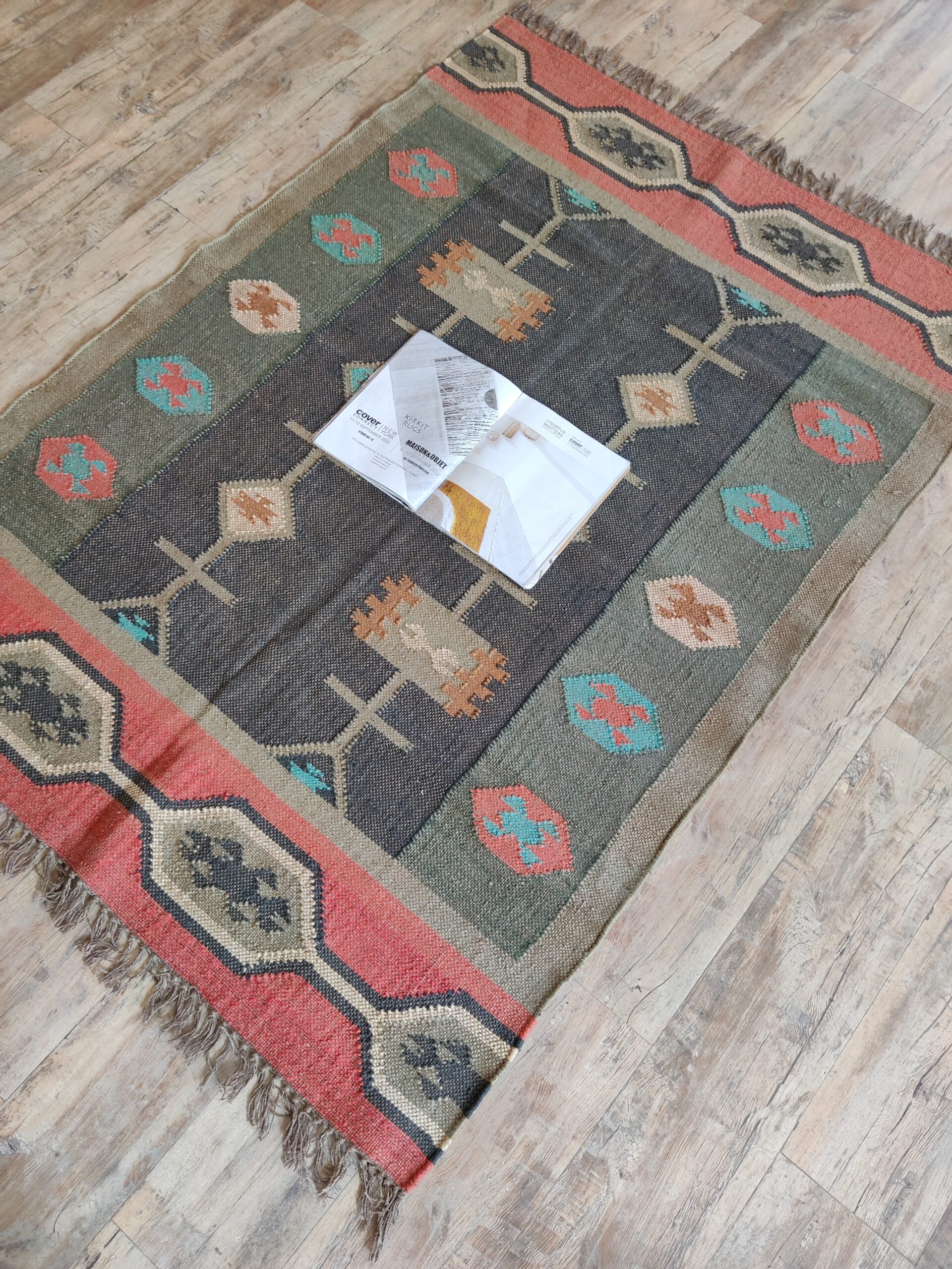 The Geometric design of a rust-color weaves its way seamlessly into any space from coastal dining to urban sleeping. Jute kilim dhurrie construction.