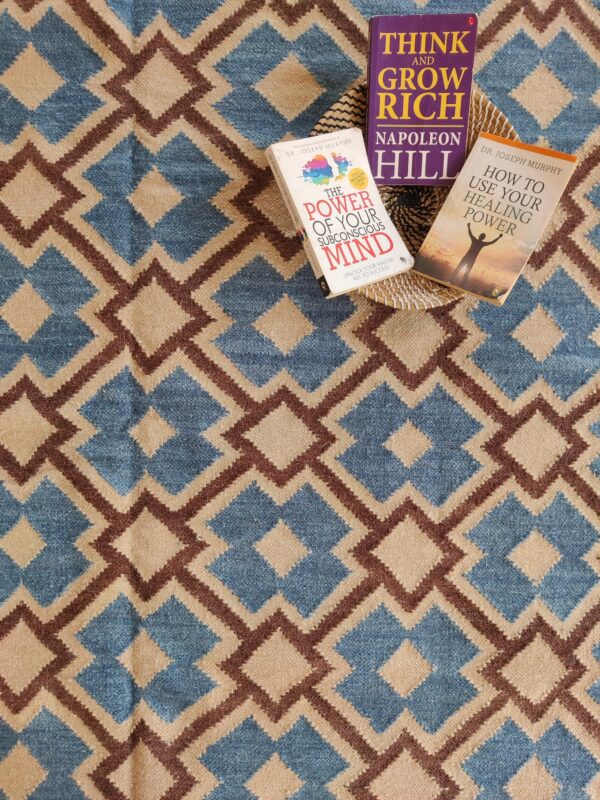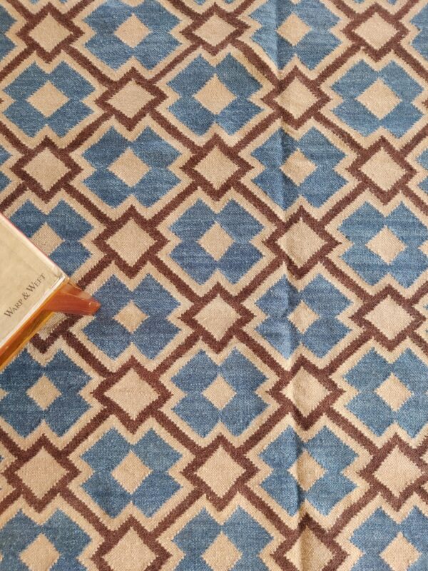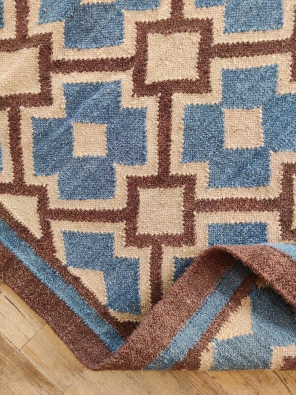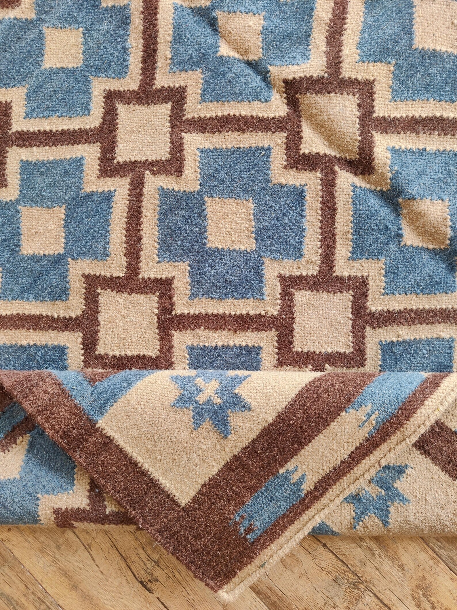 Handwoven Wool Blend Dhurrie Rug: Blue Brown Geometric Boho Decor Rug, Flatweave Wool Rug