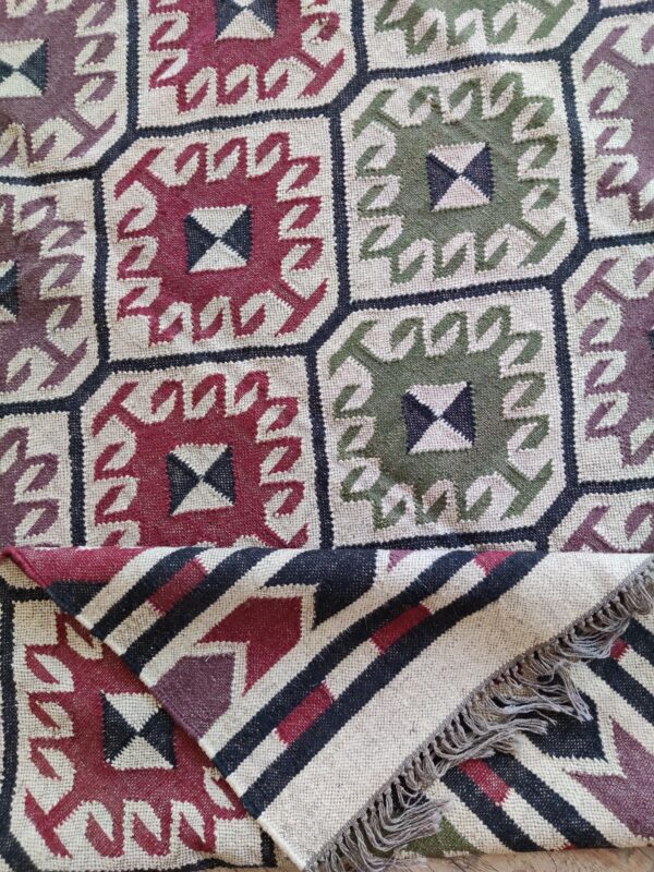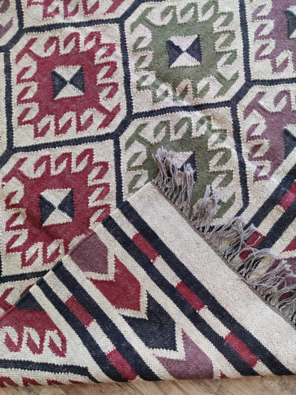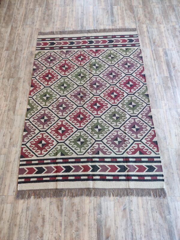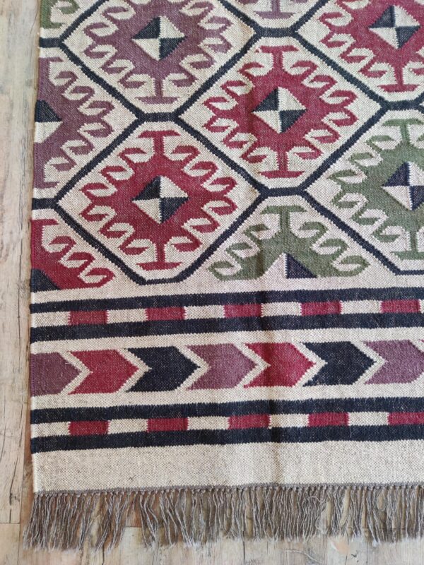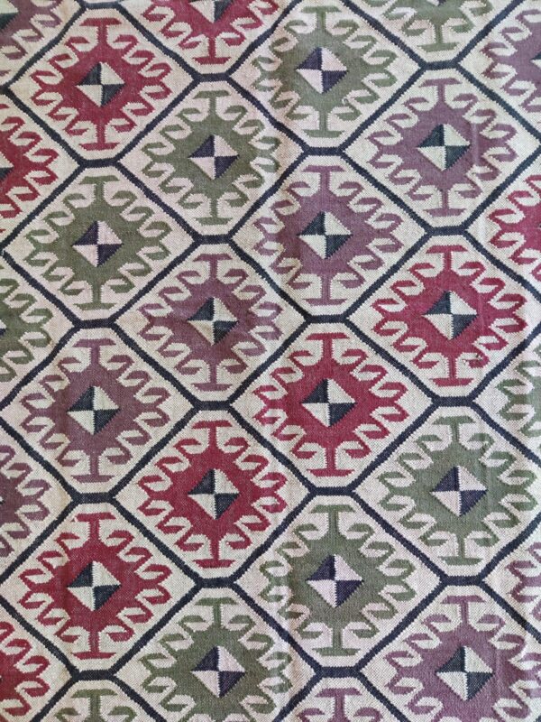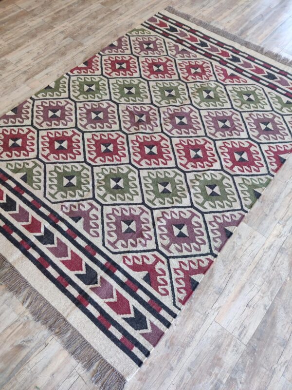 Handwoven Wool Jute Kilim Rug: Red, Green, Beige Diamond Pattern