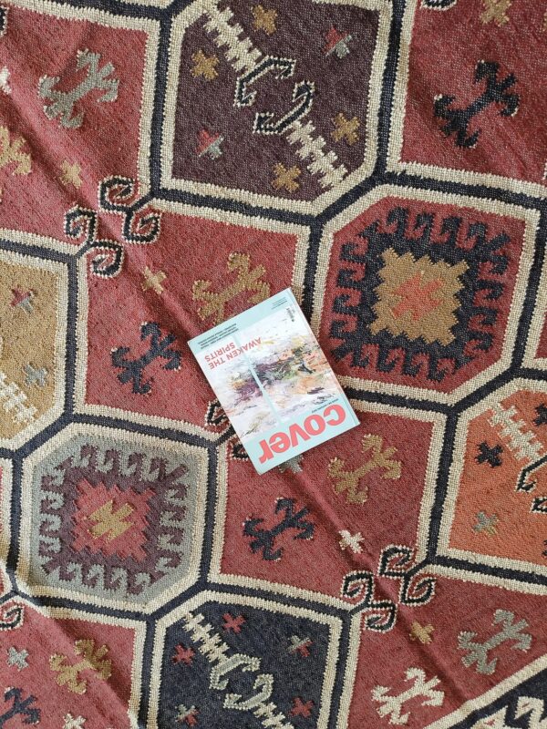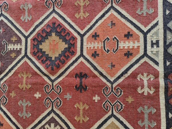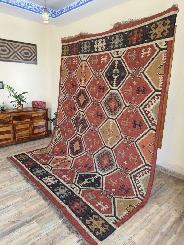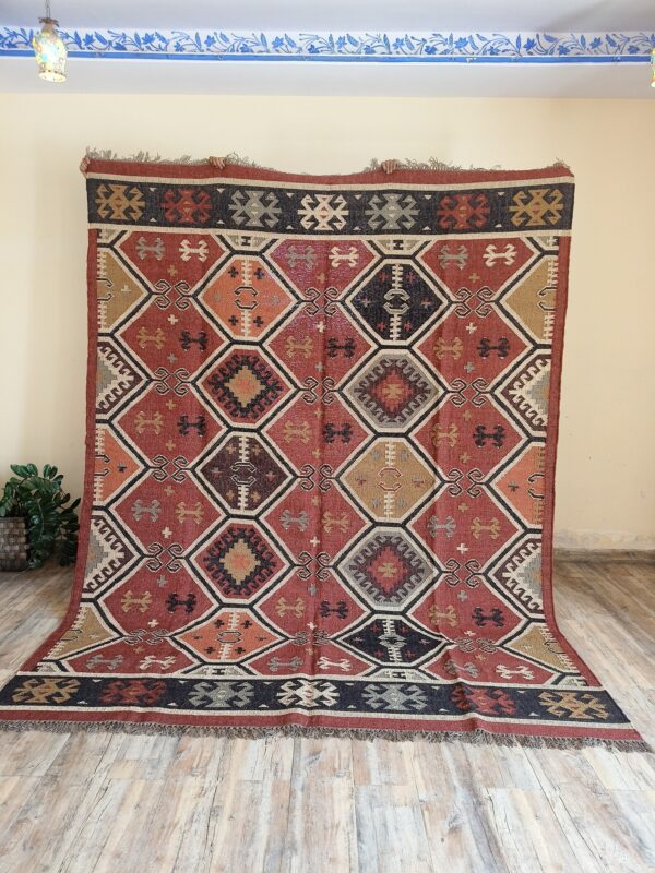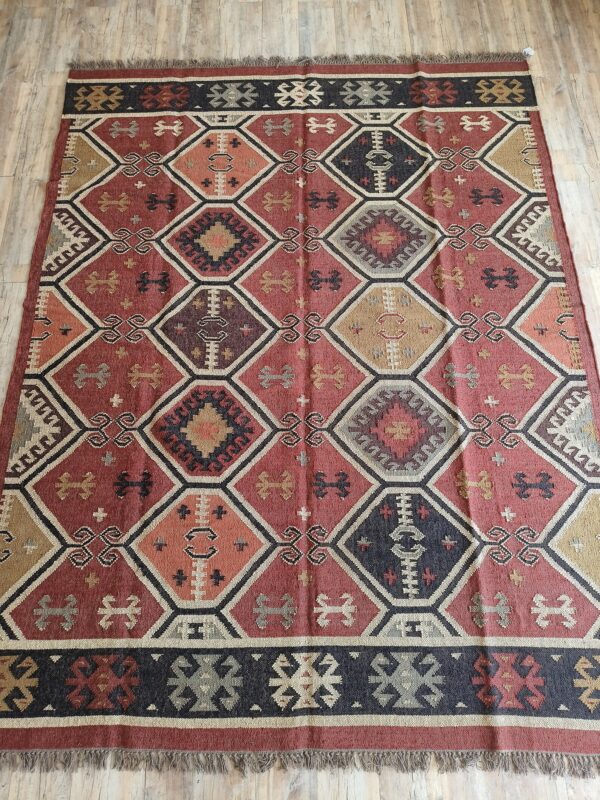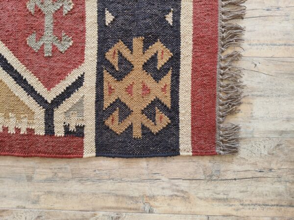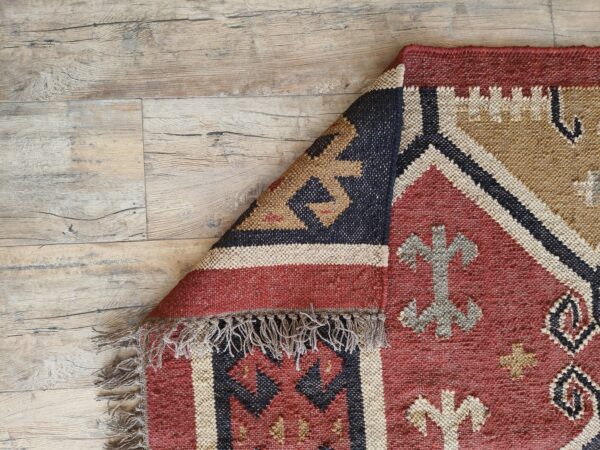The Geometric design of a rust-color weaves its way seamlessly into any space from coastal dining to urban sleeping. Jute kilim dhurrie construction.