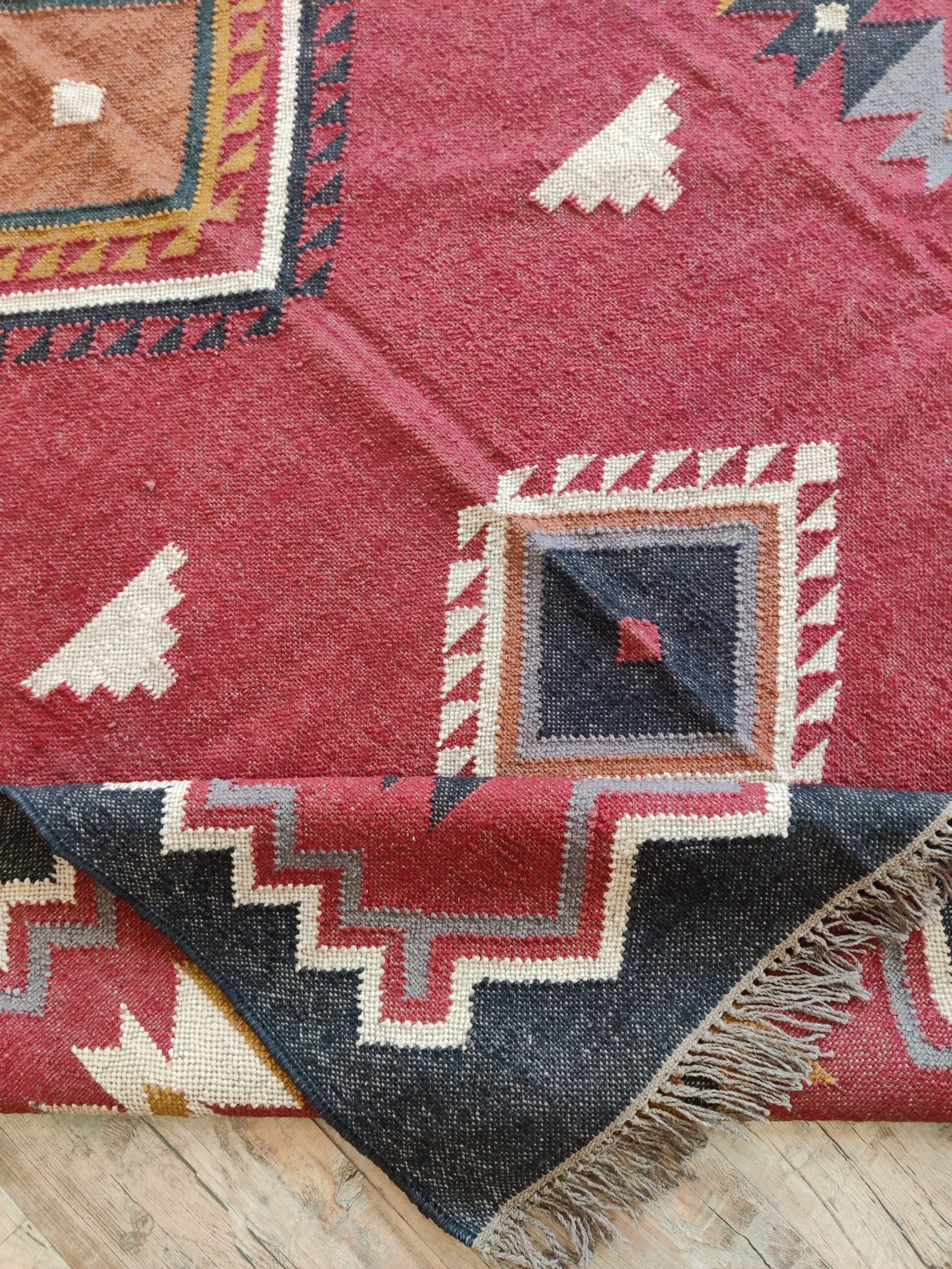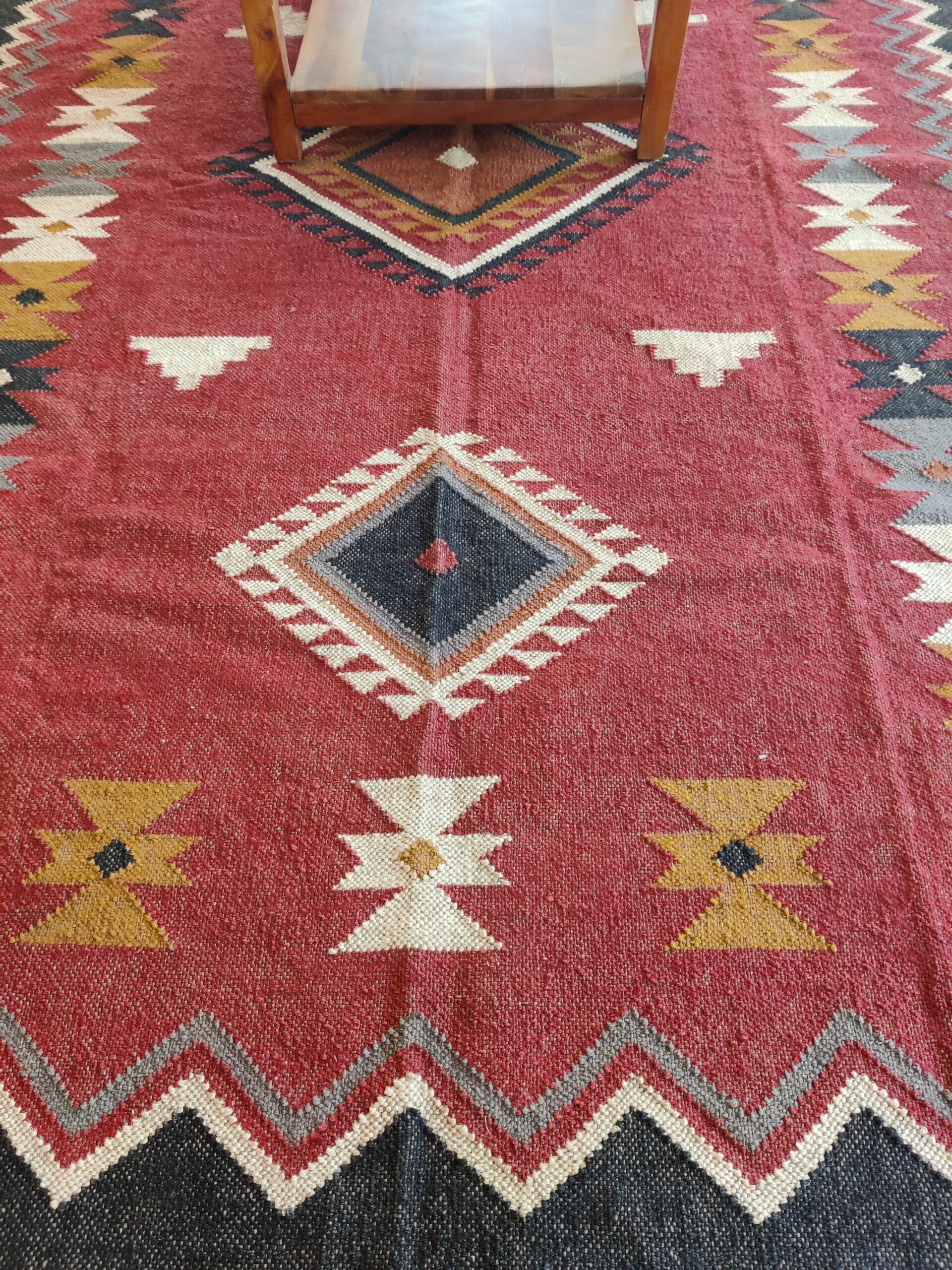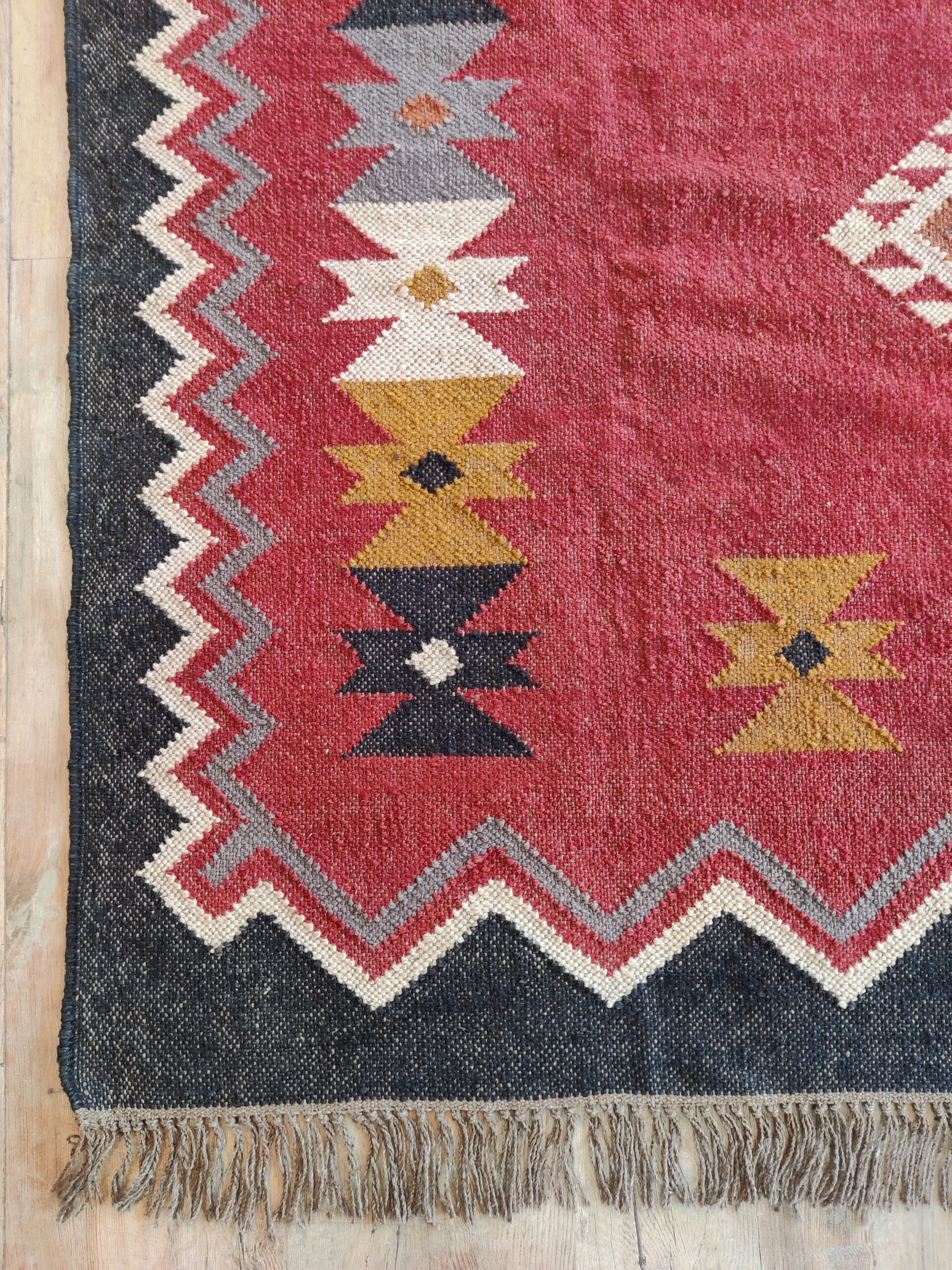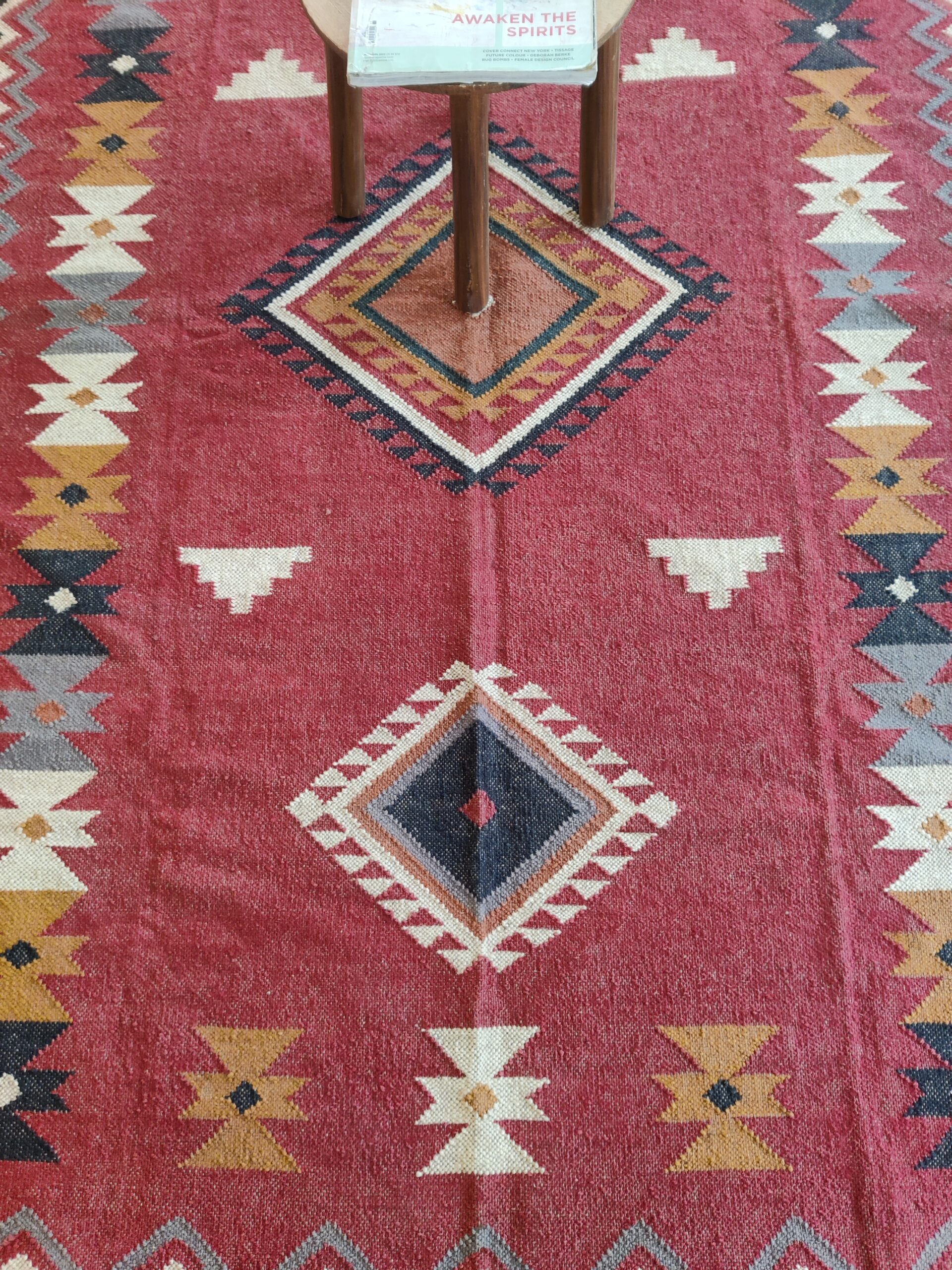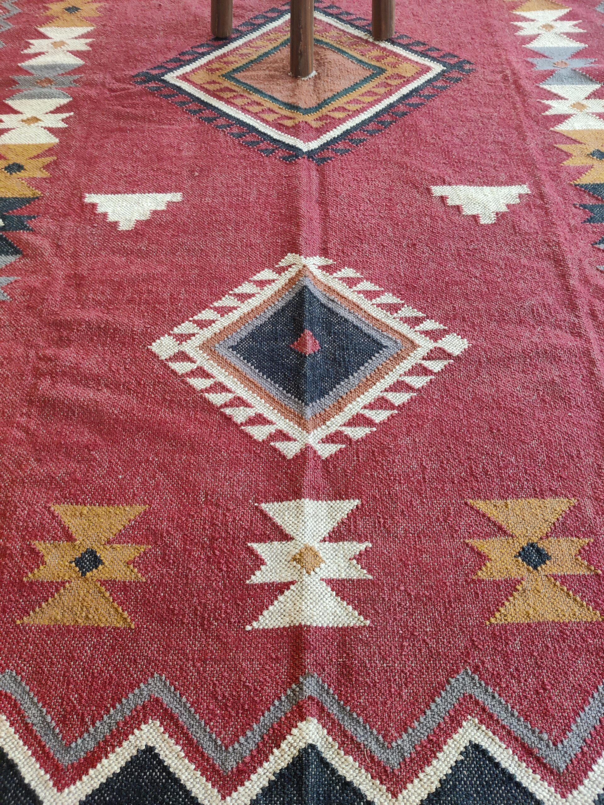 The Geometric design of a rust-color weaves its way seamlessly into any space from coastal dining to urban sleeping. Jute kilim dhurrie construction.