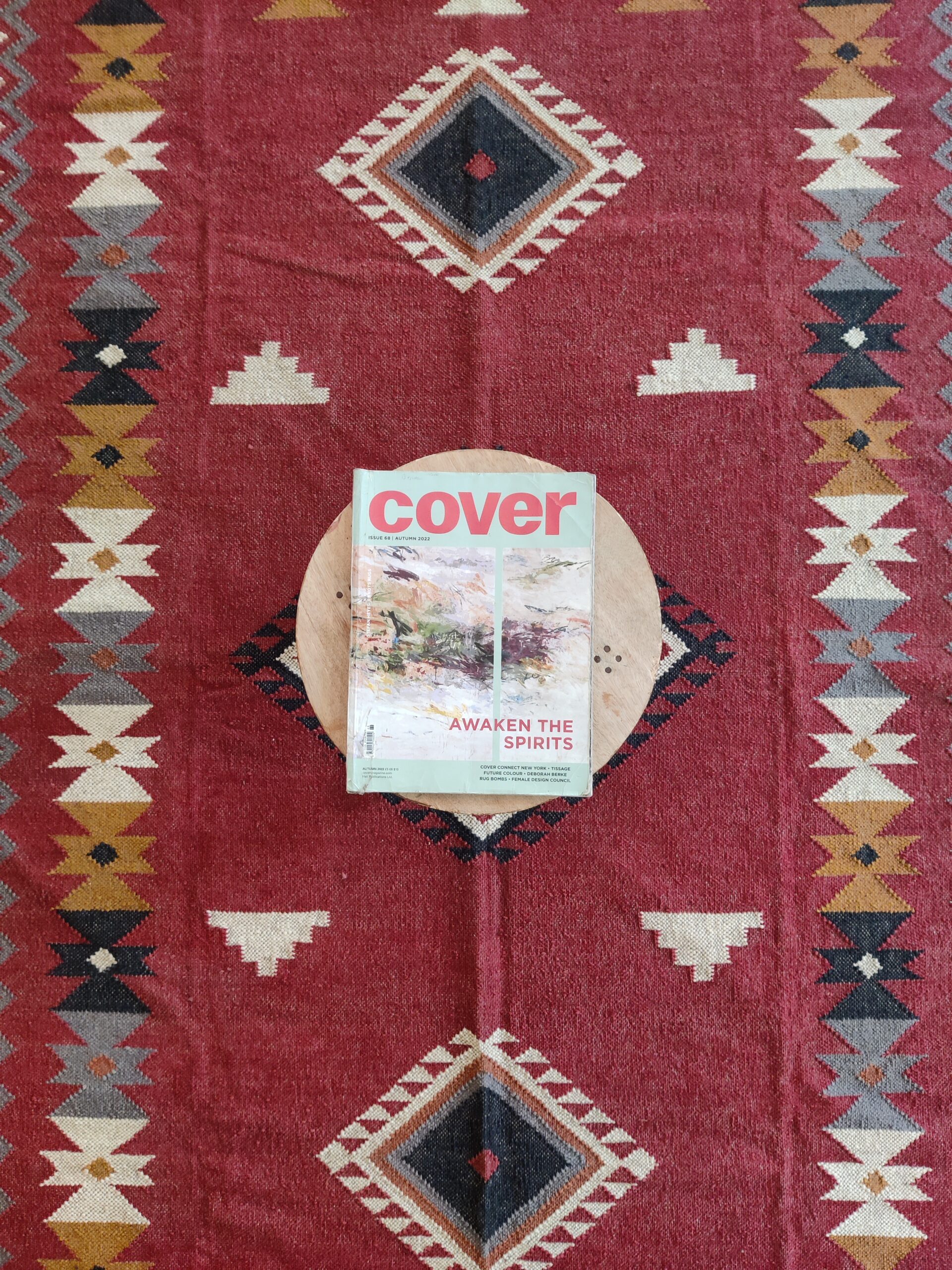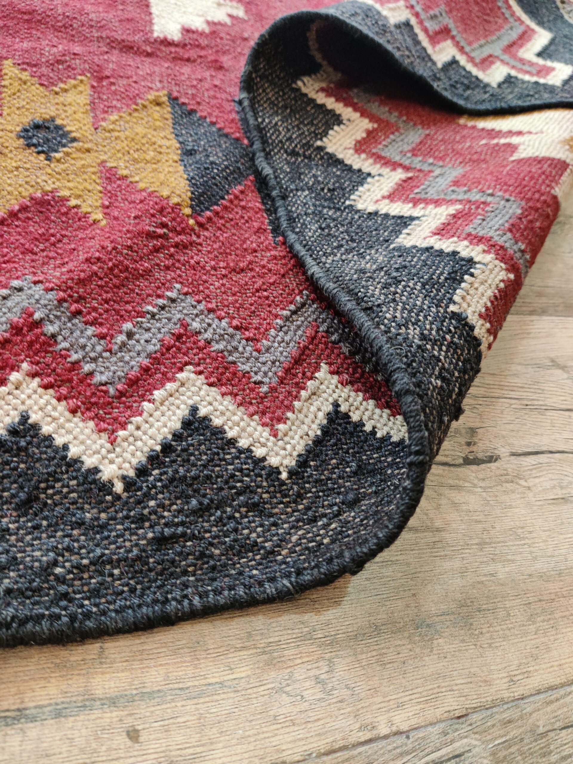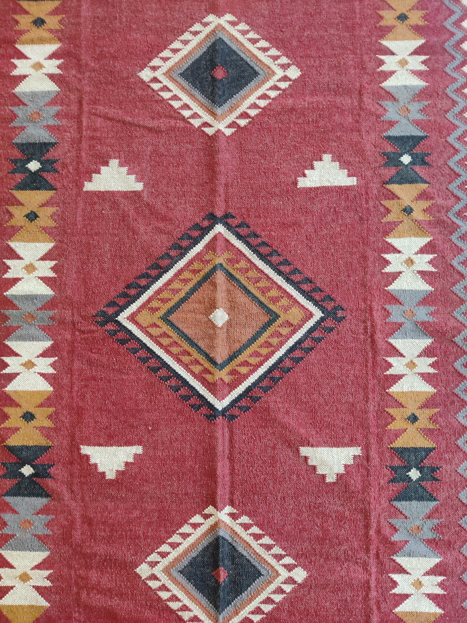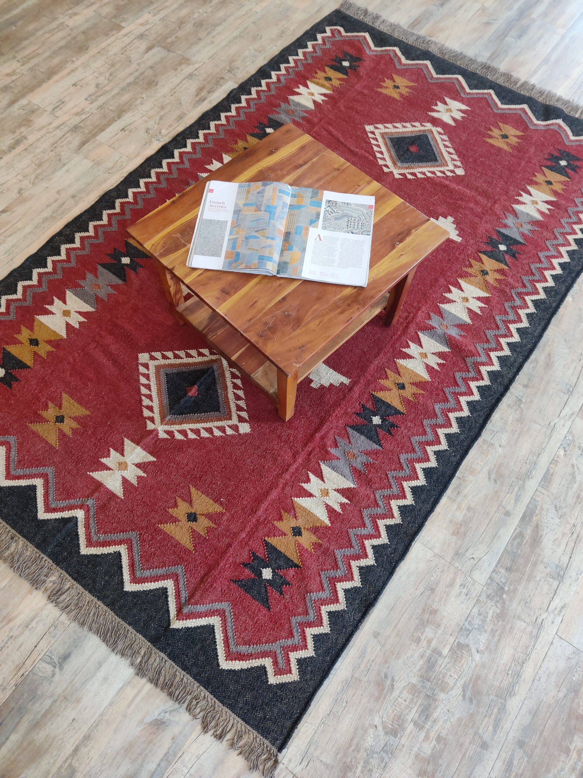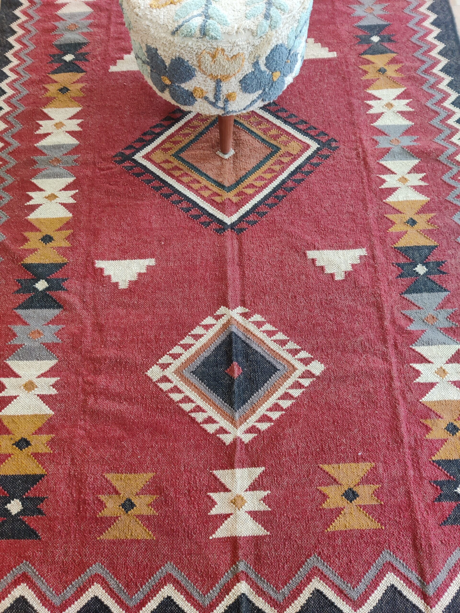 The Geometric design of a rust-color weaves its way seamlessly into any space from coastal dining to urban sleeping. Jute kilim dhurrie construction.