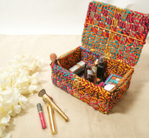 Give your indoor and outdoor small potted plants an elevated view with this natural jute and upcycled plastic wrapper planter box. Featuring a chevron weave woven by skilled female artisans, the boxy style works great against walls or on a window sill. Ensure to water the plant, let excess drain, and then add it back to the planter to retain structure.