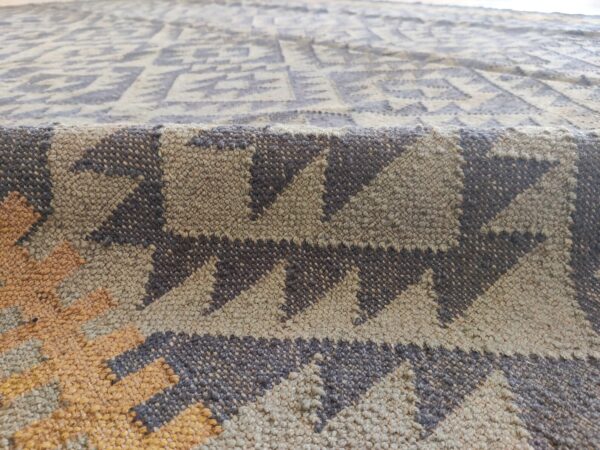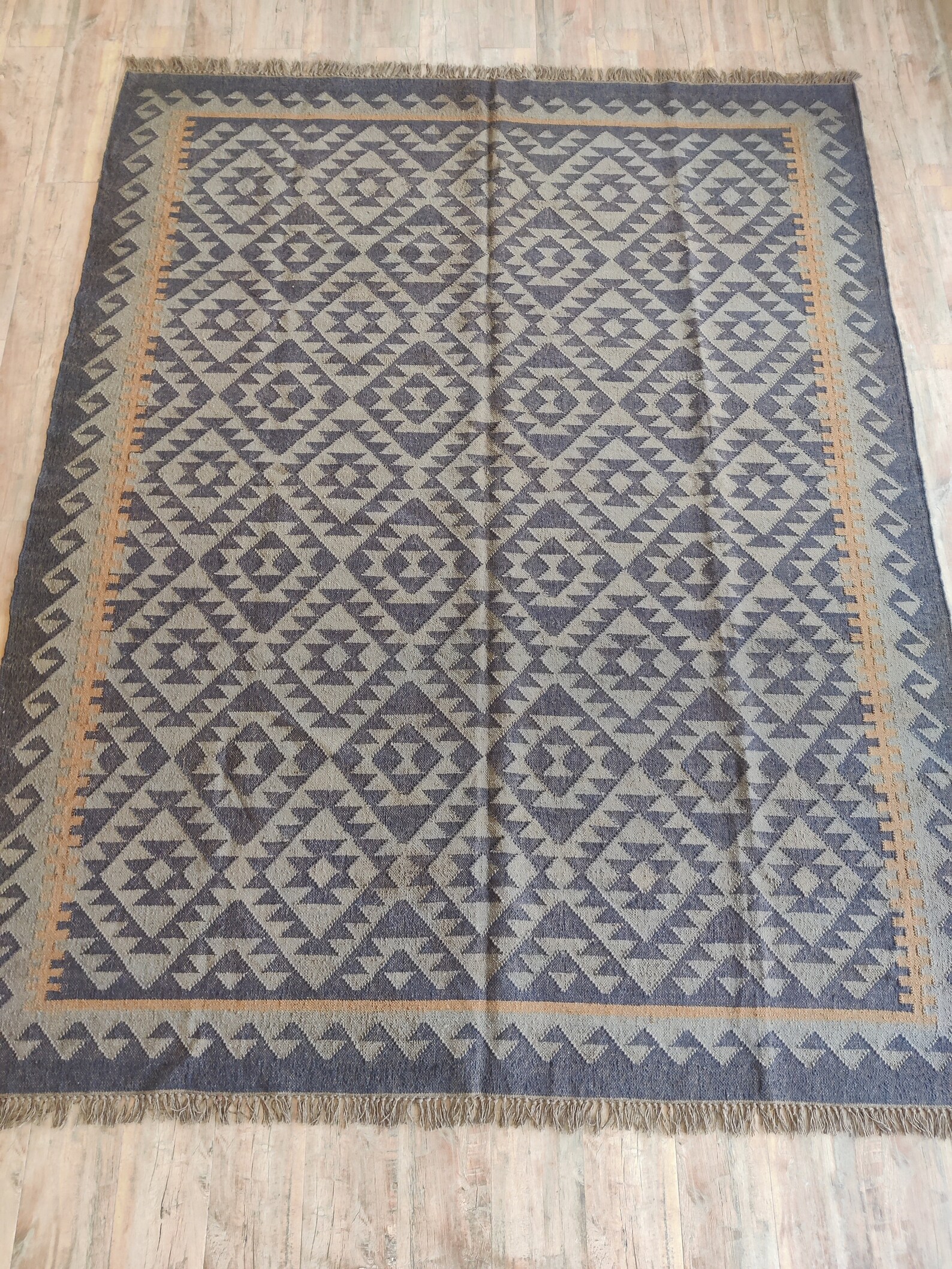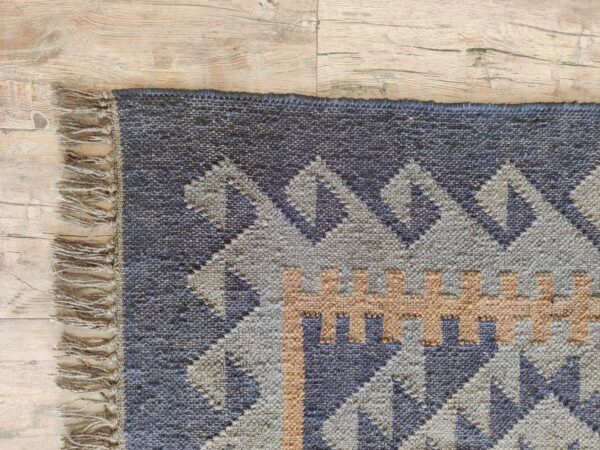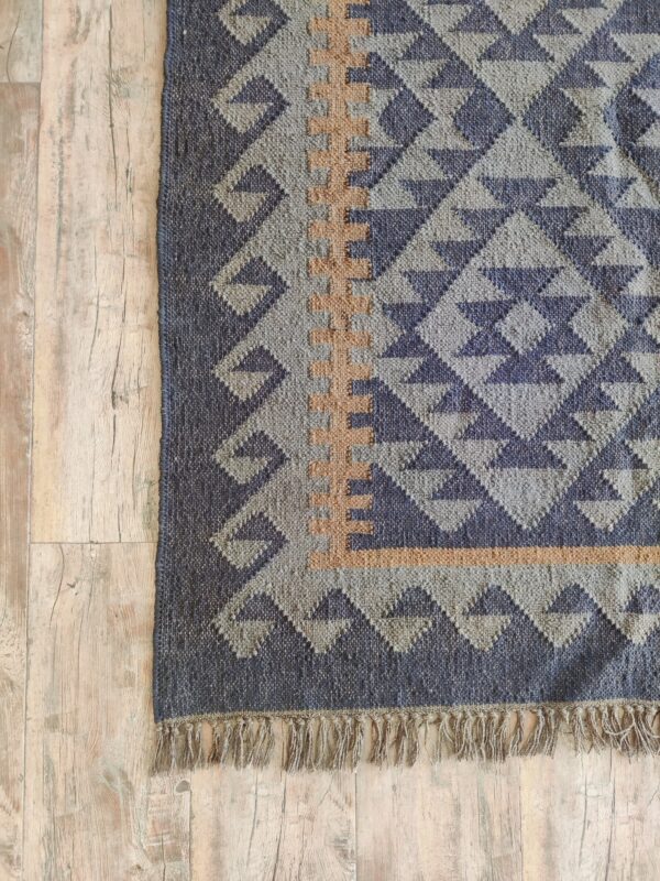 The Geometric design of a rust-color weaves its way seamlessly into any space from coastal dining to urban sleeping. Jute kilim dhurrie construction.