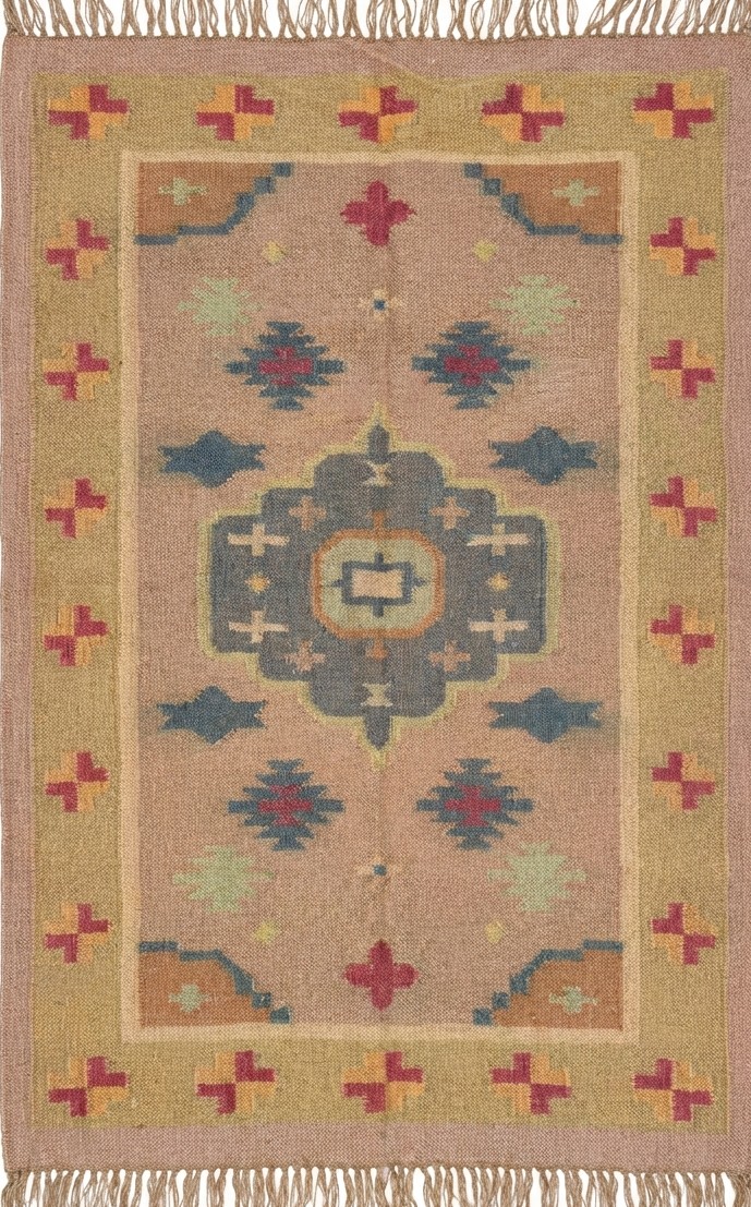The Geometric design of a rust-color weaves its way seamlessly into any space from coastal dining to urban sleeping. Jute kilim dhurrie construction.