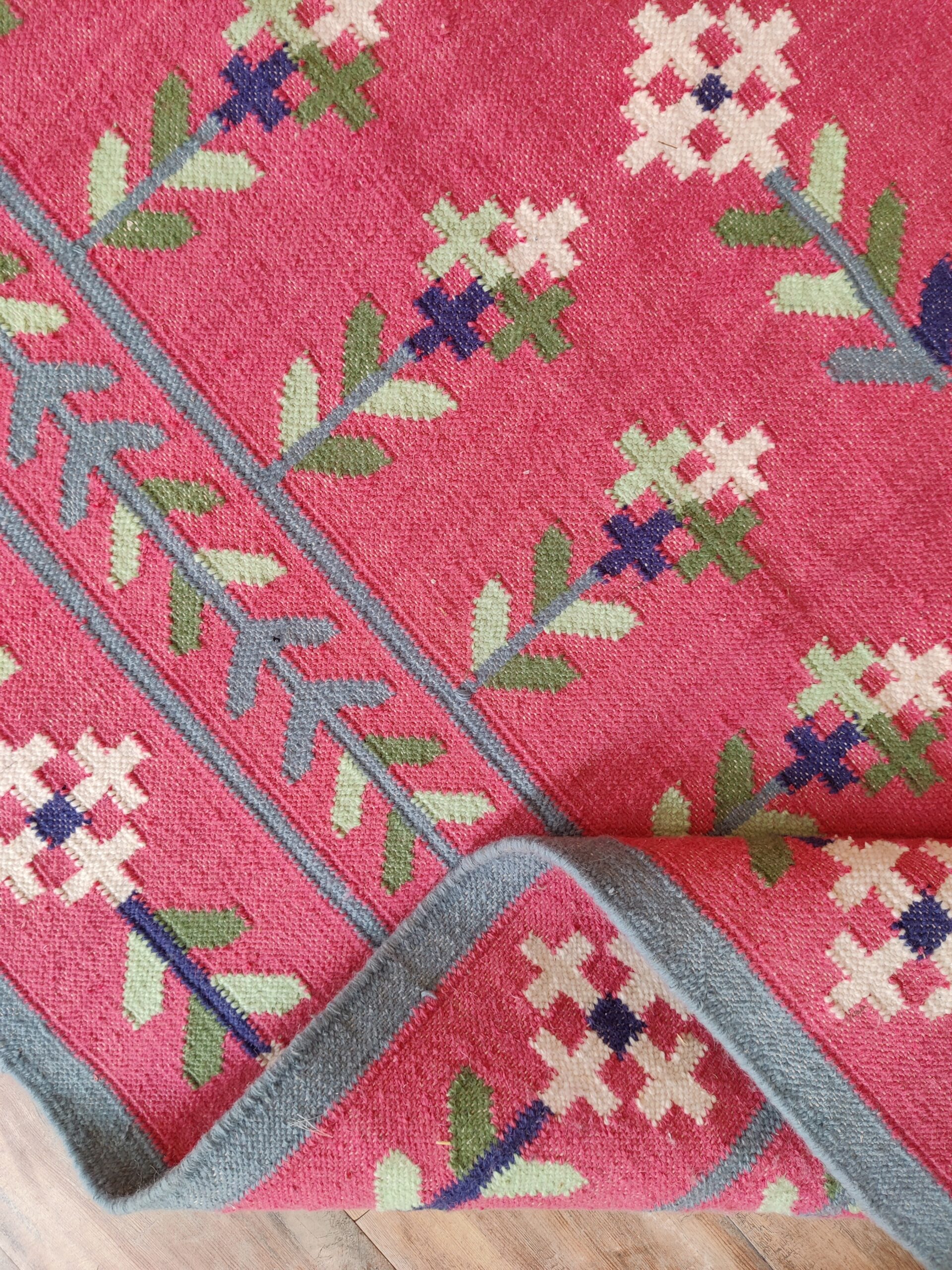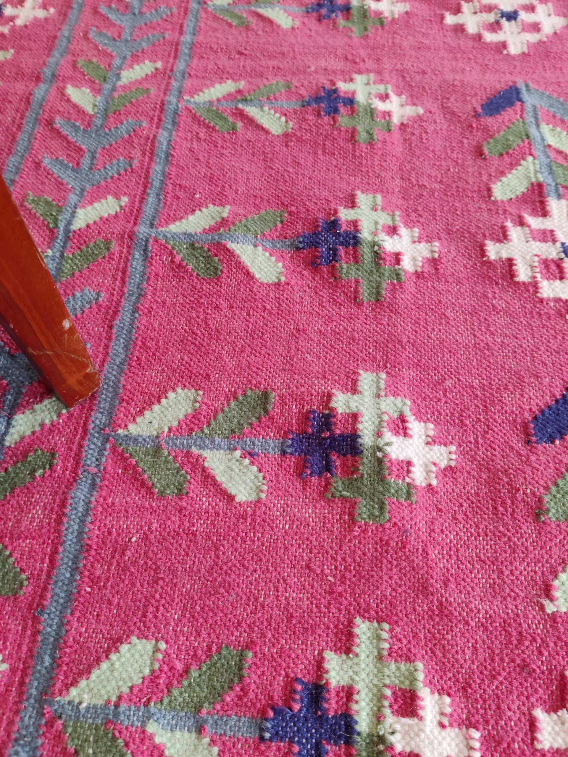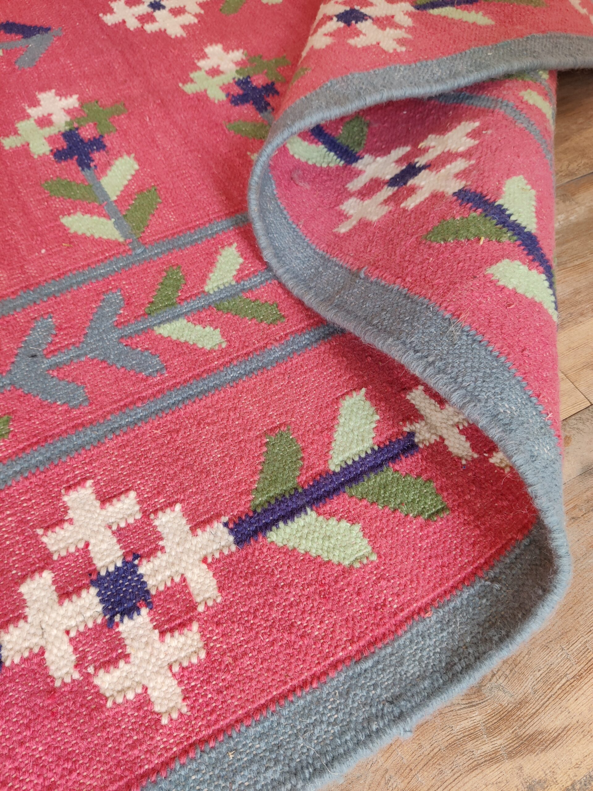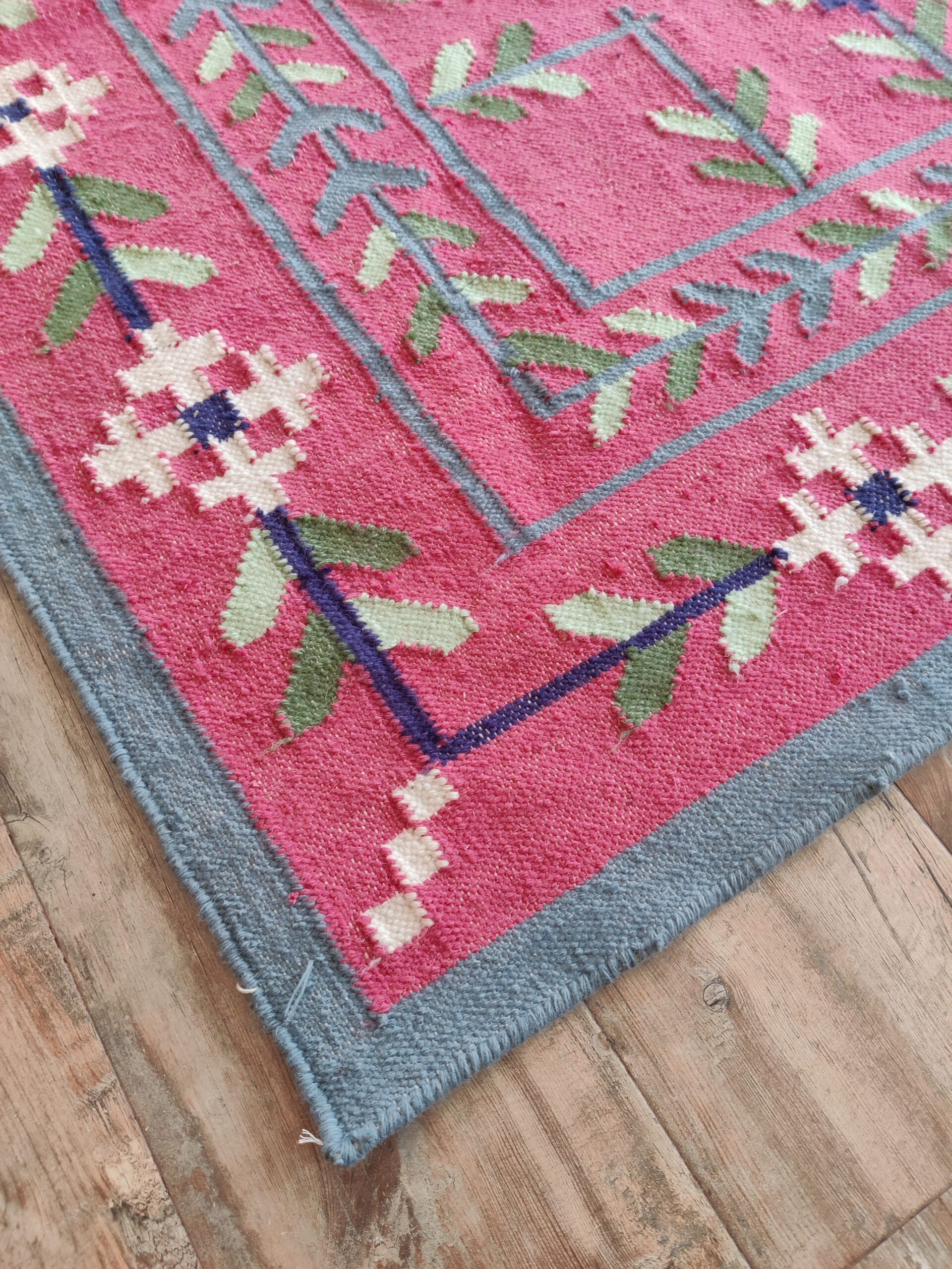 Pink And Green Floral Pattern Designer Rug, Cotton Wool Kilim Rug, Custom Size Rug