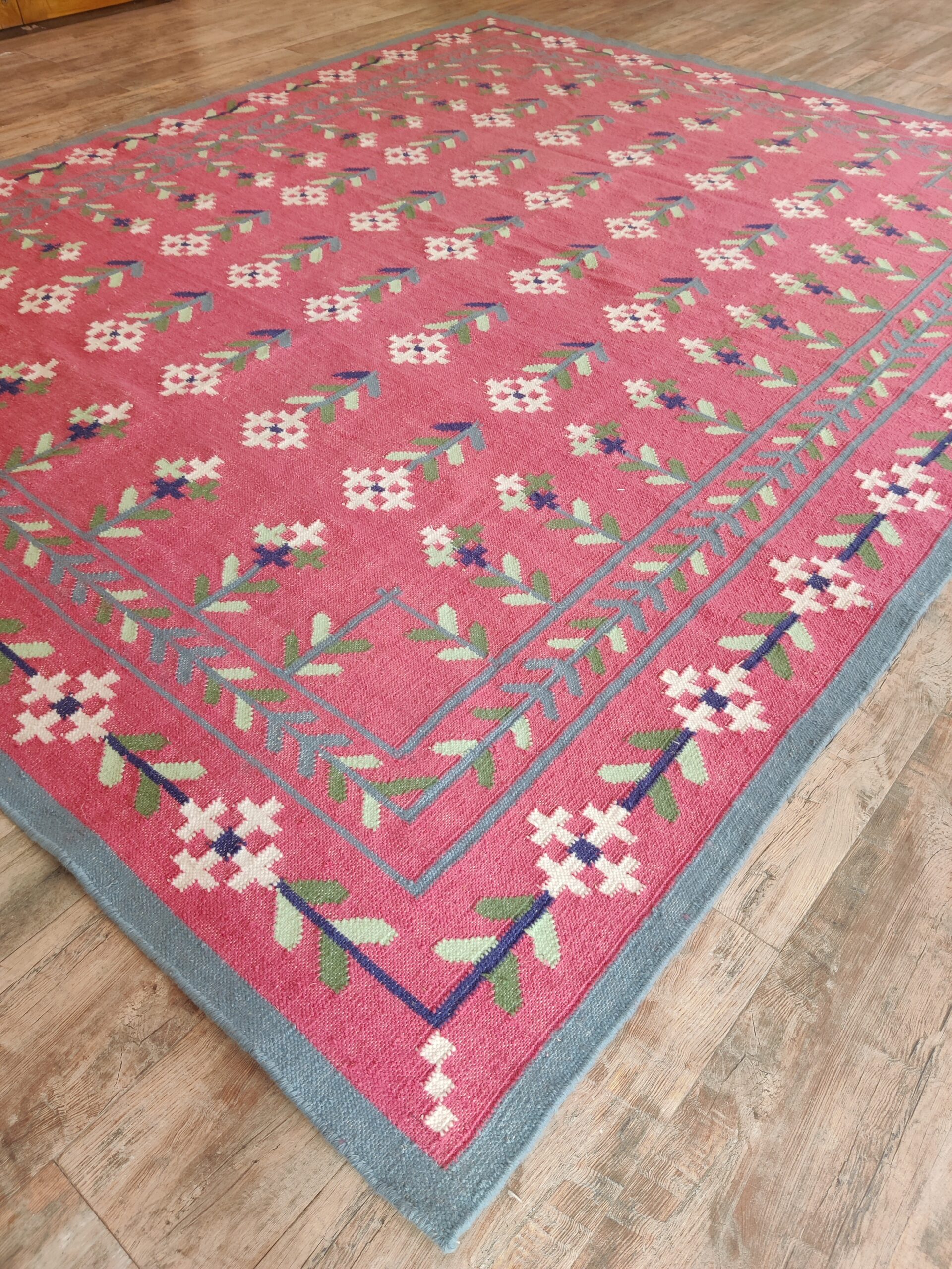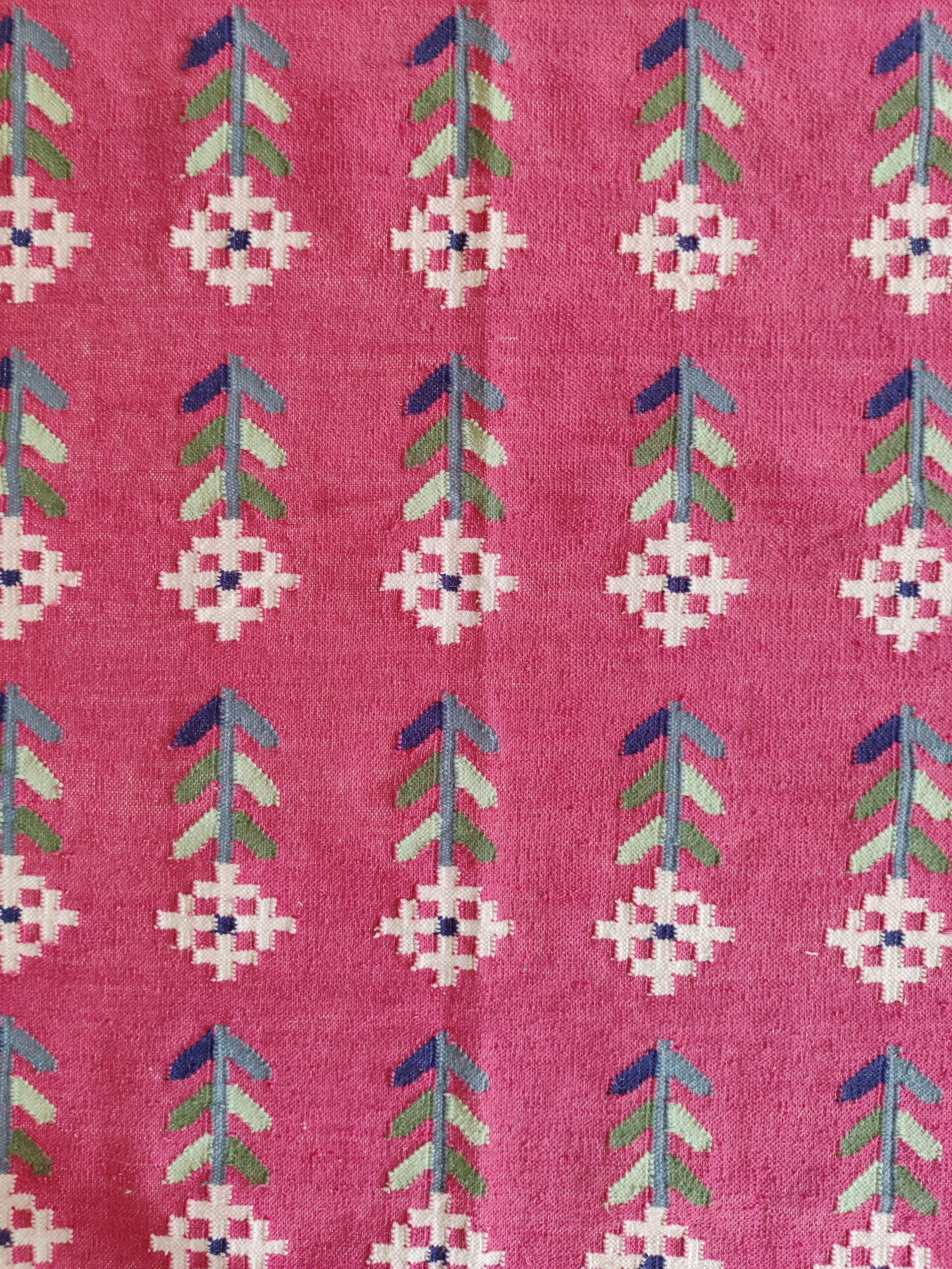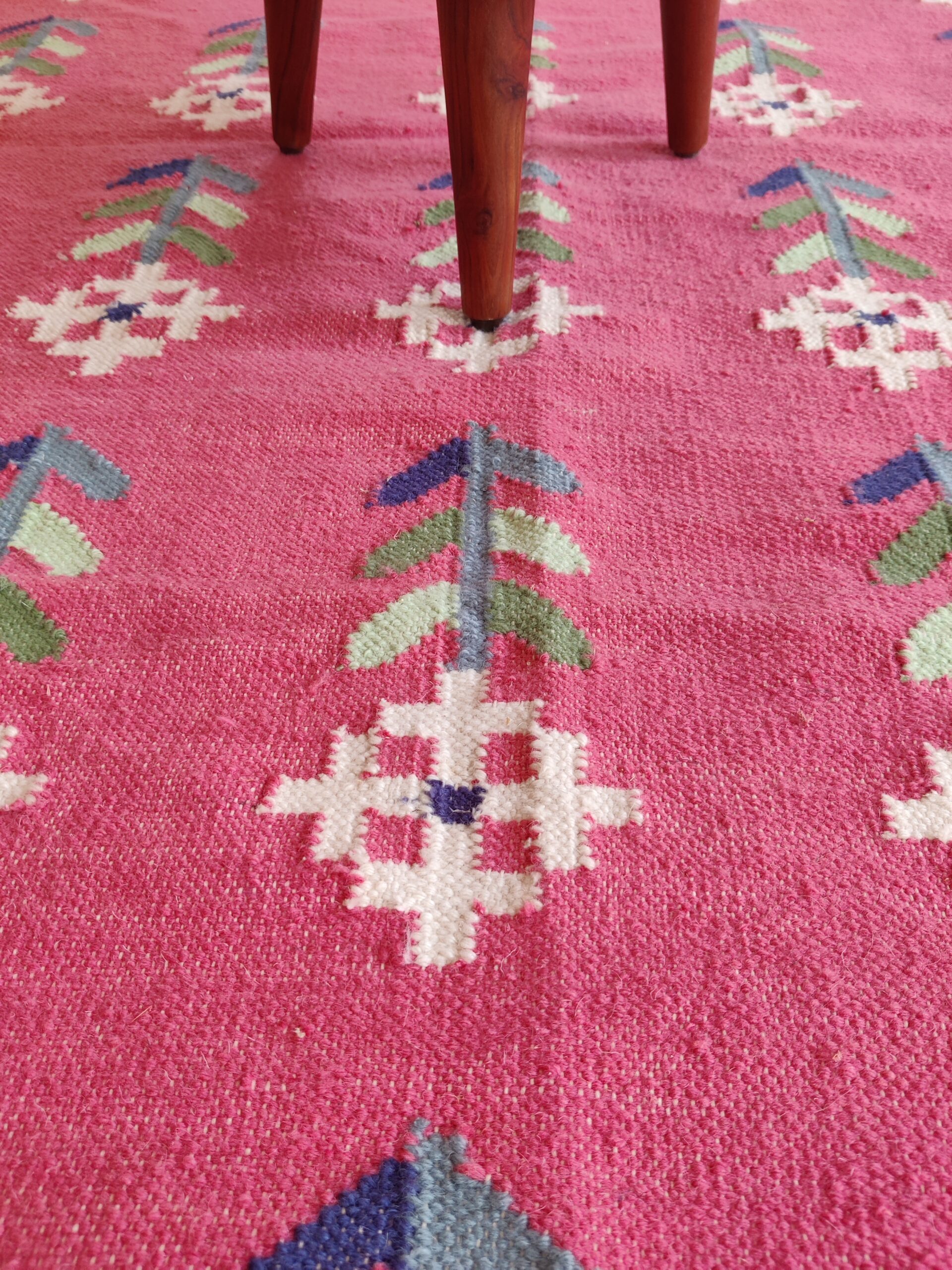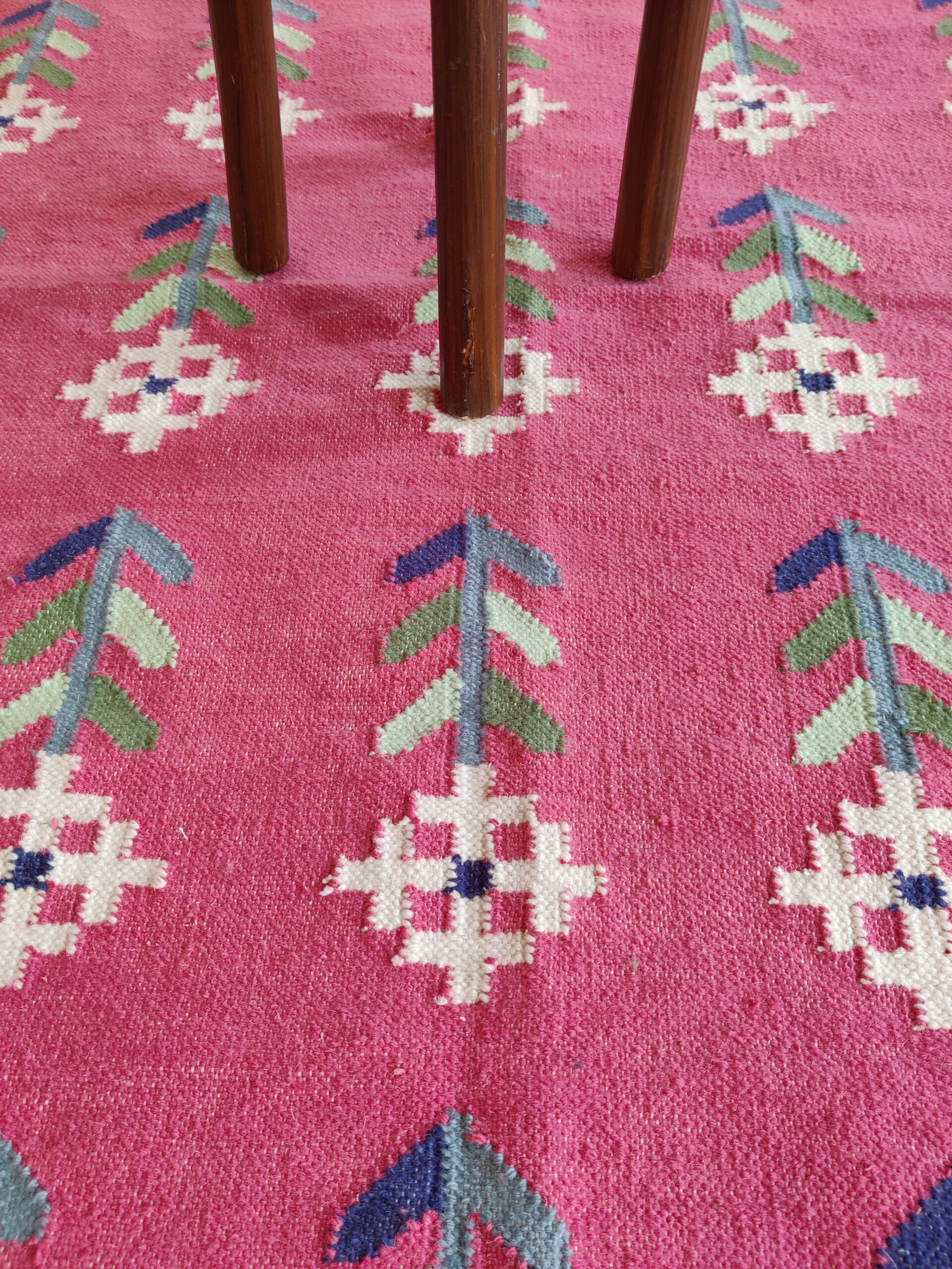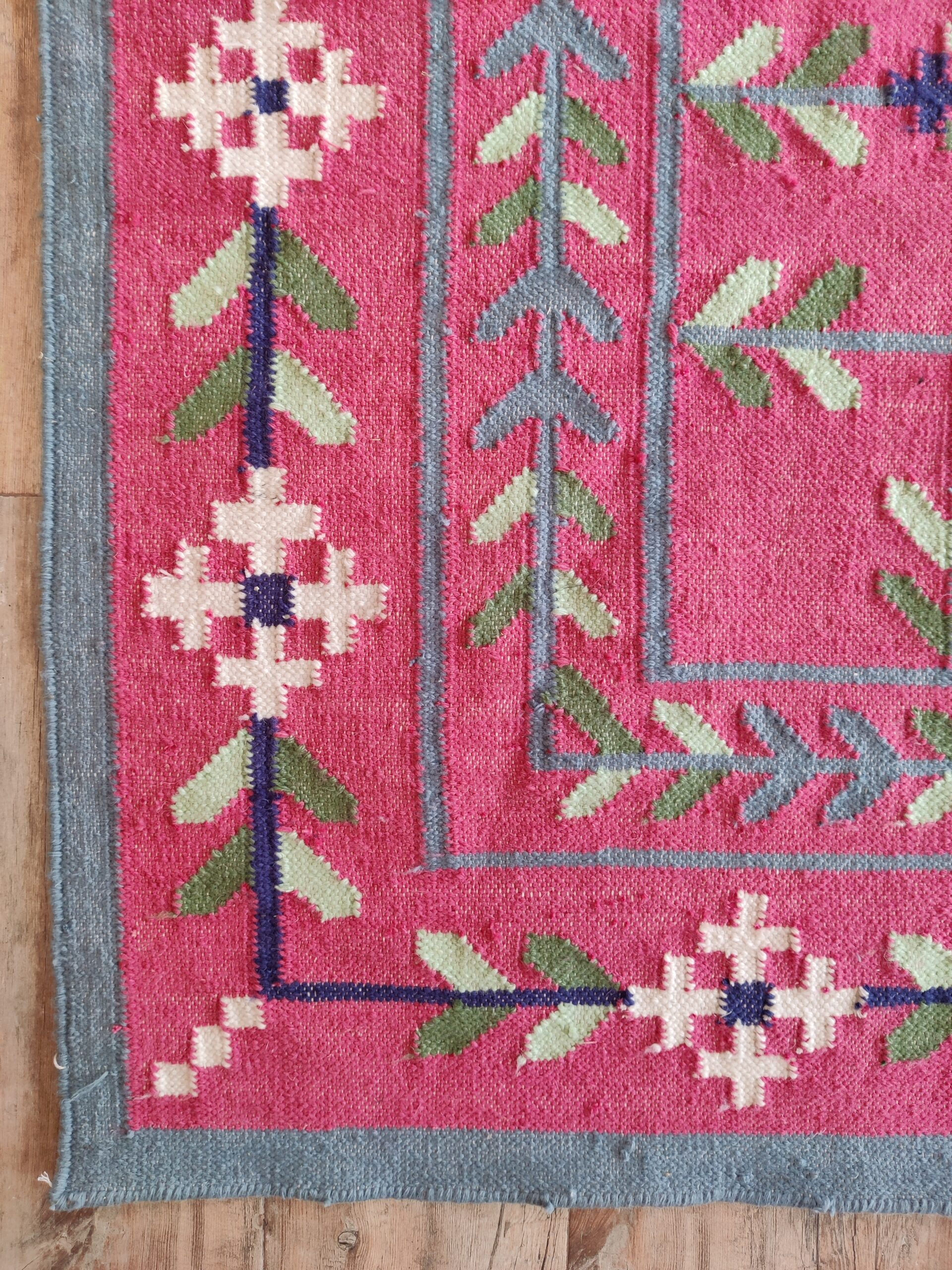 Pink And Green Floral Pattern Designer Rug, Cotton Wool Kilim Rug, Custom Size Rug