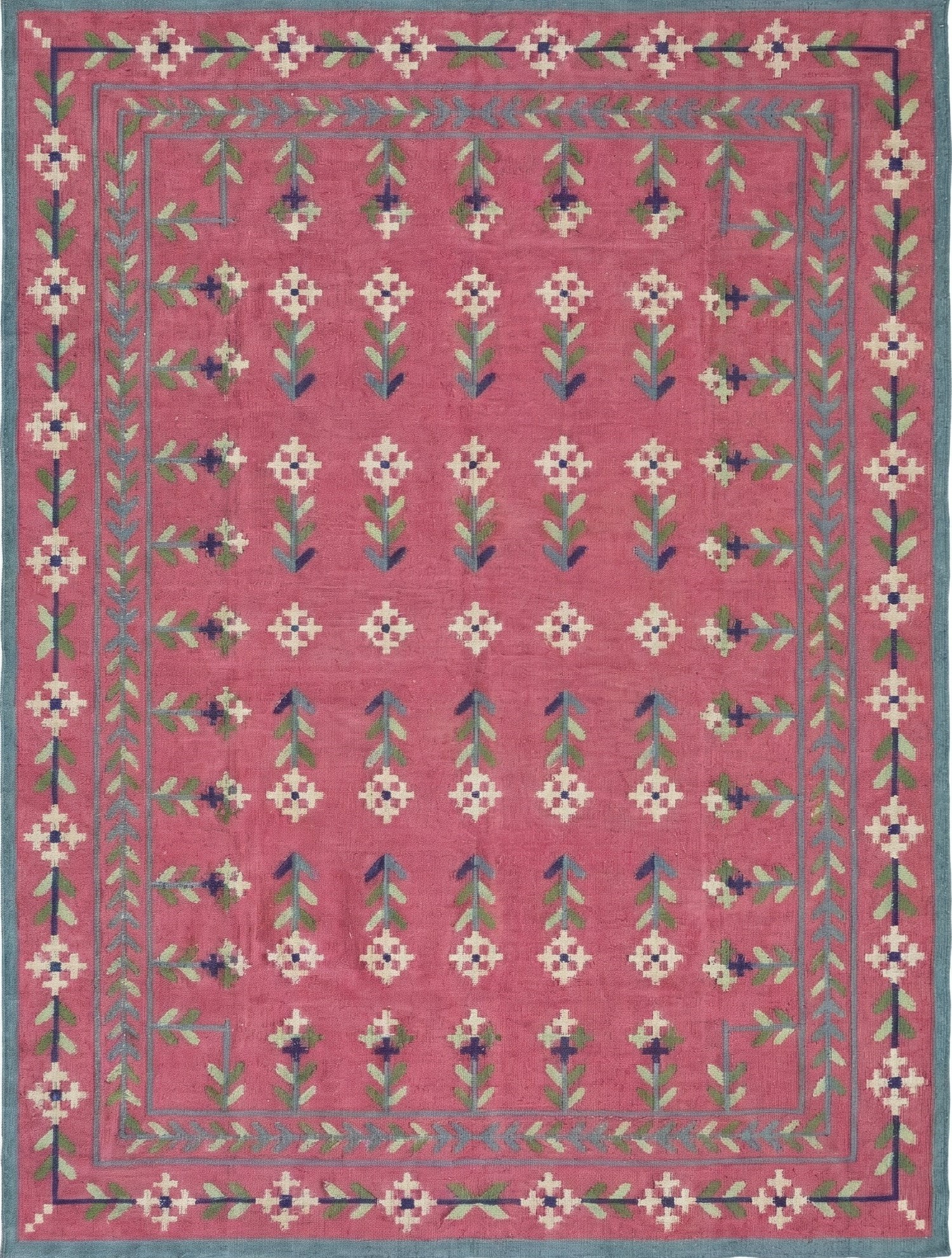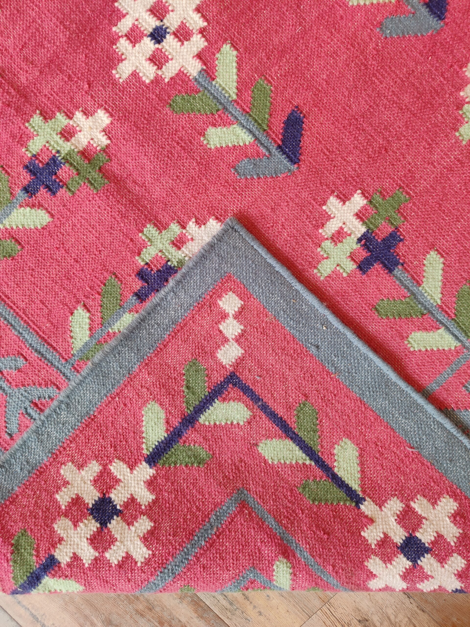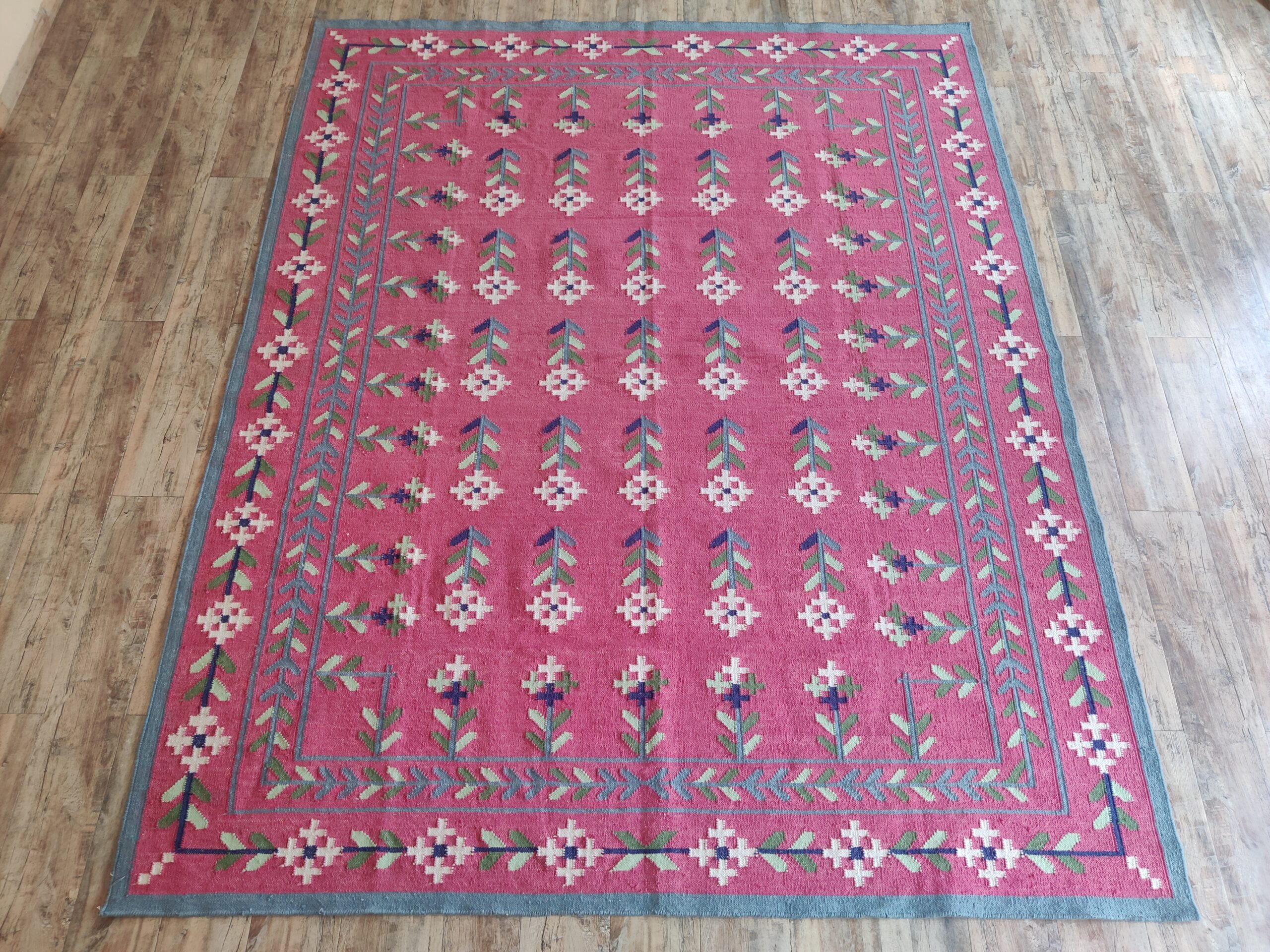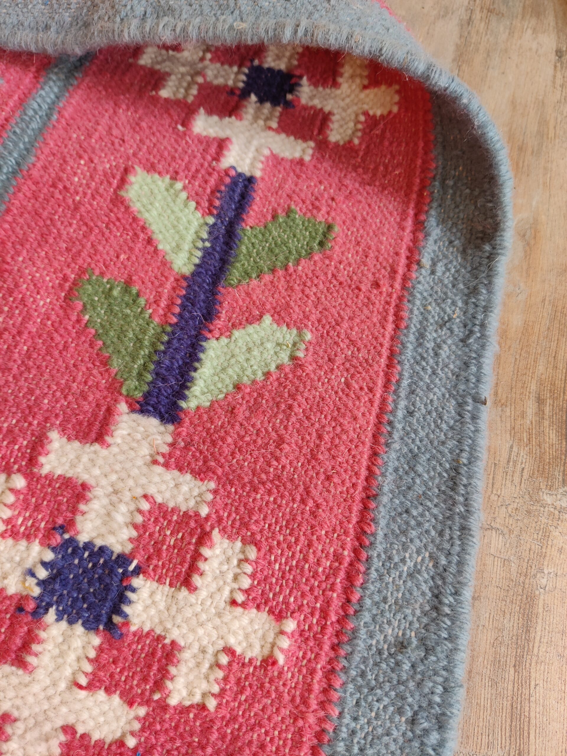 Pink And Green Floral Pattern Designer Rug, Cotton Wool Kilim Rug, Custom Size Rug