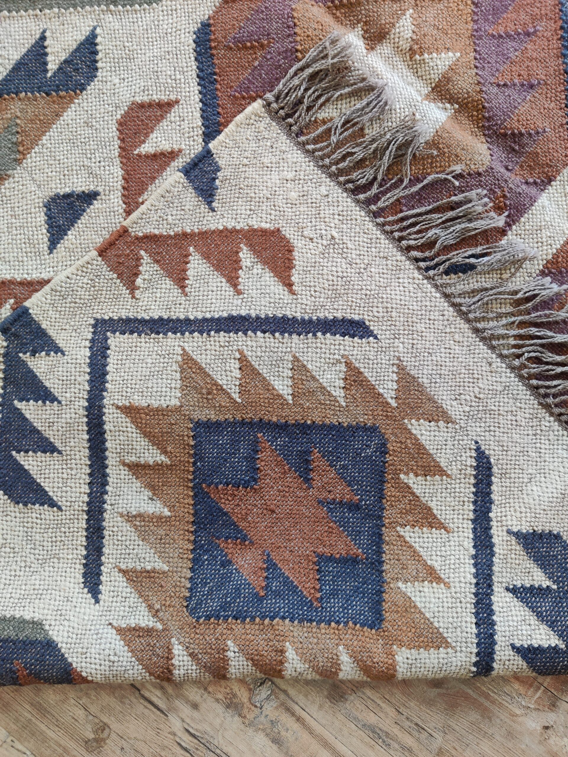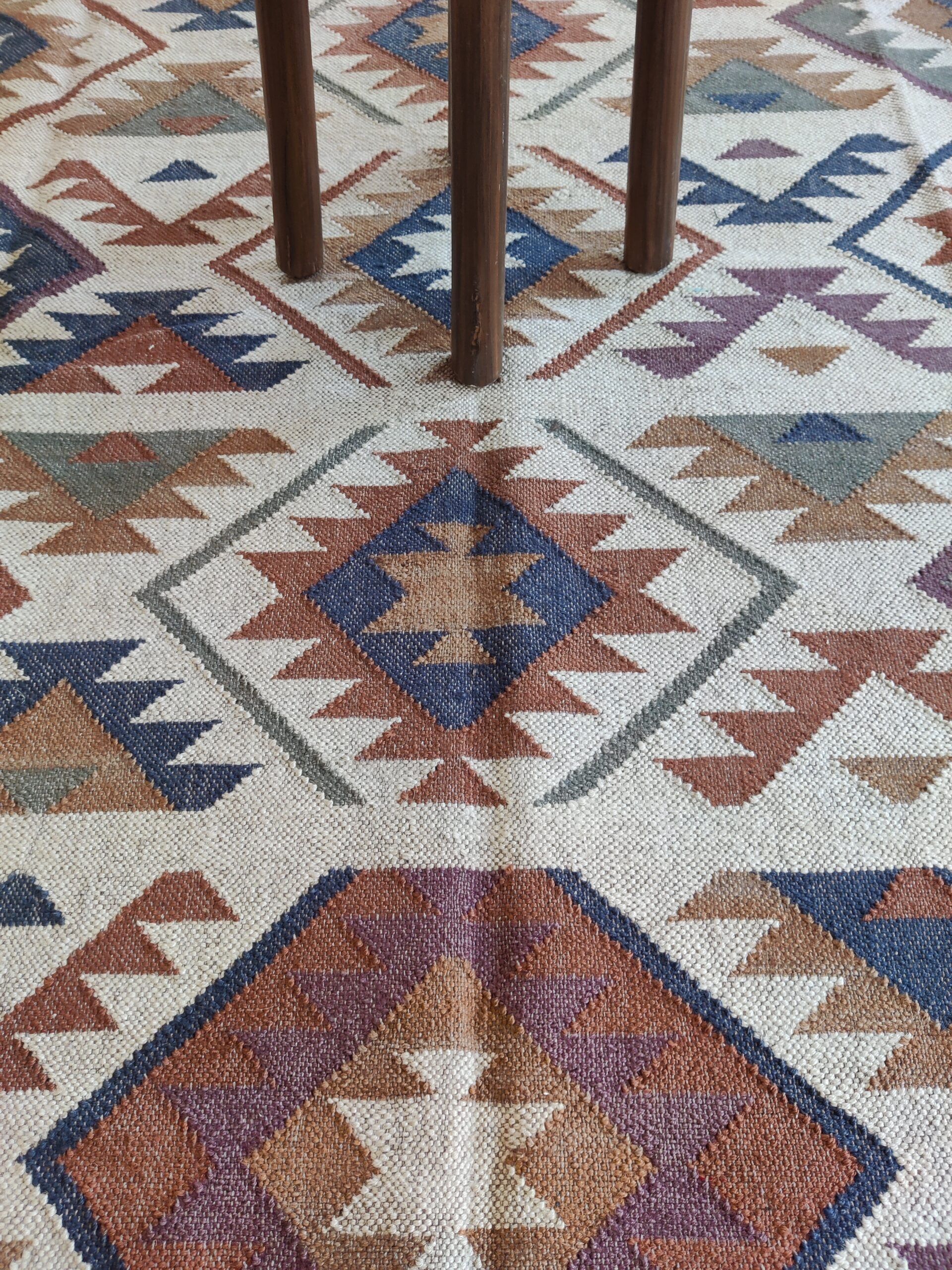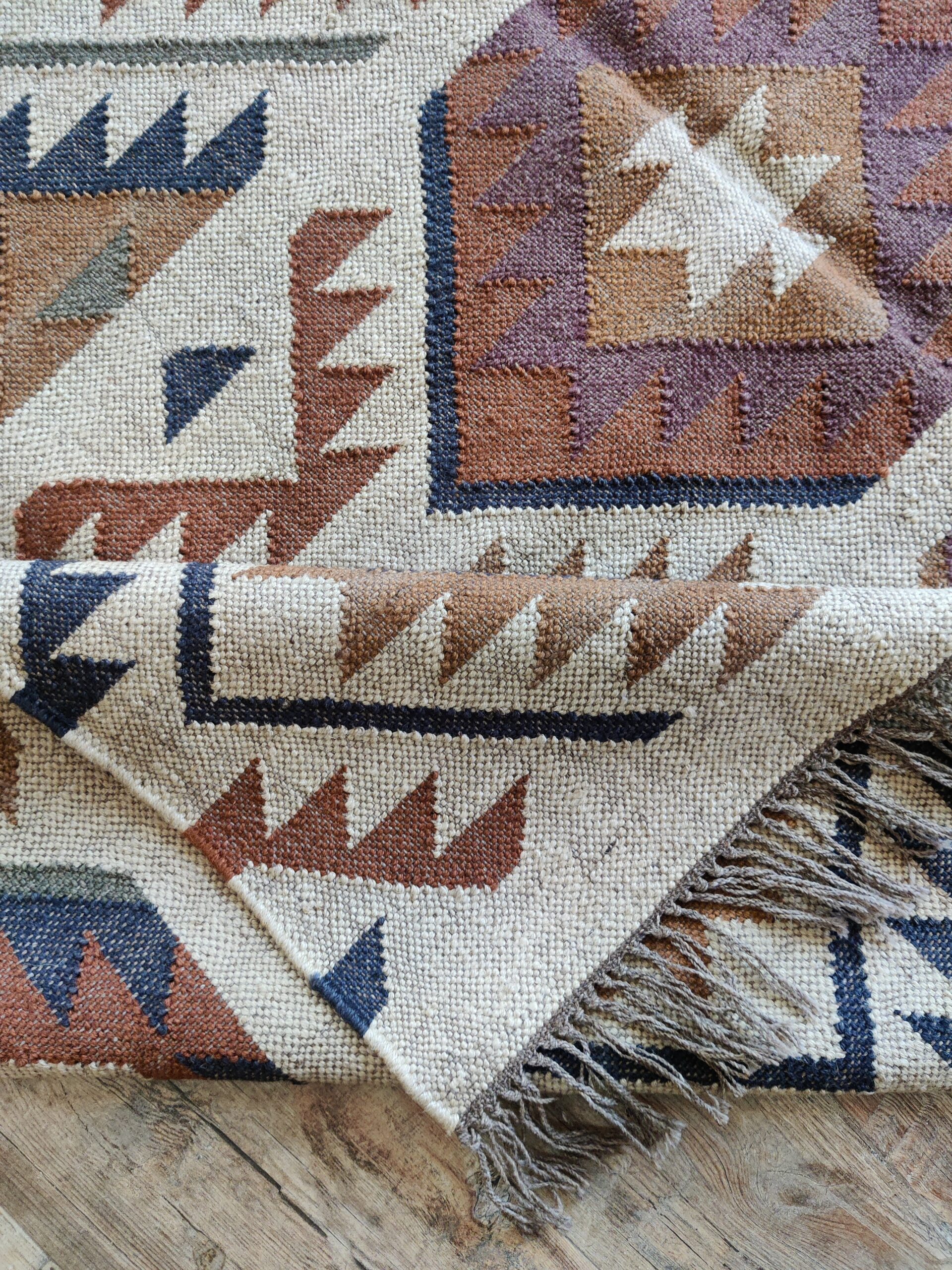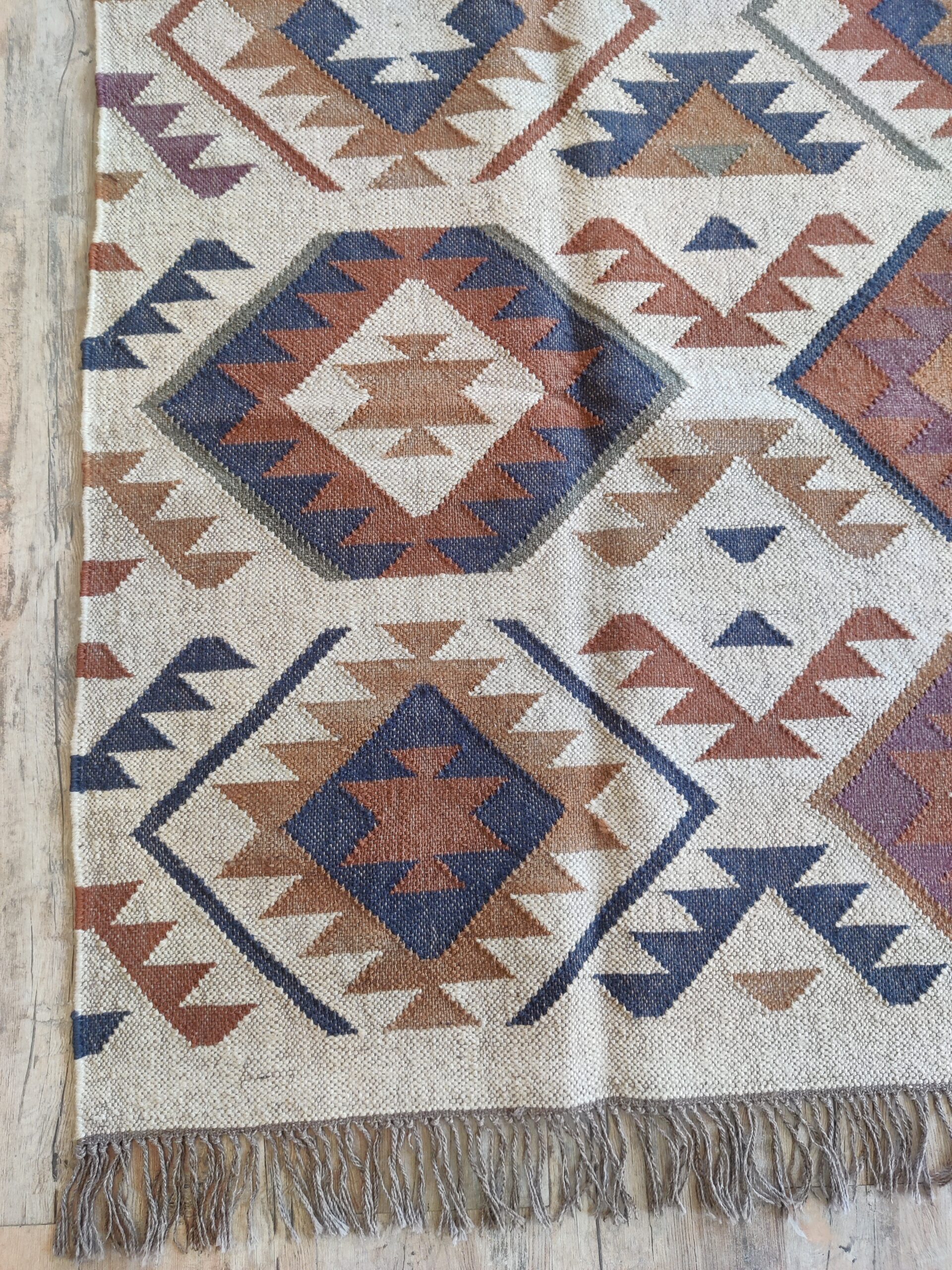 The Geometric design of a rust-color weaves its way seamlessly into any space from coastal dining to urban sleeping. Jute kilim dhurrie construction.