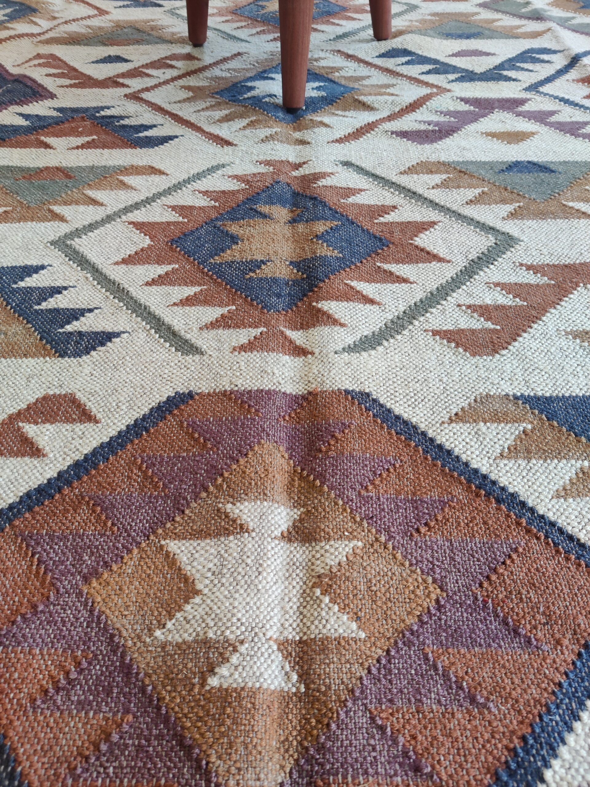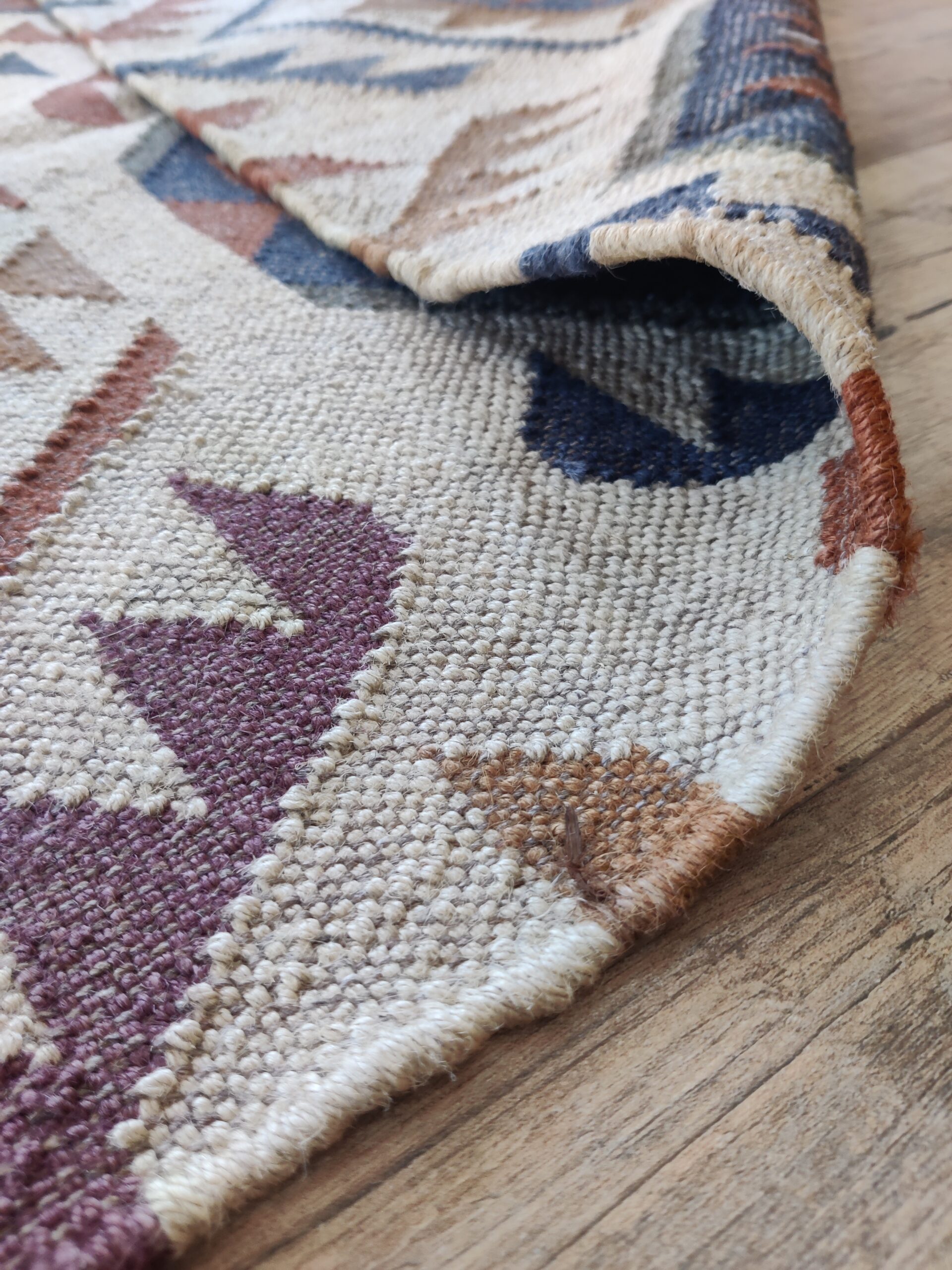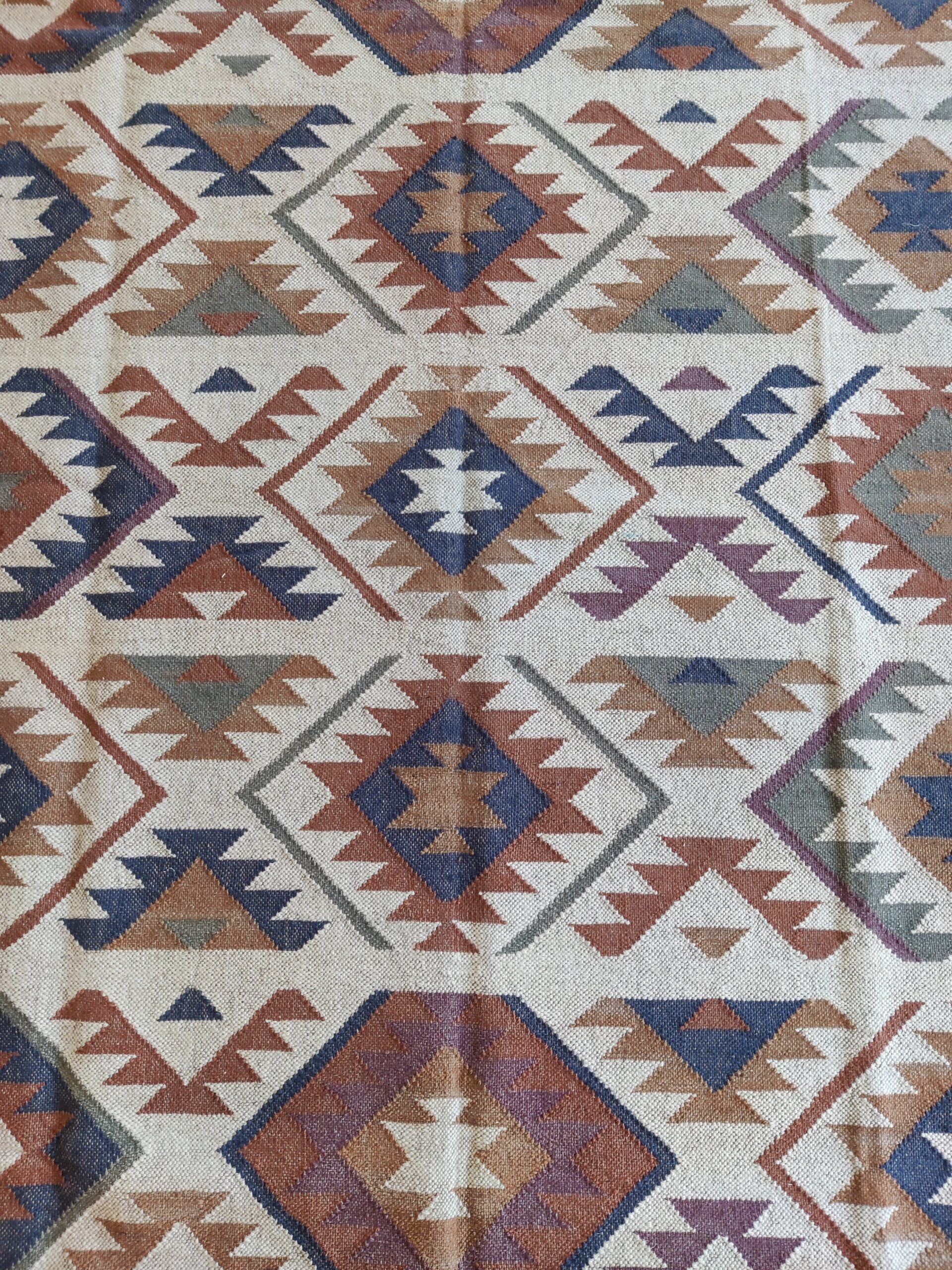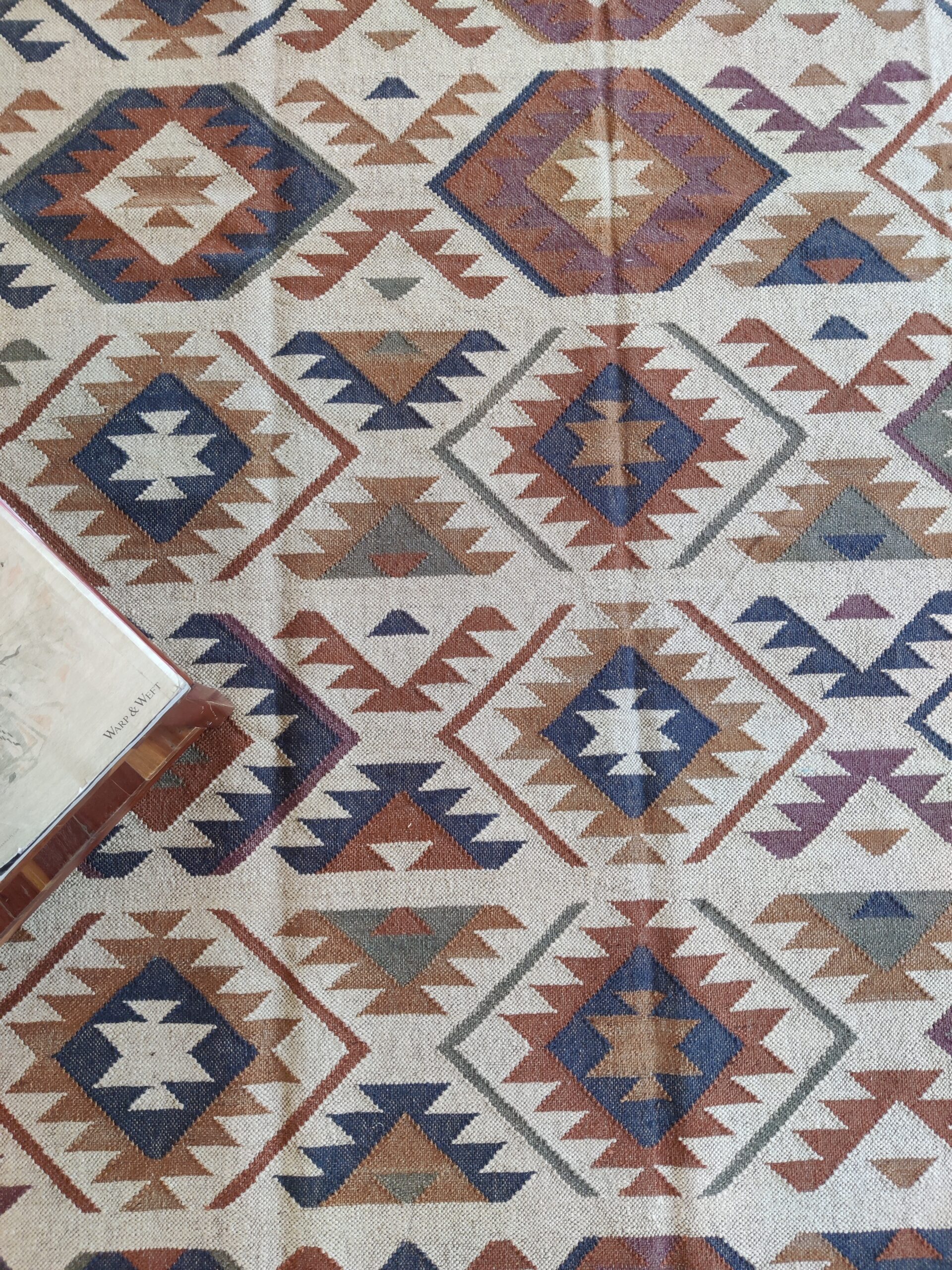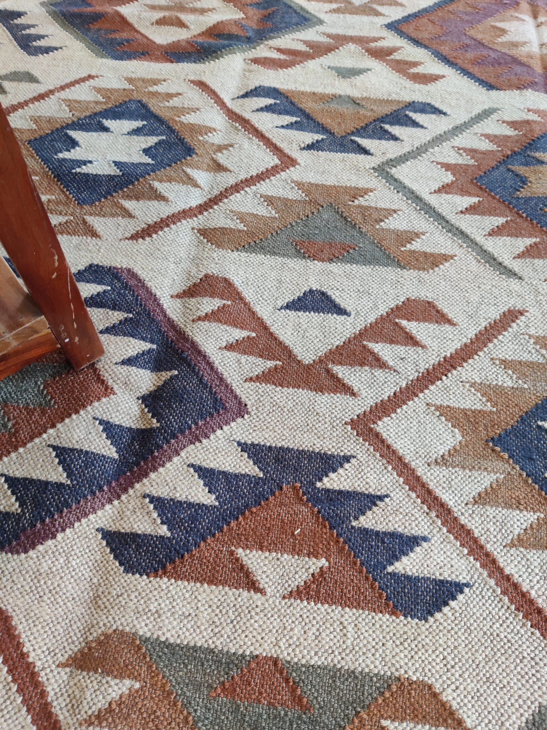 The Geometric design of a rust-color weaves its way seamlessly into any space from coastal dining to urban sleeping. Jute kilim dhurrie construction.