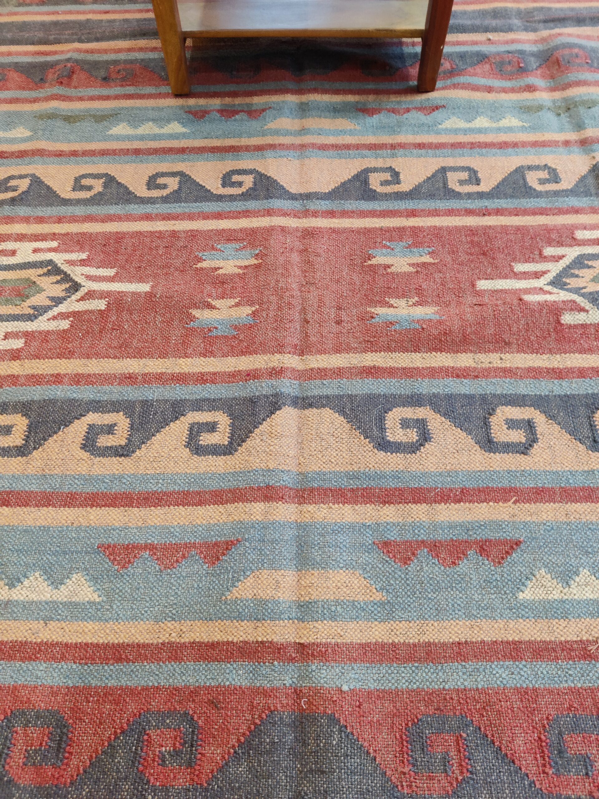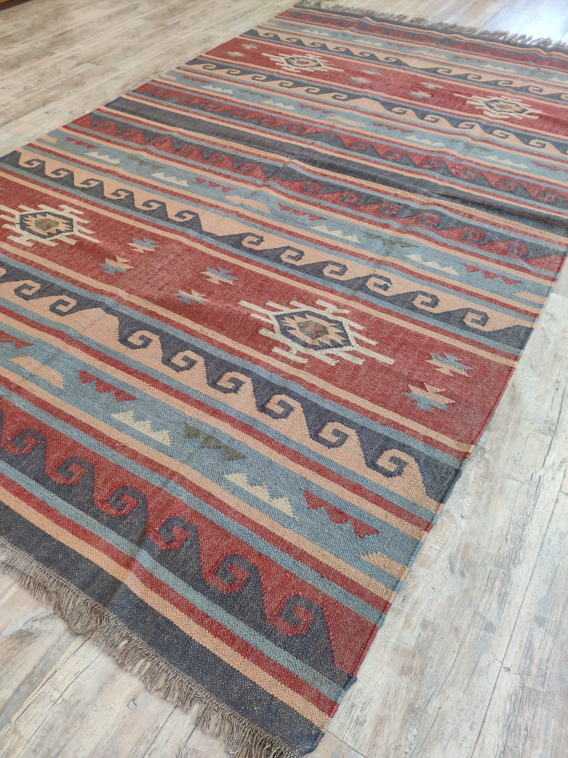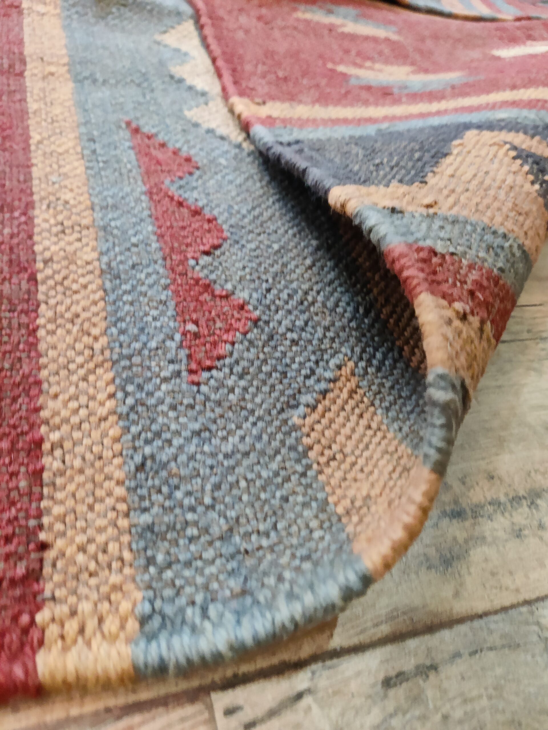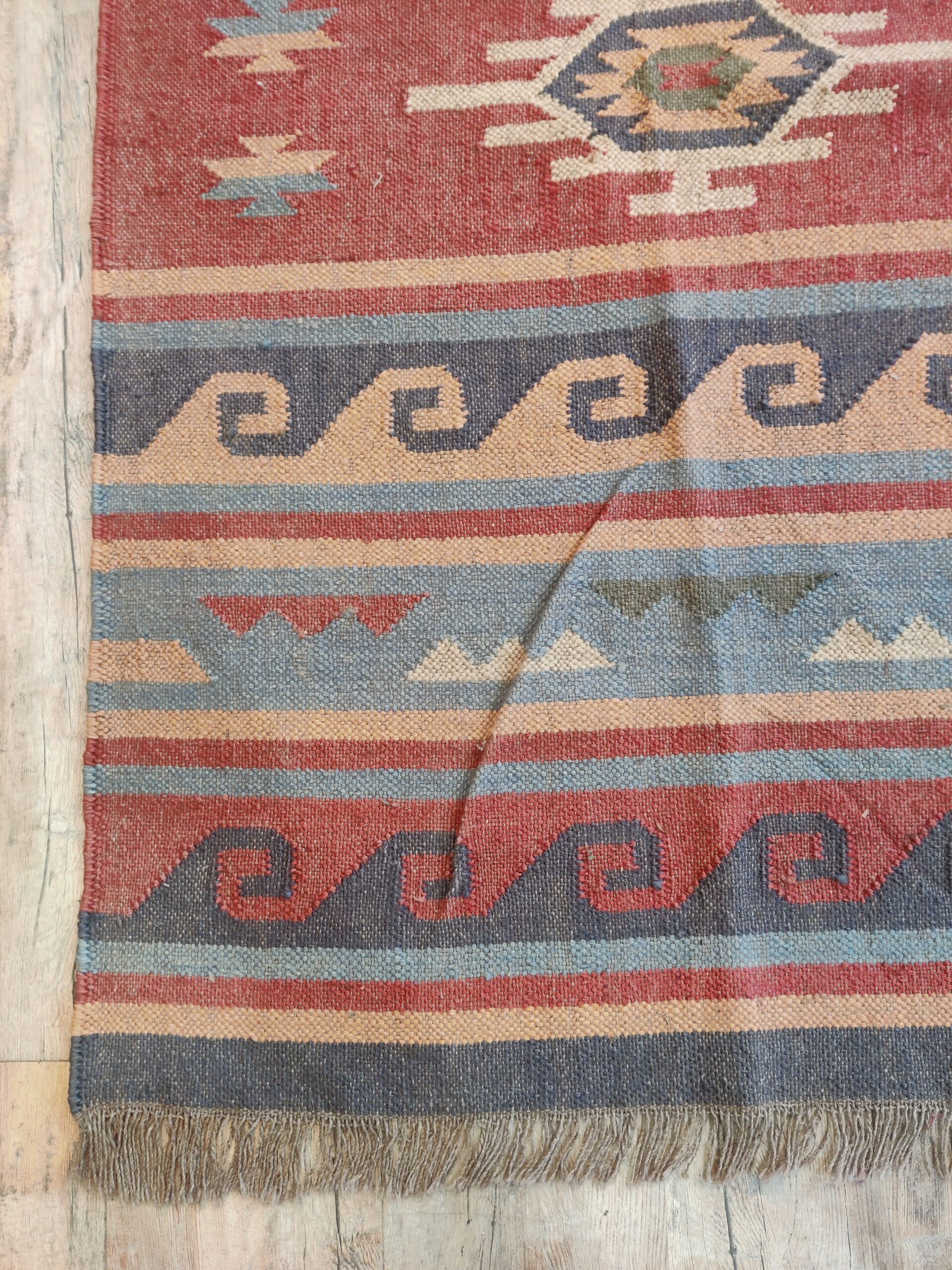 The Geometric design of a rust-color weaves its way seamlessly into any space from coastal dining to urban sleeping. Jute kilim dhurrie construction.