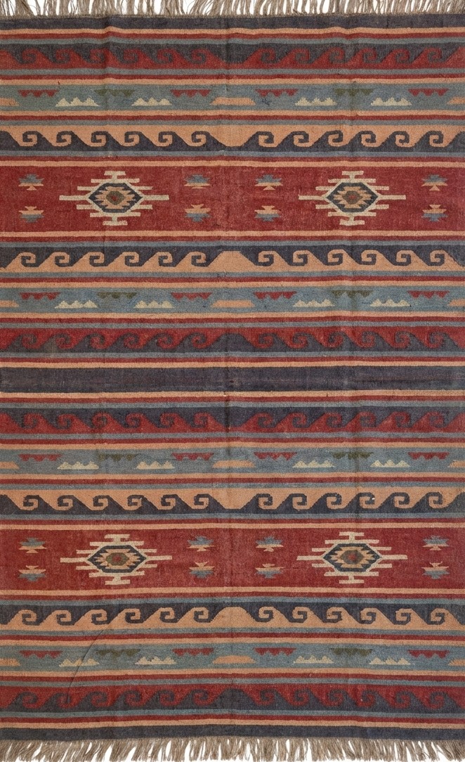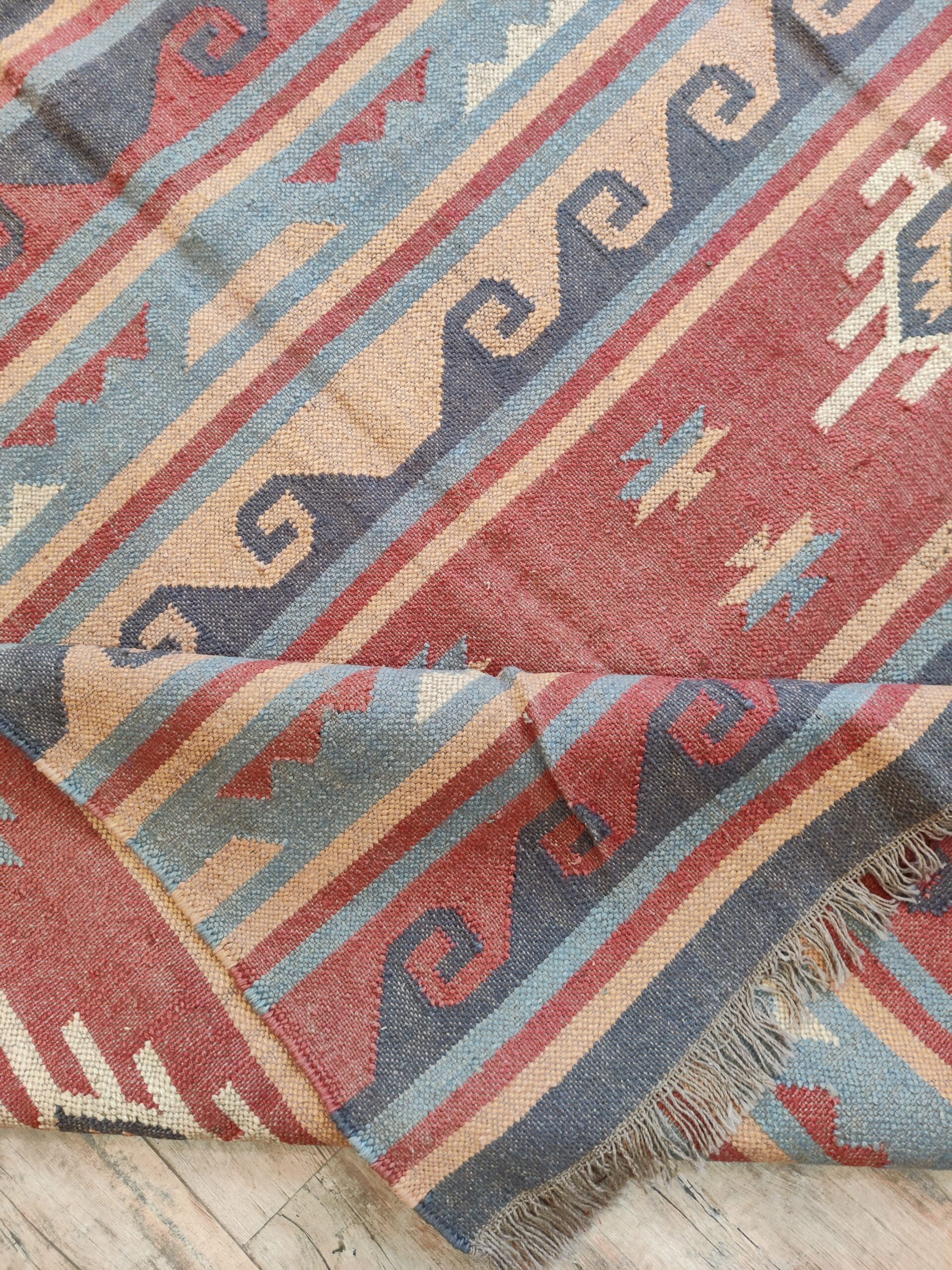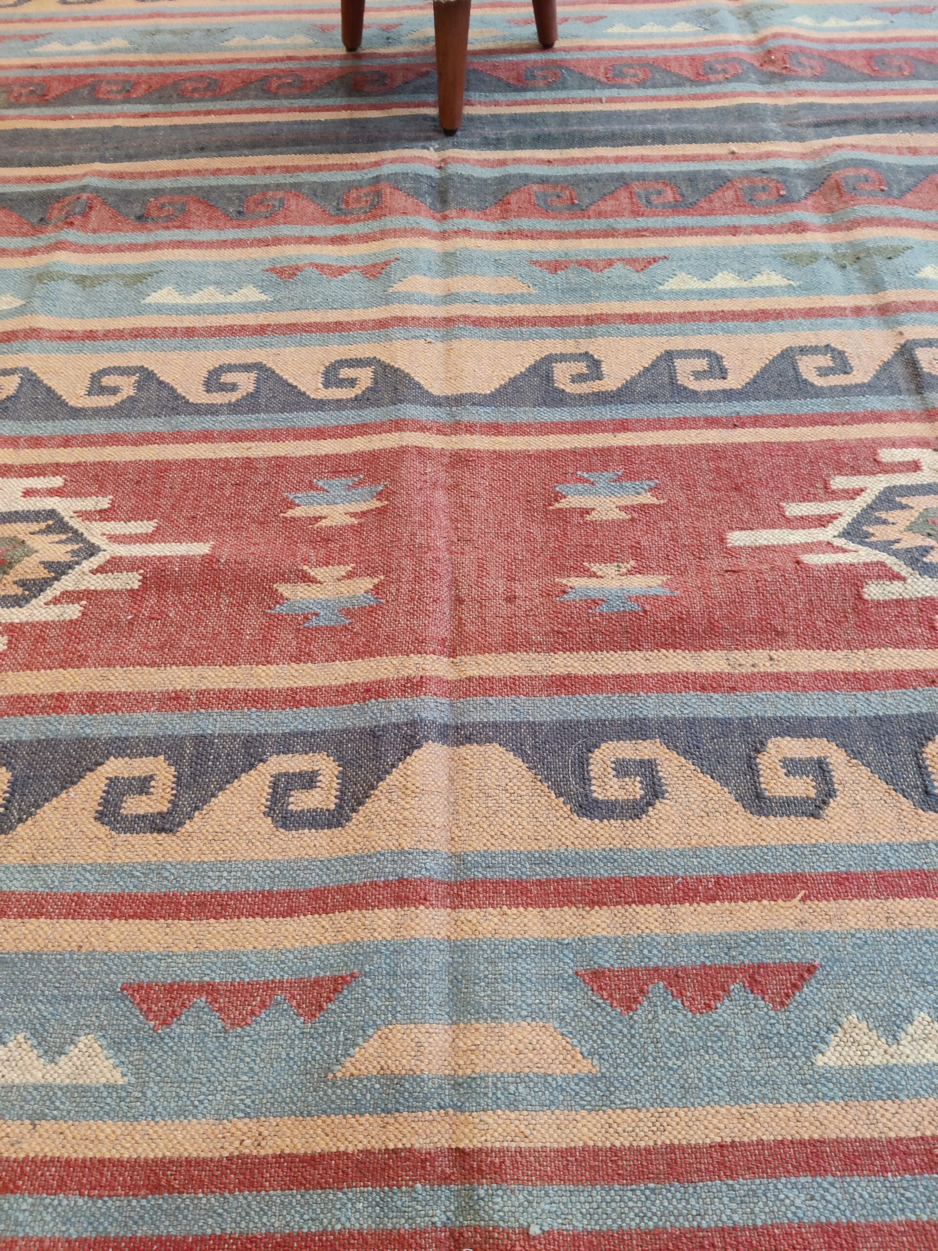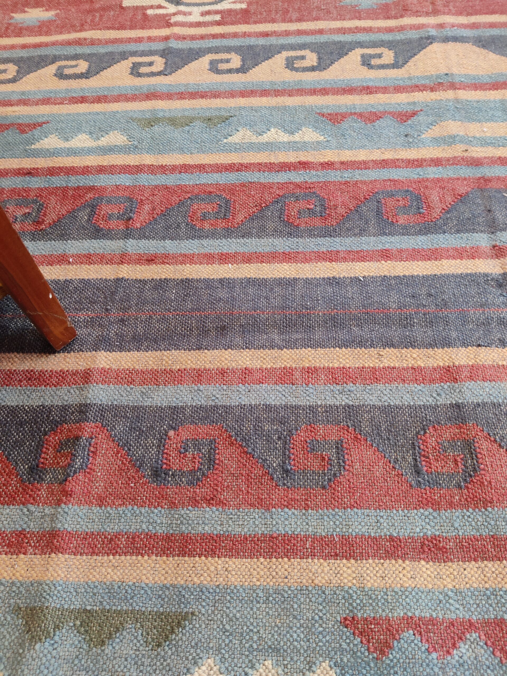 The Geometric design of a rust-color weaves its way seamlessly into any space from coastal dining to urban sleeping. Jute kilim dhurrie construction.