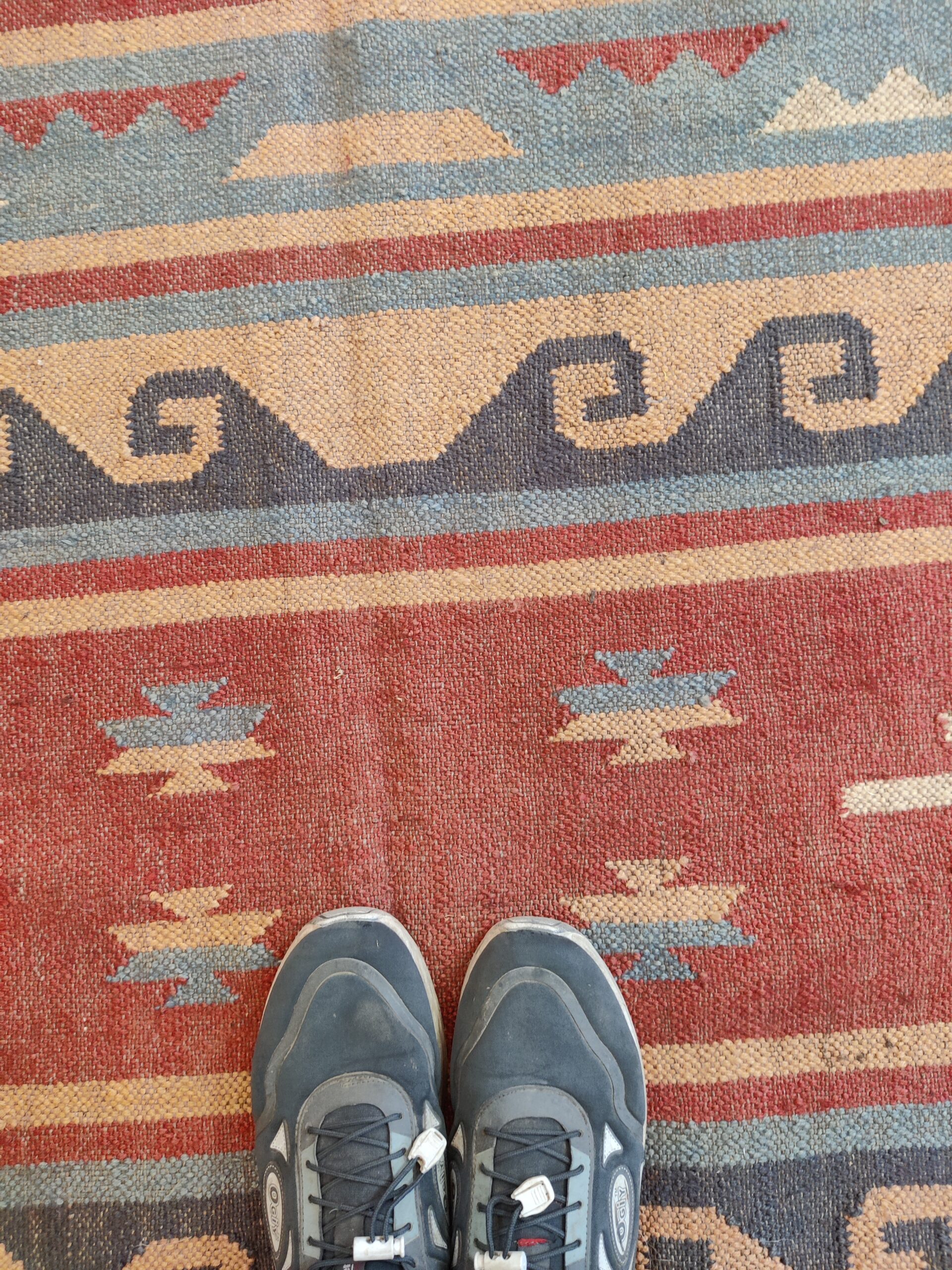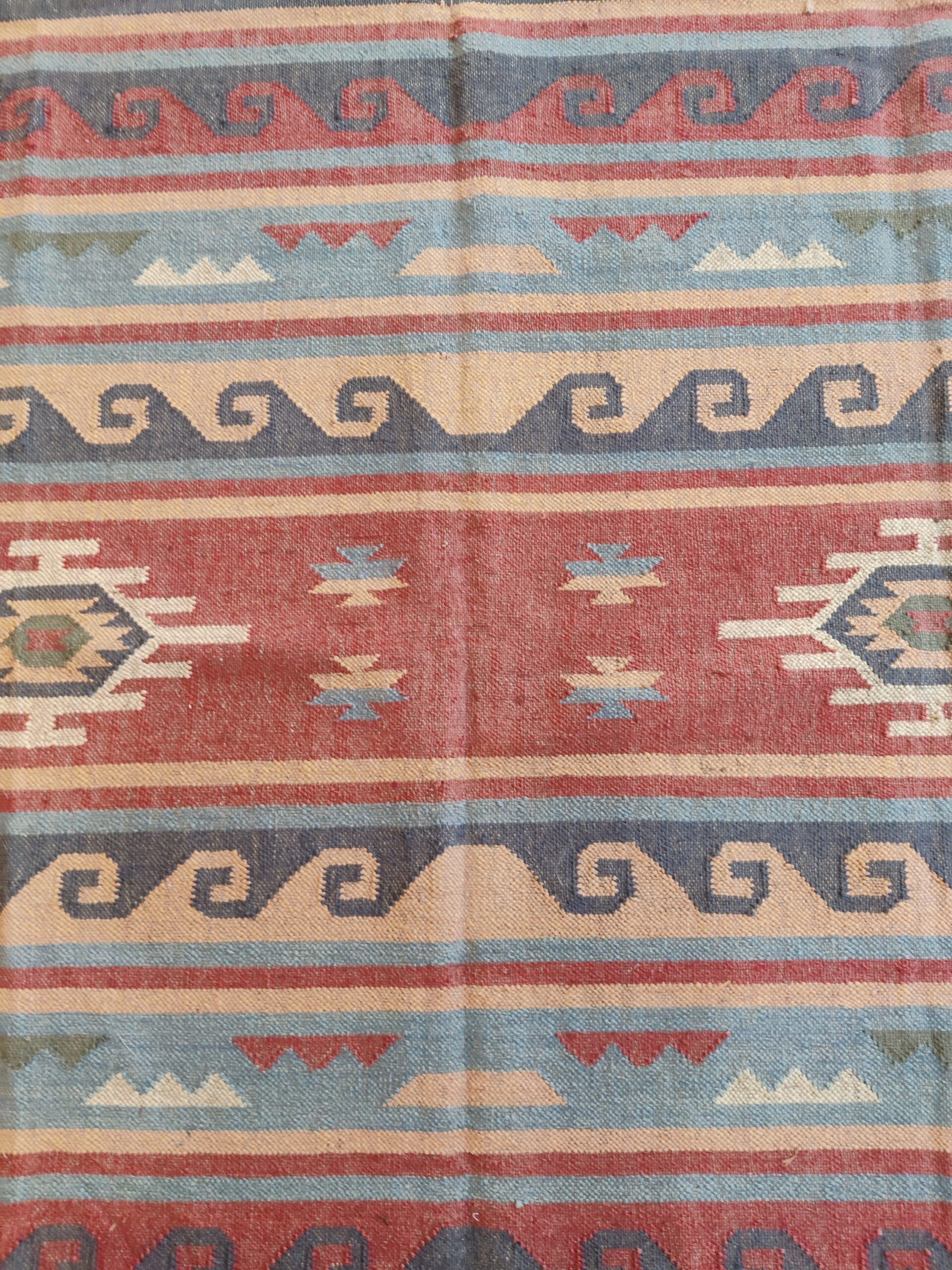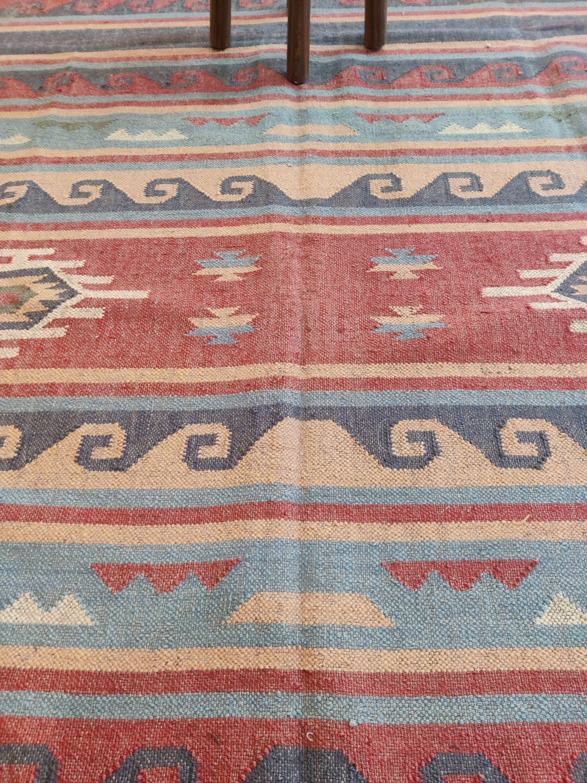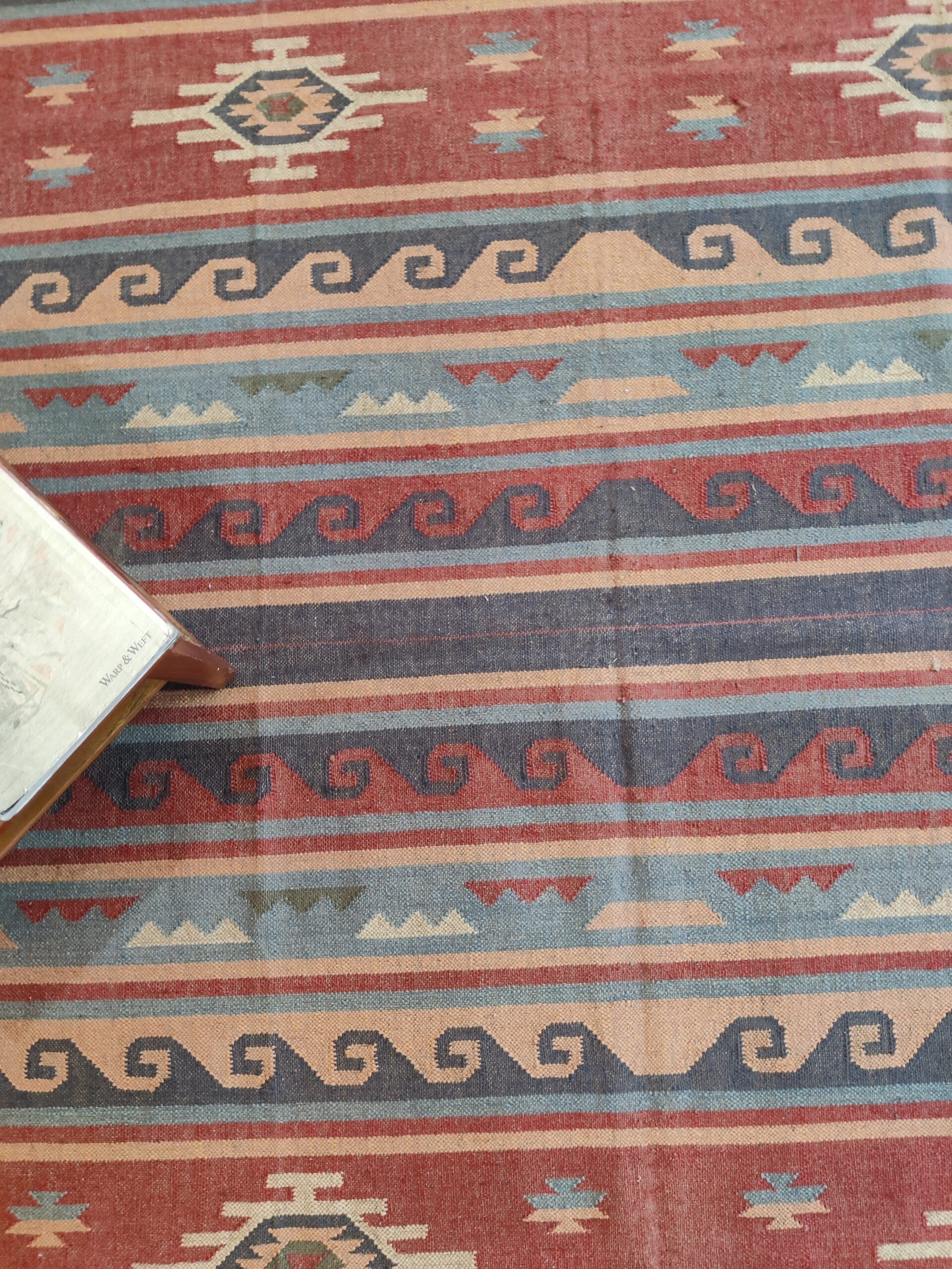 The Geometric design of a rust-color weaves its way seamlessly into any space from coastal dining to urban sleeping. Jute kilim dhurrie construction.